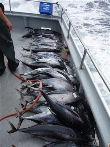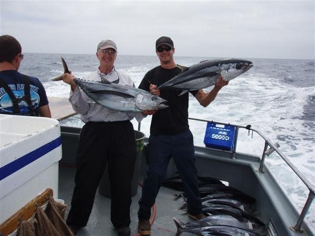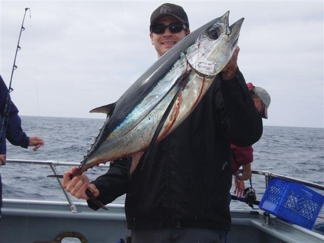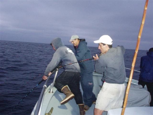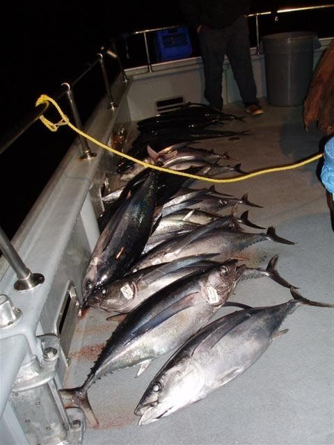 Trip #5: Boat: Thunderbird 2.5 day Departs: Tuesday August 19th Fishing: August 20th, 21th Returns: August 22th am Thunderbird Crew: Jeff Markland- Captain Steve Raby- 2nd Captain Jose, Jared & Nate on deck Goofy in his usual form in the Galley The usual suspects, newer club members and a slew of guests began gathering for the upcoming 2.5-day venture on board the Thunderbird on Tuesday afternoon/evening, a lot of discussion occurred around where will we fish, what is our bait, are we going to fish for tuna, and more importantly, the weather. Forecast was for pretty breezy on the outer banks and tuna grounds with somewhat better at the island. Thursday weather looked much improved everywhere. As it turned out, the weather turned out nice the first day, and even nicer the second day. Also the good news was we would have sardines for bait. When the boat returned from the fuel dock around 7:30, I wandered down to the boat and sat with Jeff and discussed our “options”. There was about 2 scoops of live squid on the boat and the squid at San Clemente Island was available but by jigging. Also, the yellowtail fishing was hit or miss at best early in the cove, and then really nothing to catch the rest of the day unless the bass decided to bite. The tuna grounds were in range to do some night fishing between the days, and daytime fishing was producing smaller fish. The Tanner Bank had the 10-15 lb variety which was spotty, and inside toward SCI were bigger 30-35lb variety with some larger mixed in. Getting bites though would be hard. The Cortez Bank coughed up 100 yellowtail for Jeff a few days before. There was also some white sea bass caught at San Nicholas Island so that was an option. Soooo, one more time, what to do. Jeff decided he will decide when we leave the bait receiver as I said give it your best shot. The final decision, with the weather forecast improving, we would head to the Cortez Bank since there had been some yellowtail there a few days before. And off we went. Travel out was not too bad. Day 1- Arrived at the Cortez Bank around 7:45 am, fished a couple areas for nothing except some of the jumbo bonito, large mackerel and a few bottom dwellers. There was no sign of yellowtail. Where the F**k did they go? Around 10:00am, Jeff pulled the plug and we headed back inside to the tuna grounds, about 30 miles away. Weather was getting much nicer, We ended up picking at the BFT not long after we arrived in the area around 2:00pm and joined “the fleet”. We had one decent plunker drift for 16 BFT, and scratched up 9 more at sundown. As dark fell, we headed into the island to try for the early morning yellowtail fishing at the Lost Point area. Day 1 fish count- 25 BFT, 4 Bonito kept, a few misc bottom dwellers kept JP winner- Bronson Noggle (Cory Steinwand Guest)- 30 plus lb BFT, Patch winner Cory Steinwand- 30 plus lb BFT (it was very close) Day 2- had a few yellowtail bites in the dark and grey light at Lost Point, all nice fish. Headed out after grey light for yesterday’s tuna grounds. Flat calm weather. Worked the area with “the fleet” for a couple of hours and covering a lot of water. Jeff finally pulled the plug and decided to take a gamble and head to the Tanner Bank since there were tuna there a few days before. And the gamble certainly paid off. We were greeted with boiling fish in the chum circle when we arrived, boiling fish on the anchor and steady fishing on the 10-15 lb BFT the rest of the afternoon. We fished a couple deep spots for decent reds and other stuff, one nice ling cod and headed back to the area west of SCI toward San Nicholas Island for some night fishing. We had several stops on spots of fish, and got a few anywhere from 30 plus lbs up to 100lbs. Around midnight, we headed home. We were able to fish that long because by chance, the boat was not scheduled to run a ¾ day trip when we got in, so we got to fish longer. Arrived at the dock around 7:20am, unloaded and that was it. Day 2 fish count- 6 Yellowtail, 40 BFT, 1 Halibut, 2 Barracuda, 100 plus mixed Reds and Rockfish, 1 Ling Cod JP & Patch winner- Cory Steinwand- 102 lb BFT Trip total- 65 BFT, 6 Yellowtail, 1 Halibut, 4 Bonito, 100 plus mixed Reds/Rockfish, 1 Ling Cod The weather for the entire trip was good. Temperature cool both days but very nice. Very little wind to flat calm the entire 2 days. One thing that was troubling was the amount of casualties on these smaller tuna. Seems like most everyone liberated one or two, or more. (We won’t mention my luck!). Small hooks and light line with too much pressure and these little guys were hot! All in all a good time had by all and a very good group of guests on this trip as well. That’s it! Your Scribe- Gary Thompson
