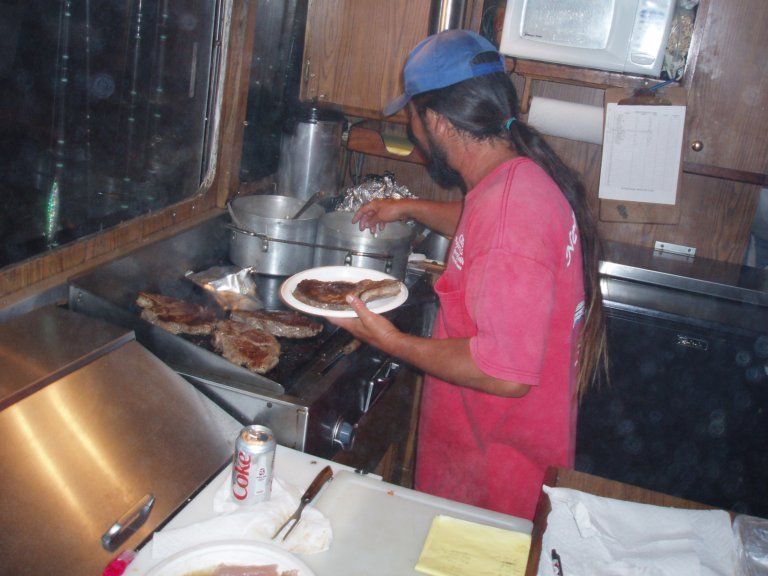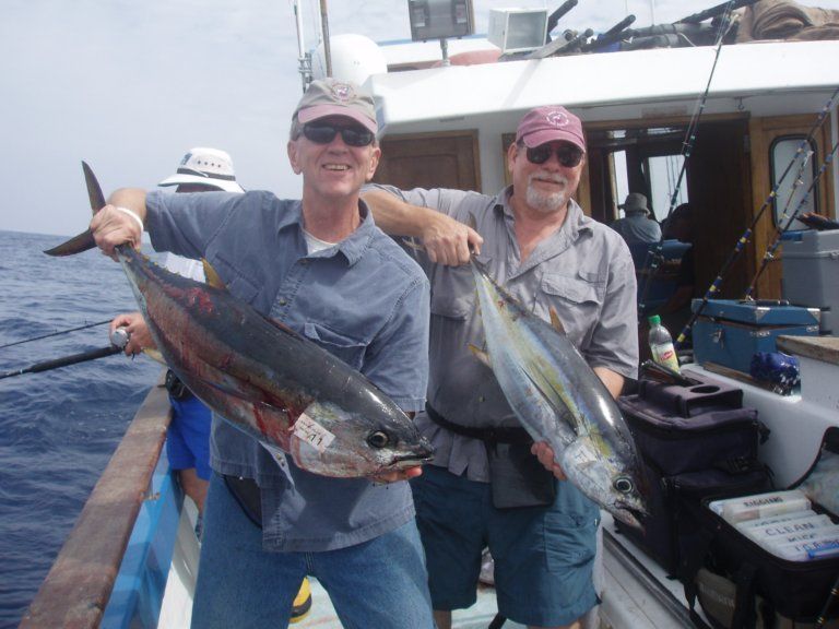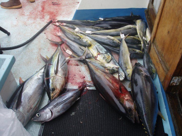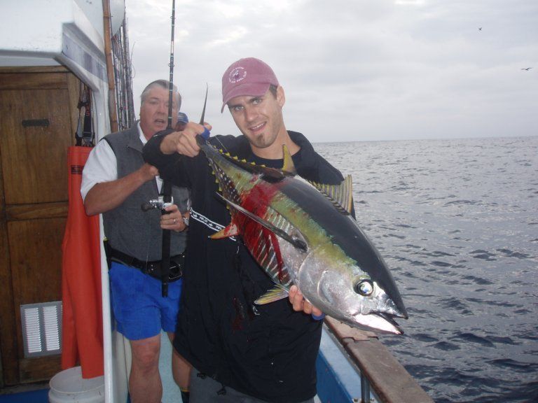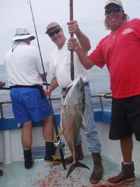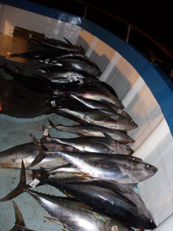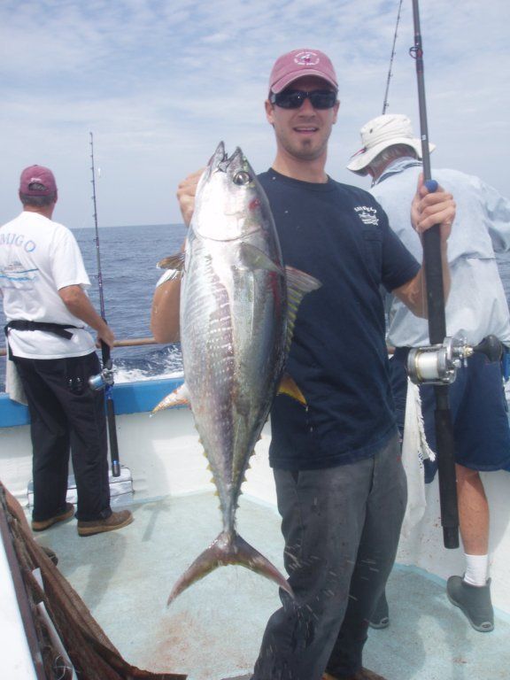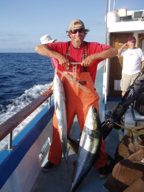Trip #5: Boat: Thunderbird 2.5 day Departs: Tuesday August 19th Fishing: August 20th, 21th Returns: August 22th am Thunderbird Crew: Jeff Markland- Captain Steve Raby- 2nd Captain Jose, Jared & Nate on deck Goofy in his usual form in the Galley The usual suspects, newer club members and a slew of guests began gathering for the upcoming 2.5-day venture on board the Thunderbird on Tuesday afternoon/evening, a lot of discussion occurred around where will we fish, what is our bait, are we going to fish for tuna, and more importantly, the weather. Forecast was for pretty breezy on the outer banks and tuna grounds with somewhat better at the island. Thursday weather looked much improved everywhere. As it turned out, the weather turned out nice the first day, and even nicer the second day. Also the good news was we would have sardines for bait. When the boat returned from the fuel dock around 7:30, I wandered down to the boat and sat with Jeff and discussed our “options”. There was about 2 scoops of live squid on the boat and the squid at San Clemente Island was available but by jigging. Also, the yellowtail fishing was hit or miss at best early in the cove, and then really nothing to catch the rest of the day unless the bass decided to bite. The tuna grounds were in range to do some night fishing between the days, and daytime fishing was producing smaller fish. The Tanner Bank had the 10-15 lb variety which was spotty, and inside toward SCI were bigger 30-35lb variety with some larger mixed in. Getting bites though would be hard. The Cortez Bank coughed up 100 yellowtail for Jeff a few days before. There was also some white sea bass caught at San Nicholas Island so that was an option. Soooo, one more time, what to do. Jeff decided he will decide when we leave the bait receiver as I said give it your best shot. The final decision, with the weather forecast improving, we would head to the Cortez Bank since there had been some yellowtail there a few days before. And off we went. Travel out was not too bad. Day 1- Arrived at the Cortez Bank around 7:45 am, fished a couple areas for nothing except some of the jumbo bonito, large mackerel and a few bottom dwellers. There was no sign of yellowtail. Where the F**k did they go? Around 10:00am, Jeff pulled the plug and we headed back inside to the tuna grounds, about 30 miles away. Weather was getting much nicer, We ended up picking at the BFT not long after we arrived in the area around 2:00pm and joined “the fleet”. We had one decent plunker drift for 16 BFT, and scratched up 9 more at sundown. As dark fell, we headed into the island to try for the early morning yellowtail fishing at the Lost Point area. Day 1 fish count- 25 BFT, 4 Bonito kept, a few misc bottom dwellers kept JP winner- Bronson Noggle (Cory Steinwand Guest)- 30 plus lb BFT, Patch winner Cory Steinwand- 30 plus lb BFT (it was very close) Day 2- had a few yellowtail bites in the dark and grey light at Lost Point, all nice fish. Headed out after grey light for yesterday’s tuna grounds. Flat calm weather. Worked the area with “the fleet” for a couple of hours and covering a lot of water. Jeff finally pulled the plug and decided to take a gamble and head to the Tanner Bank since there were tuna there a few days before. And the gamble certainly paid off. We were greeted with boiling fish in the chum circle when we arrived, boiling fish on the anchor and steady fishing on the 10-15 lb BFT the rest of the afternoon. We fished a couple deep spots for decent reds and other stuff, one nice ling cod and headed back to the area west of SCI toward San Nicholas Island for some night fishing. We had several stops on spots of fish, and got a few anywhere from 30 plus lbs up to 100lbs. Around midnight, we headed home. We were able to fish that long because by chance, the boat was not scheduled to run a ¾ day trip when we got in, so we got to fish longer. Arrived at the dock around 7:20am, unloaded and that was it. Day 2 fish count- 6 Yellowtail, 40 BFT, 1 Halibut, 2 Barracuda, 100 plus mixed Reds and Rockfish, 1 Ling Cod JP & Patch winner- Cory Steinwand- 102 lb BFT Trip total- 65 BFT, 6 Yellowtail, 1 Halibut, 4 Bonito, 100 plus mixed Reds/Rockfish, 1 Ling Cod The weather for the entire trip was good. Temperature cool both days but very nice. Very little wind to flat calm the entire 2 days. One thing that was troubling was the amount of casualties on these smaller tuna. Seems like most everyone liberated one or two, or more. (We won’t mention my luck!). Small hooks and light line with too much pressure and these little guys were hot! All in all a good time had by all and a very good group of guests on this trip as well. That’s it! Your Scribe- Gary Thompson