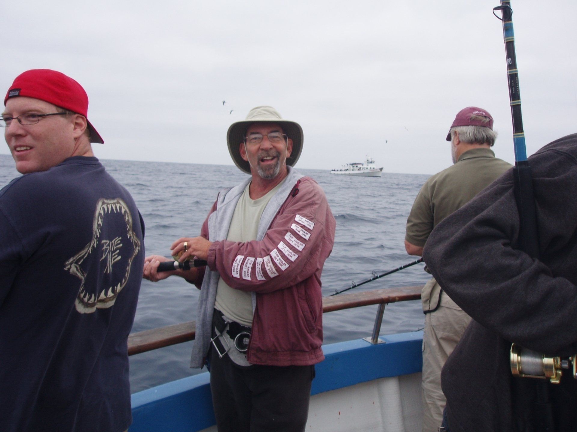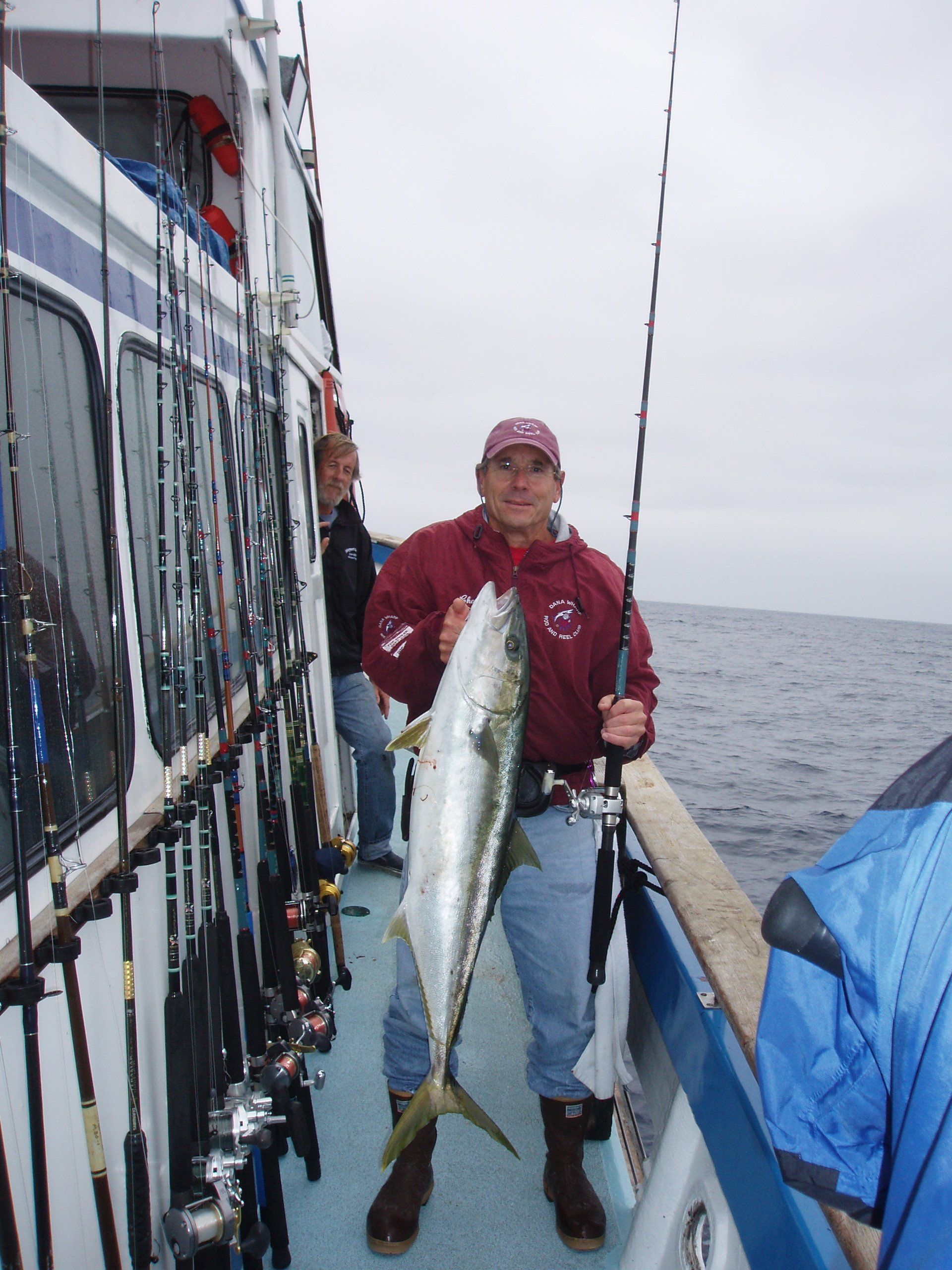 Trip #4: Boat: Thunderbird 2 day Departs: Thursday August 7th Fishing: August 8th, 9th Returns: August 9th pm Trip 4 started as usual with people arriving at Newport Landing at all hours of the day with anticipation of fishing. The preliminary reports from Gary Thompson were all too familiar to what we’ve seen this year. Bait was going to be an issue. And last but not least, was the fish seemed to pop up one day and then disappear the next. Nevertheless, everyone was ready to go. Friday morning saw us anchored at the usual cove off SCI. Weather was OK; fishable, but not a lot of fish. But the ones we caught were quality yellowtail and white sea bass. The sea lions provided ample entertainment …err I mean frustration. We hopped around to a few spots picking up the occasional calico but not much. Day 1 jackpot went to Alex Arthur (Justin Becker’s Guest) with the patch going to Nick Burson for some chunky YT’s Day 2 started much as it did Day 1 but the weather was worse than Day 1. We looked here and there with only 3 yellowtail to show for our efforts. Eventually, the Thunderbird turned towards offshore waters to try our luck at some bluefin. Unfortunately, the fish didn’t get the memo and we saw neither sign or had any bites. Mr, “Hey that’s my fish” Tom Hill was the lucky jackpot and patch winner for Day 2 with a 15# YT. So, there you have it, not a, “Hey you missed a great trip” kind ‘a trip but per usual, the members of our club all seemed to enjoy doing what we do. It’s not always about the fish; it’s about the people and the experience. LOL! Who am I kidding…we all want more fish. Until next time, step to the right/left and take up your slack.