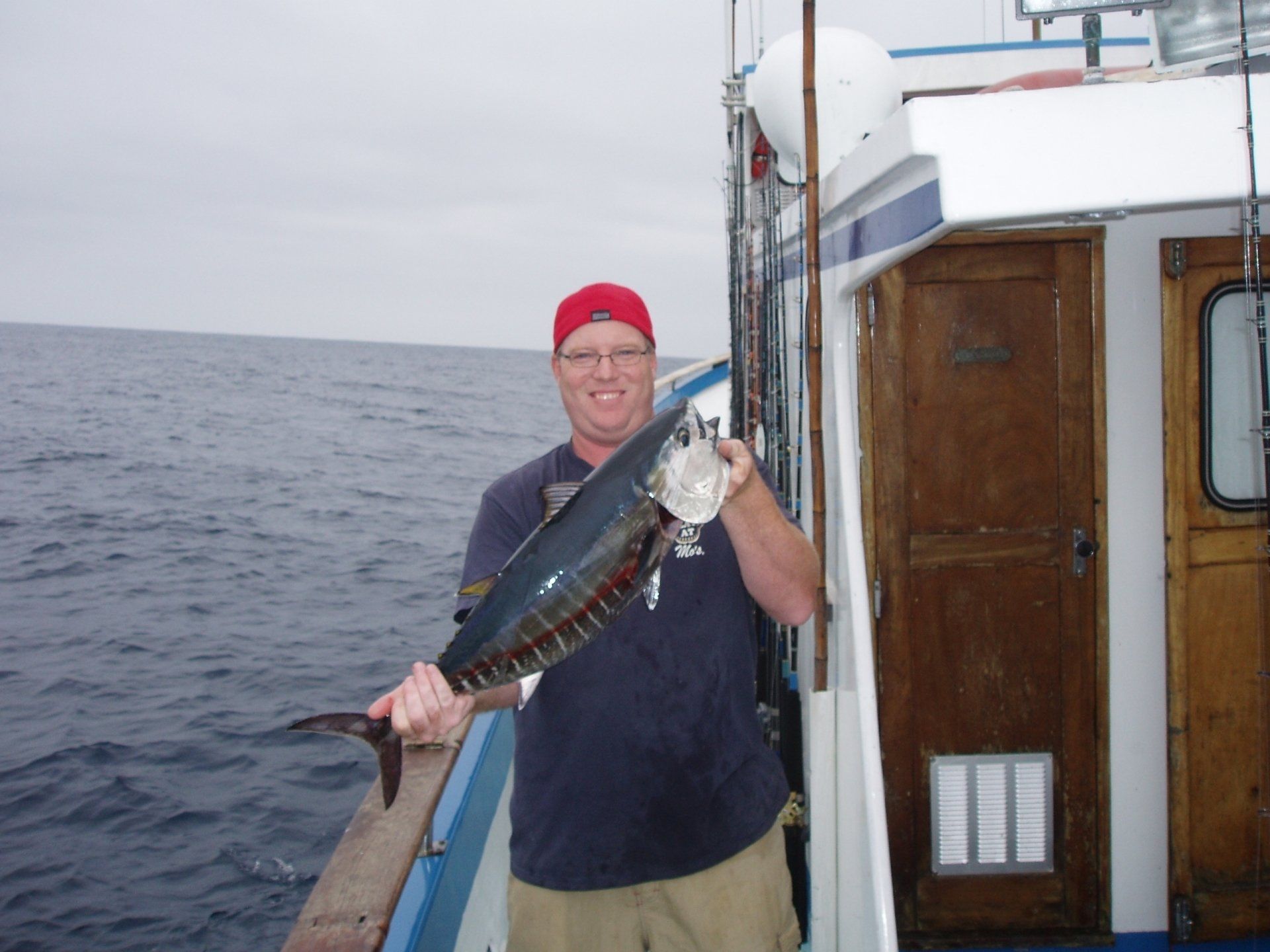 Trip #5: Boat: Thunderbird 2.5 day Departs: Tuesday August 19th Fishing: August 20th, 21th Returns: August 22th am Thunderbird Crew: Jeff Markland- Captain Steve Raby- 2nd Captain Jose, Jared & Nate on deck Goofy in his usual form in the Galley The usual suspects, newer club members and a slew of guests began gathering for the upcoming 2.5-day venture on board the Thunderbird on Tuesday afternoon/evening, a lot of discussion occurred around where will we fish, what is our bait, are we going to fish for tuna, and more importantly, the weather. Forecast was for pretty breezy on the outer banks and tuna grounds with somewhat better at the island. Thursday weather looked much improved everywhere. As it turned out, the weather turned out nice the first day, and even nicer the second day. Also the good news was we would have sardines for bait. When the boat returned from the fuel dock around 7:30, I wandered down to the boat and sat with Jeff and discussed our “options”. There was about 2 scoops of live squid on the boat and the squid at San Clemente Island was available but by jigging. Also, the yellowtail fishing was hit or miss at best early in the cove, and then really nothing to catch the rest of the day unless the bass decided to bite. The tuna grounds were in range to do some night fishing between the days, and daytime fishing was producing smaller fish. The Tanner Bank had the 10-15 lb variety which was spotty, and inside toward SCI were bigger 30-35lb variety with some larger mixed in. Getting bites though would be hard. The Cortez Bank coughed up 100 yellowtail for Jeff a few days before. There was also some white sea bass caught at San Nicholas Island so that was an option. Soooo, one more time, what to do. Jeff decided he will decide when we leave the bait receiver as I said give it your best shot. The final decision, with the weather forecast improving, we would head to the Cortez Bank since there had been some yellowtail there a few days before. And off we went. Travel out was not too bad. Day 1- Arrived at the Cortez Bank around 7:45 am, fished a couple areas for nothing except some of the jumbo bonito, large mackerel and a few bottom dwellers. There was no sign of yellowtail. Where the F**k did they go? Around 10:00am, Jeff pulled the plug and we headed back inside to the tuna grounds, about 30 miles away. Weather was getting much nicer, We ended up picking at the BFT not long after we arrived in the area around 2:00pm and joined “the fleet”. We had one decent plunker drift for 16 BFT, and scratched up 9 more at sundown. As dark fell, we headed into the island to try for the early morning yellowtail fishing at the Lost Point area. Day 1 fish count- 25 BFT, 4 Bonito kept, a few misc bottom dwellers kept JP winner- Bronson Noggle (Cory Steinwand Guest)- 30 plus lb BFT, Patch winner Cory Steinwand- 30 plus lb BFT (it was very close) Day 2- had a few yellowtail bites in the dark and grey light at Lost Point, all nice fish. Headed out after grey light for yesterday’s tuna grounds. Flat calm weather. Worked the area with “the fleet” for a couple of hours and covering a lot of water. Jeff finally pulled the plug and decided to take a gamble and head to the Tanner Bank since there were tuna there a few days before. And the gamble certainly paid off. We were greeted with boiling fish in the chum circle when we arrived, boiling fish on the anchor and steady fishing on the 10-15 lb BFT the rest of the afternoon. We fished a couple deep spots for decent reds and other stuff, one nice ling cod and headed back to the area west of SCI toward San Nicholas Island for some night fishing. We had several stops on spots of fish, and got a few anywhere from 30 plus lbs up to 100lbs. Around midnight, we headed home. We were able to fish that long because by chance, the boat was not scheduled to run a ¾ day trip when we got in, so we got to fish longer. Arrived at the dock around 7:20am, unloaded and that was it. Day 2 fish count- 6 Yellowtail, 40 BFT, 1 Halibut, 2 Barracuda, 100 plus mixed Reds and Rockfish, 1 Ling Cod JP & Patch winner- Cory Steinwand- 102 lb BFT Trip total- 65 BFT, 6 Yellowtail, 1 Halibut, 4 Bonito, 100 plus mixed Reds/Rockfish, 1 Ling Cod The weather for the entire trip was good. Temperature cool both days but very nice. Very little wind to flat calm the entire 2 days. One thing that was troubling was the amount of casualties on these smaller tuna. Seems like most everyone liberated one or two, or more. (We won’t mention my luck!). Small hooks and light line with too much pressure and these little guys were hot! All in all a good time had by all and a very good group of guests on this trip as well. That’s it! Your Scribe- Gary Thompson