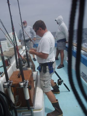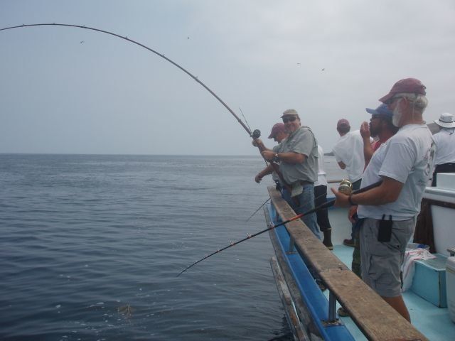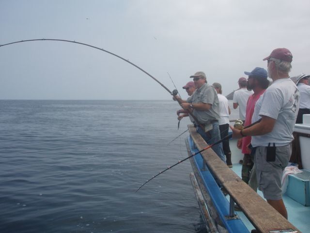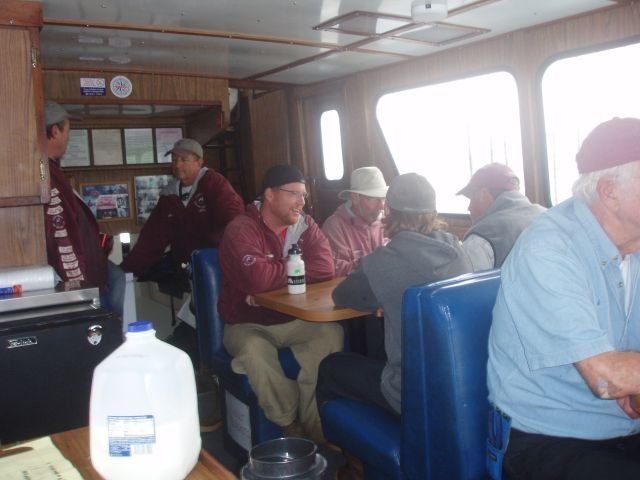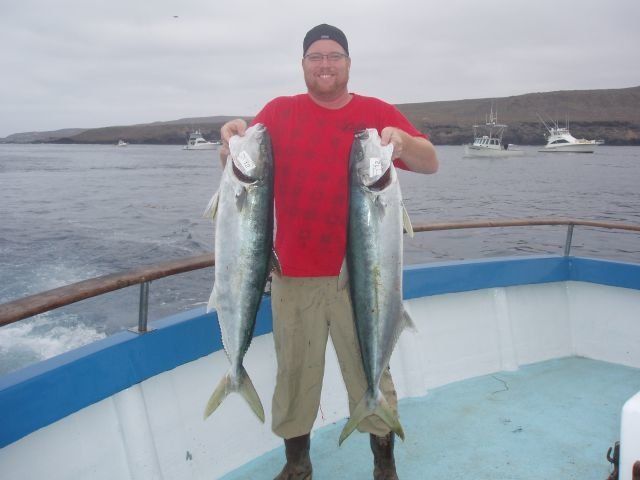 Trip #5: Boat: Thunderbird 2.5 day Departs: Tuesday August 19th Fishing: August 20th, 21th Returns: August 22th am Thunderbird Crew: Jeff Markland- Captain Steve Raby- 2nd Captain Jose, Jared & Nate on deck Goofy in his usual form in the Galley The usual suspects, newer club members and a slew of guests began gathering for the upcoming 2.5-day venture on board the Thunderbird on Tuesday afternoon/evening, a lot of discussion occurred around where will we fish, what is our bait, are we going to fish for tuna, and more importantly, the weather. Forecast was for pretty breezy on the outer banks and tuna grounds with somewhat better at the island. Thursday weather looked much improved everywhere. As it turned out, the weather turned out nice the first day, and even nicer the second day. Also the good news was we would have sardines for bait. When the boat returned from the fuel dock around 7:30, I wandered down to the boat and sat with Jeff and discussed our “options”. There was about 2 scoops of live squid on the boat and the squid at San Clemente Island was available but by jigging. Also, the yellowtail fishing was hit or miss at best early in the cove, and then really nothing to catch the rest of the day unless the bass decided to bite. The tuna grounds were in range to do some night fishing between the days, and daytime fishing was producing smaller fish. The Tanner Bank had the 10-15 lb variety which was spotty, and inside toward SCI were bigger 30-35lb variety with some larger mixed in. Getting bites though would be hard. The Cortez Bank coughed up 100 yellowtail for Jeff a few days before. There was also some white sea bass caught at San Nicholas Island so that was an option. Soooo, one more time, what to do. Jeff decided he will decide when we leave the bait receiver as I said give it your best shot. The final decision, with the weather forecast improving, we would head to the Cortez Bank since there had been some yellowtail there a few days before. And off we went. Travel out was not too bad. Day 1- Arrived at the Cortez Bank around 7:45 am, fished a couple areas for nothing except some of the jumbo bonito, large mackerel and a few bottom dwellers. There was no sign of yellowtail. Where the F**k did they go? Around 10:00am, Jeff pulled the plug and we headed back inside to the tuna grounds, about 30 miles away. Weather was getting much nicer, We ended up picking at the BFT not long after we arrived in the area around 2:00pm and joined “the fleet”. We had one decent plunker drift for 16 BFT, and scratched up 9 more at sundown. As dark fell, we headed into the island to try for the early morning yellowtail fishing at the Lost Point area. Day 1 fish count- 25 BFT, 4 Bonito kept, a few misc bottom dwellers kept JP winner- Bronson Noggle (Cory Steinwand Guest)- 30 plus lb BFT, Patch winner Cory Steinwand- 30 plus lb BFT (it was very close) Day 2- had a few yellowtail bites in the dark and grey light at Lost Point, all nice fish. Headed out after grey light for yesterday’s tuna grounds. Flat calm weather. Worked the area with “the fleet” for a couple of hours and covering a lot of water. Jeff finally pulled the plug and decided to take a gamble and head to the Tanner Bank since there were tuna there a few days before. And the gamble certainly paid off. We were greeted with boiling fish in the chum circle when we arrived, boiling fish on the anchor and steady fishing on the 10-15 lb BFT the rest of the afternoon. We fished a couple deep spots for decent reds and other stuff, one nice ling cod and headed back to the area west of SCI toward San Nicholas Island for some night fishing. We had several stops on spots of fish, and got a few anywhere from 30 plus lbs up to 100lbs. Around midnight, we headed home. We were able to fish that long because by chance, the boat was not scheduled to run a ¾ day trip when we got in, so we got to fish longer. Arrived at the dock around 7:20am, unloaded and that was it. Day 2 fish count- 6 Yellowtail, 40 BFT, 1 Halibut, 2 Barracuda, 100 plus mixed Reds and Rockfish, 1 Ling Cod JP & Patch winner- Cory Steinwand- 102 lb BFT Trip total- 65 BFT, 6 Yellowtail, 1 Halibut, 4 Bonito, 100 plus mixed Reds/Rockfish, 1 Ling Cod The weather for the entire trip was good. Temperature cool both days but very nice. Very little wind to flat calm the entire 2 days. One thing that was troubling was the amount of casualties on these smaller tuna. Seems like most everyone liberated one or two, or more. (We won’t mention my luck!). Small hooks and light line with too much pressure and these little guys were hot! All in all a good time had by all and a very good group of guests on this trip as well. That’s it! Your Scribe- Gary Thompson