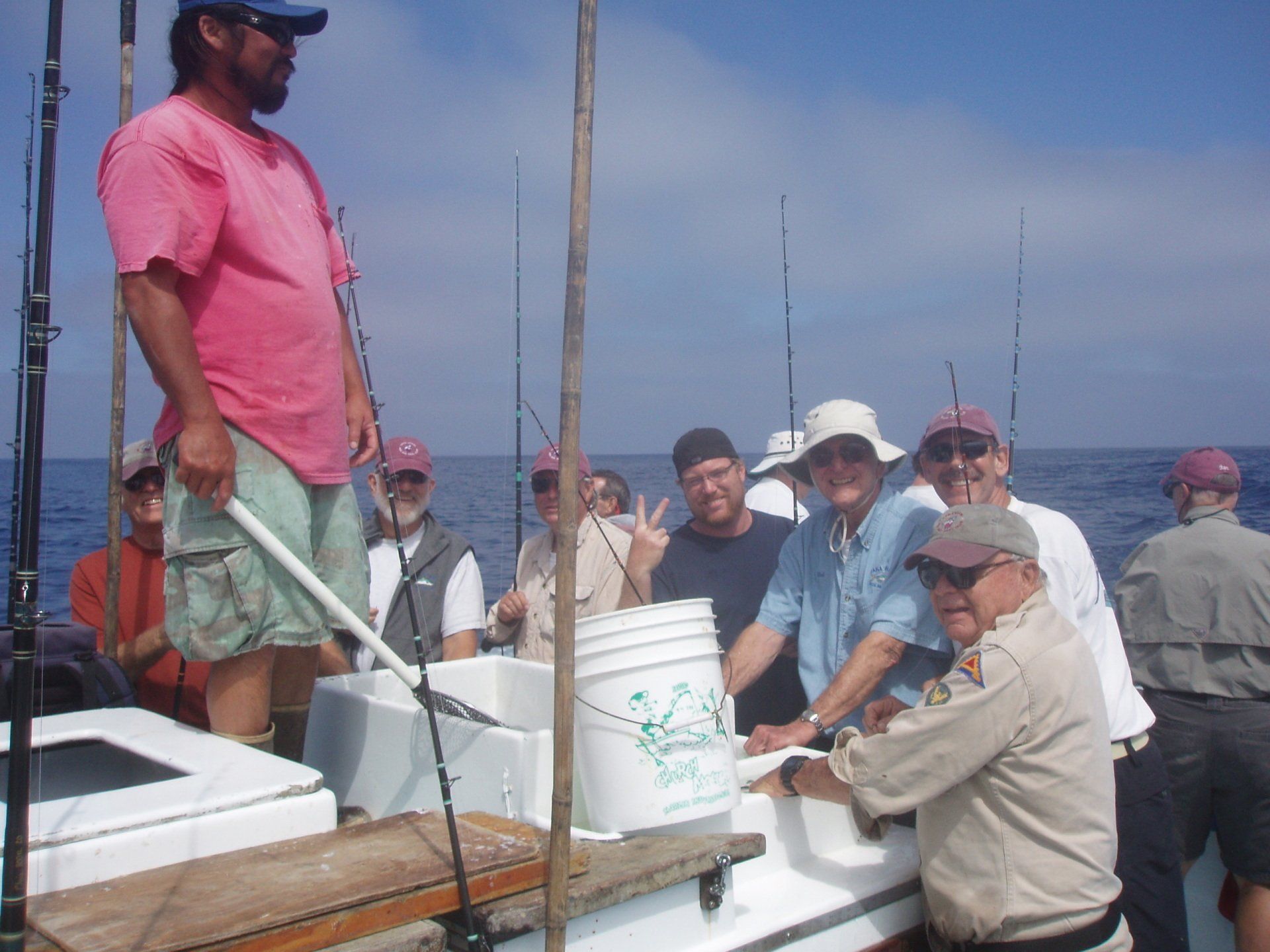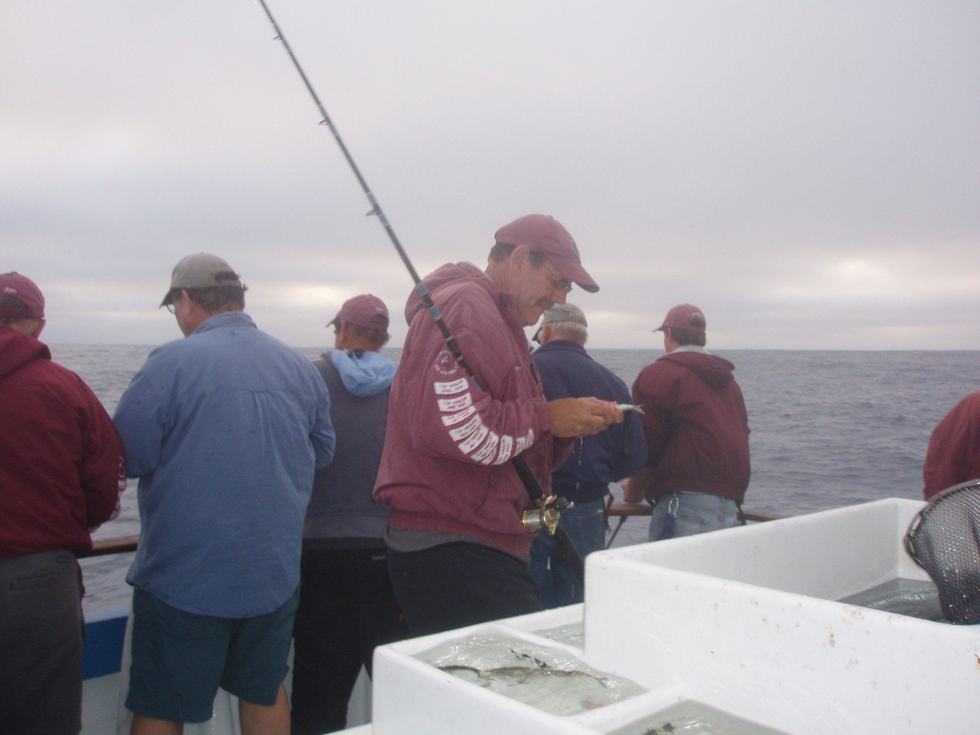Trip #8: Boat: Thunderbird 1.5 day Departs: Thursday, October 2th Fishing: October 3th, 4th Returns: October 4th pm Thunderbird Crew: Capt. Jeff Capt. Chris Jose Nate Goofy Cast of Characters: Bill Parks Steve Morgan Riley Dyer Jim Bertella Justin Becker Jacob Richards Luke Burson Paul Morgan Mike Allen (Scribe) Patrick Thunyakij Bruce Granse Kevon Kong Michael Harris Ryan Burson Oscar Ochoa Ed Chutney Jeff Allen Andrew Ron Shrout Murphy Parks Romeo Ochoa James Harris Ozzie Baktiari Arriving for a trip in the month of October at Newport Landing is a far easier experience then one would have in the summer months of June – September. The dread of driving through the neighborhood in hopes of an empty space large enough to accommodate the larger trucks that many of the club members own seems to dissipate as the offerings are far more plentiful. While the welcomed views of summer also tend to be less abundant, the ensemble of club members arrived with plenty of time to catch-up on some conversations and enjoy a beverage or two.