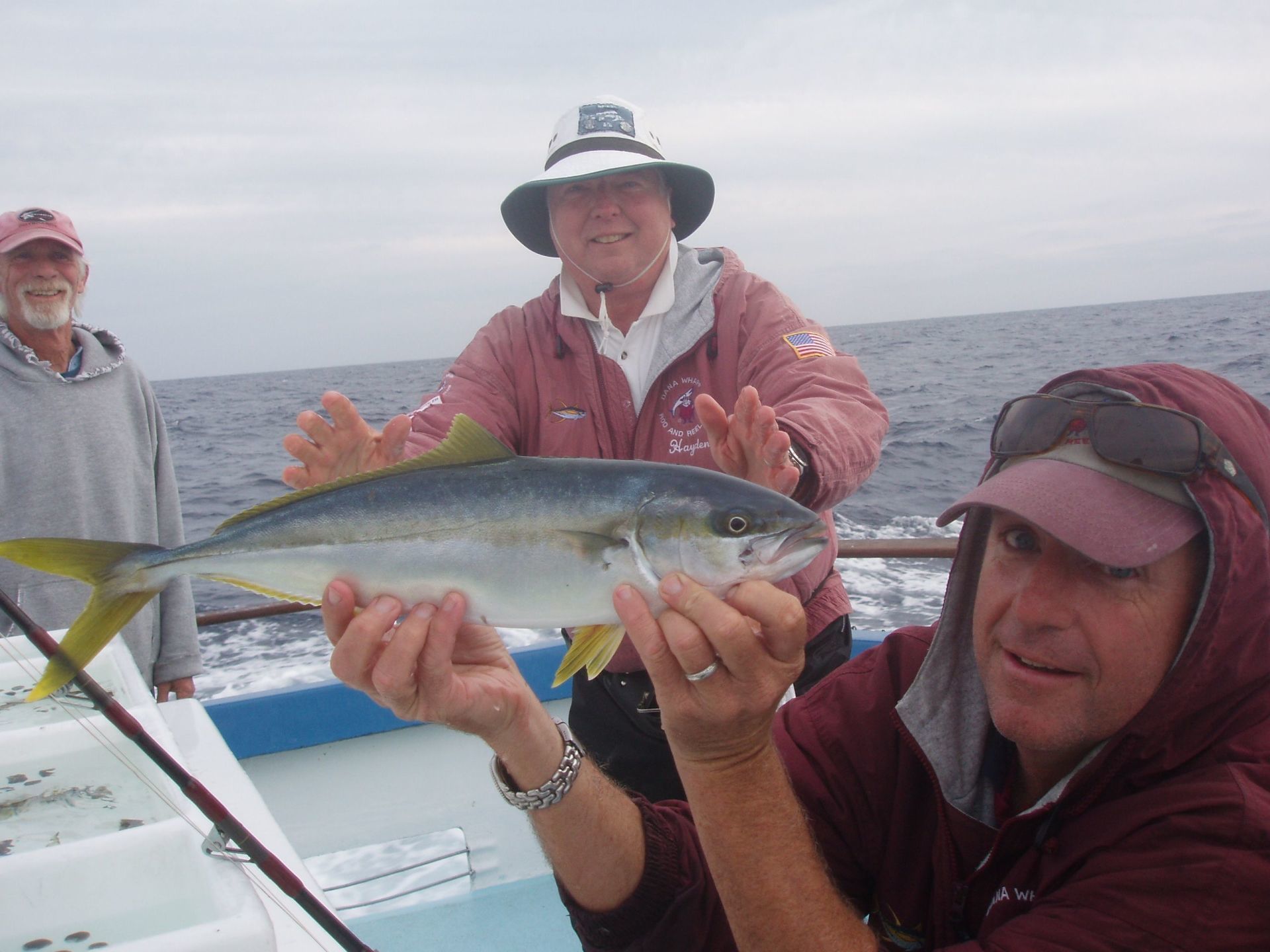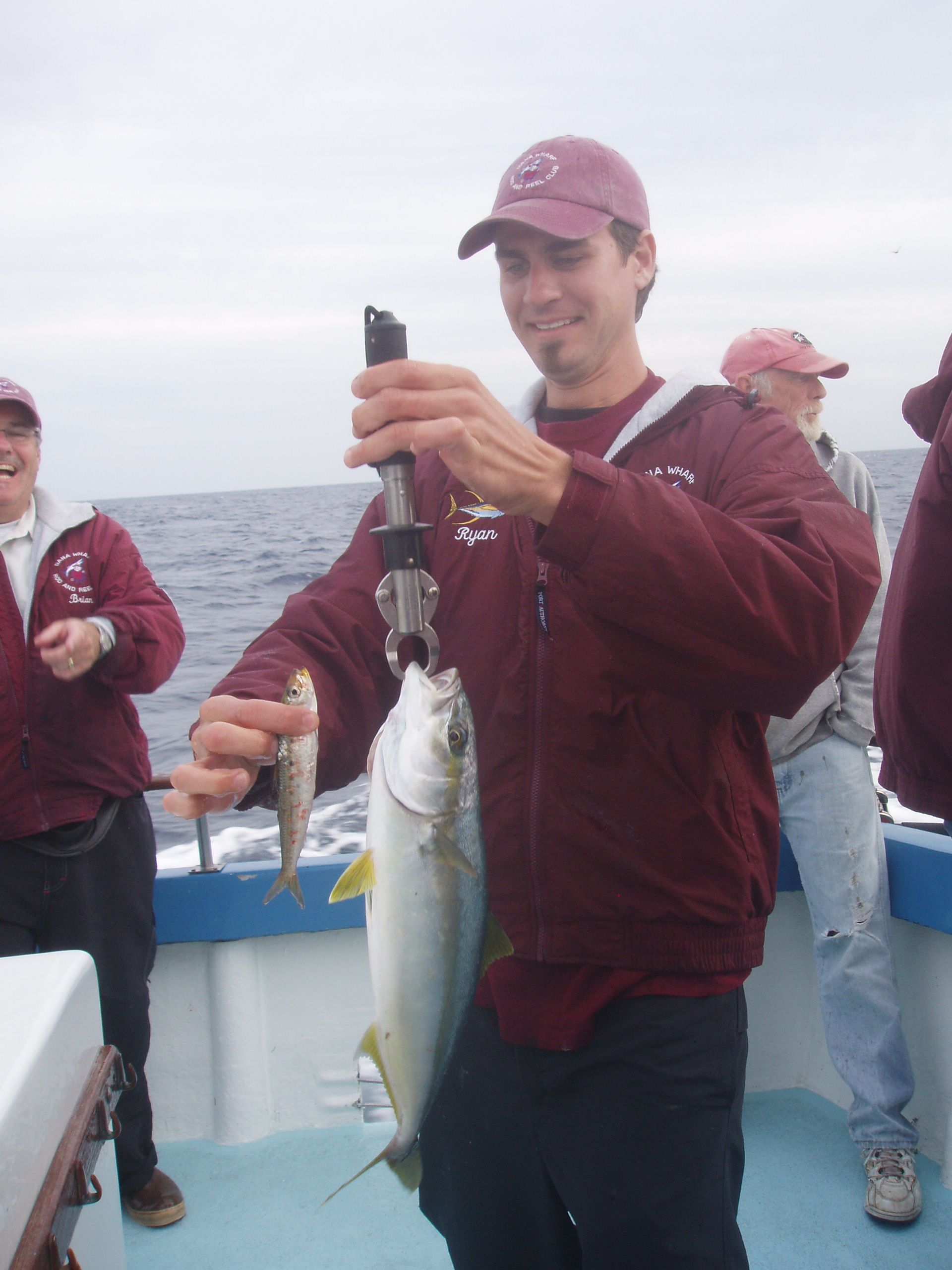 Trip #4: Boat: Thunderbird 2 day Departs: Thursday August 7th Fishing: August 8th, 9th Returns: August 9th pm Trip 4 started as usual with people arriving at Newport Landing at all hours of the day with anticipation of fishing. The preliminary reports from Gary Thompson were all too familiar to what we’ve seen this year. Bait was going to be an issue. And last but not least, was the fish seemed to pop up one day and then disappear the next. Nevertheless, everyone was ready to go. Friday morning saw us anchored at the usual cove off SCI. Weather was OK; fishable, but not a lot of fish. But the ones we caught were quality yellowtail and white sea bass. The sea lions provided ample entertainment …err I mean frustration. We hopped around to a few spots picking up the occasional calico but not much. Day 1 jackpot went to Alex Arthur (Justin Becker’s Guest) with the patch going to Nick Burson for some chunky YT’s Day 2 started much as it did Day 1 but the weather was worse than Day 1. We looked here and there with only 3 yellowtail to show for our efforts. Eventually, the Thunderbird turned towards offshore waters to try our luck at some bluefin. Unfortunately, the fish didn’t get the memo and we saw neither sign or had any bites. Mr, “Hey that’s my fish” Tom Hill was the lucky jackpot and patch winner for Day 2 with a 15# YT. So, there you have it, not a, “Hey you missed a great trip” kind ‘a trip but per usual, the members of our club all seemed to enjoy doing what we do. It’s not always about the fish; it’s about the people and the experience. LOL! Who am I kidding…we all want more fish. Until next time, step to the right/left and take up your slack.