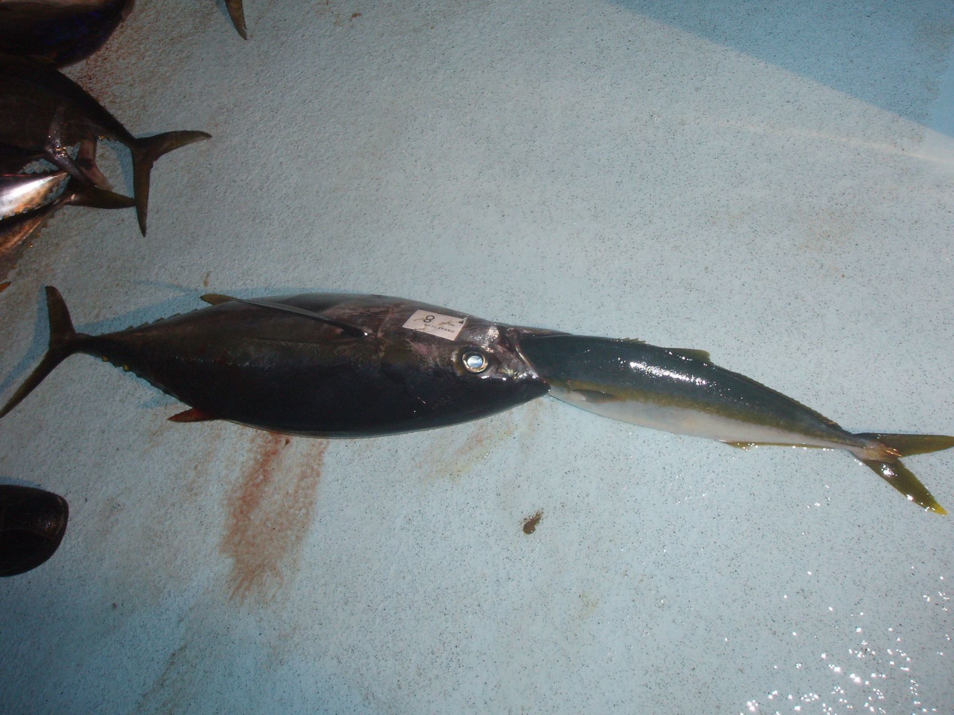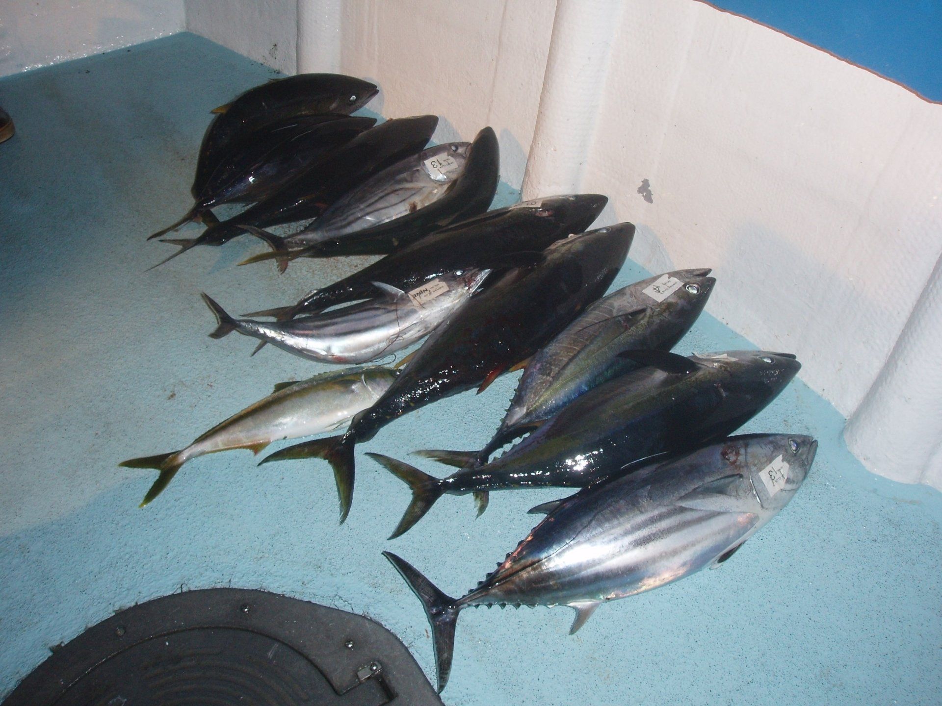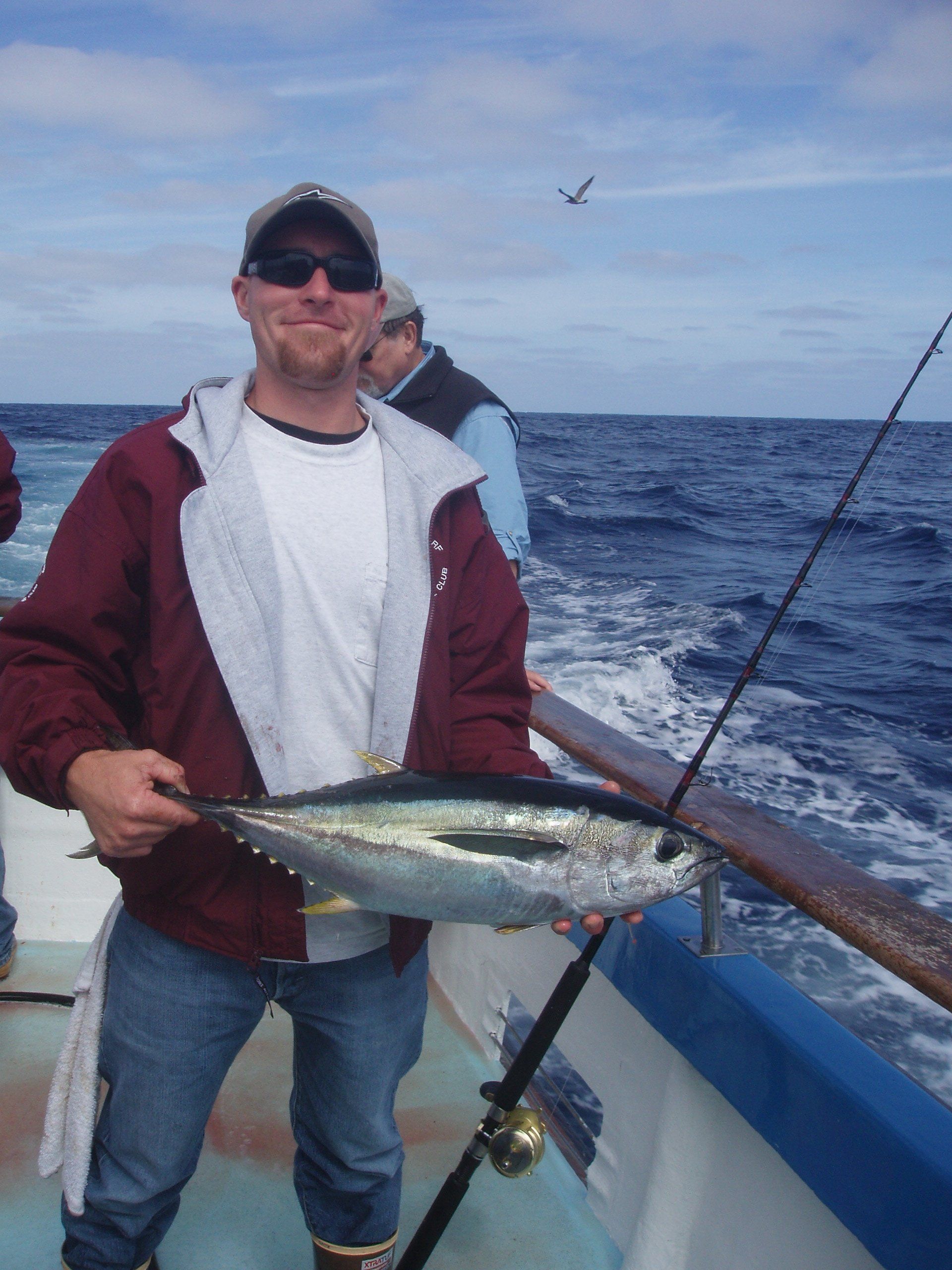 Trip #5: Boat: Thunderbird 2.5 day Departs: Tuesday August 19th Fishing: August 20th, 21th Returns: August 22th am Thunderbird Crew: Jeff Markland- Captain Steve Raby- 2nd Captain Jose, Jared & Nate on deck Goofy in his usual form in the Galley The usual suspects, newer club members and a slew of guests began gathering for the upcoming 2.5-day venture on board the Thunderbird on Tuesday afternoon/evening, a lot of discussion occurred around where will we fish, what is our bait, are we going to fish for tuna, and more importantly, the weather. Forecast was for pretty breezy on the outer banks and tuna grounds with somewhat better at the island. Thursday weather looked much improved everywhere. As it turned out, the weather turned out nice the first day, and even nicer the second day. Also the good news was we would have sardines for bait. When the boat returned from the fuel dock around 7:30, I wandered down to the boat and sat with Jeff and discussed our “options”. There was about 2 scoops of live squid on the boat and the squid at San Clemente Island was available but by jigging. Also, the yellowtail fishing was hit or miss at best early in the cove, and then really nothing to catch the rest of the day unless the bass decided to bite. The tuna grounds were in range to do some night fishing between the days, and daytime fishing was producing smaller fish. The Tanner Bank had the 10-15 lb variety which was spotty, and inside toward SCI were bigger 30-35lb variety with some larger mixed in. Getting bites though would be hard. The Cortez Bank coughed up 100 yellowtail for Jeff a few days before. There was also some white sea bass caught at San Nicholas Island so that was an option. Soooo, one more time, what to do. Jeff decided he will decide when we leave the bait receiver as I said give it your best shot. The final decision, with the weather forecast improving, we would head to the Cortez Bank since there had been some yellowtail there a few days before. And off we went. Travel out was not too bad. Day 1- Arrived at the Cortez Bank around 7:45 am, fished a couple areas for nothing except some of the jumbo bonito, large mackerel and a few bottom dwellers. There was no sign of yellowtail. Where the F**k did they go? Around 10:00am, Jeff pulled the plug and we headed back inside to the tuna grounds, about 30 miles away. Weather was getting much nicer, We ended up picking at the BFT not long after we arrived in the area around 2:00pm and joined “the fleet”. We had one decent plunker drift for 16 BFT, and scratched up 9 more at sundown. As dark fell, we headed into the island to try for the early morning yellowtail fishing at the Lost Point area. Day 1 fish count- 25 BFT, 4 Bonito kept, a few misc bottom dwellers kept JP winner- Bronson Noggle (Cory Steinwand Guest)- 30 plus lb BFT, Patch winner Cory Steinwand- 30 plus lb BFT (it was very close) Day 2- had a few yellowtail bites in the dark and grey light at Lost Point, all nice fish. Headed out after grey light for yesterday’s tuna grounds. Flat calm weather. Worked the area with “the fleet” for a couple of hours and covering a lot of water. Jeff finally pulled the plug and decided to take a gamble and head to the Tanner Bank since there were tuna there a few days before. And the gamble certainly paid off. We were greeted with boiling fish in the chum circle when we arrived, boiling fish on the anchor and steady fishing on the 10-15 lb BFT the rest of the afternoon. We fished a couple deep spots for decent reds and other stuff, one nice ling cod and headed back to the area west of SCI toward San Nicholas Island for some night fishing. We had several stops on spots of fish, and got a few anywhere from 30 plus lbs up to 100lbs. Around midnight, we headed home. We were able to fish that long because by chance, the boat was not scheduled to run a ¾ day trip when we got in, so we got to fish longer. Arrived at the dock around 7:20am, unloaded and that was it. Day 2 fish count- 6 Yellowtail, 40 BFT, 1 Halibut, 2 Barracuda, 100 plus mixed Reds and Rockfish, 1 Ling Cod JP & Patch winner- Cory Steinwand- 102 lb BFT Trip total- 65 BFT, 6 Yellowtail, 1 Halibut, 4 Bonito, 100 plus mixed Reds/Rockfish, 1 Ling Cod The weather for the entire trip was good. Temperature cool both days but very nice. Very little wind to flat calm the entire 2 days. One thing that was troubling was the amount of casualties on these smaller tuna. Seems like most everyone liberated one or two, or more. (We won’t mention my luck!). Small hooks and light line with too much pressure and these little guys were hot! All in all a good time had by all and a very good group of guests on this trip as well. That’s it! Your Scribe- Gary Thompson
