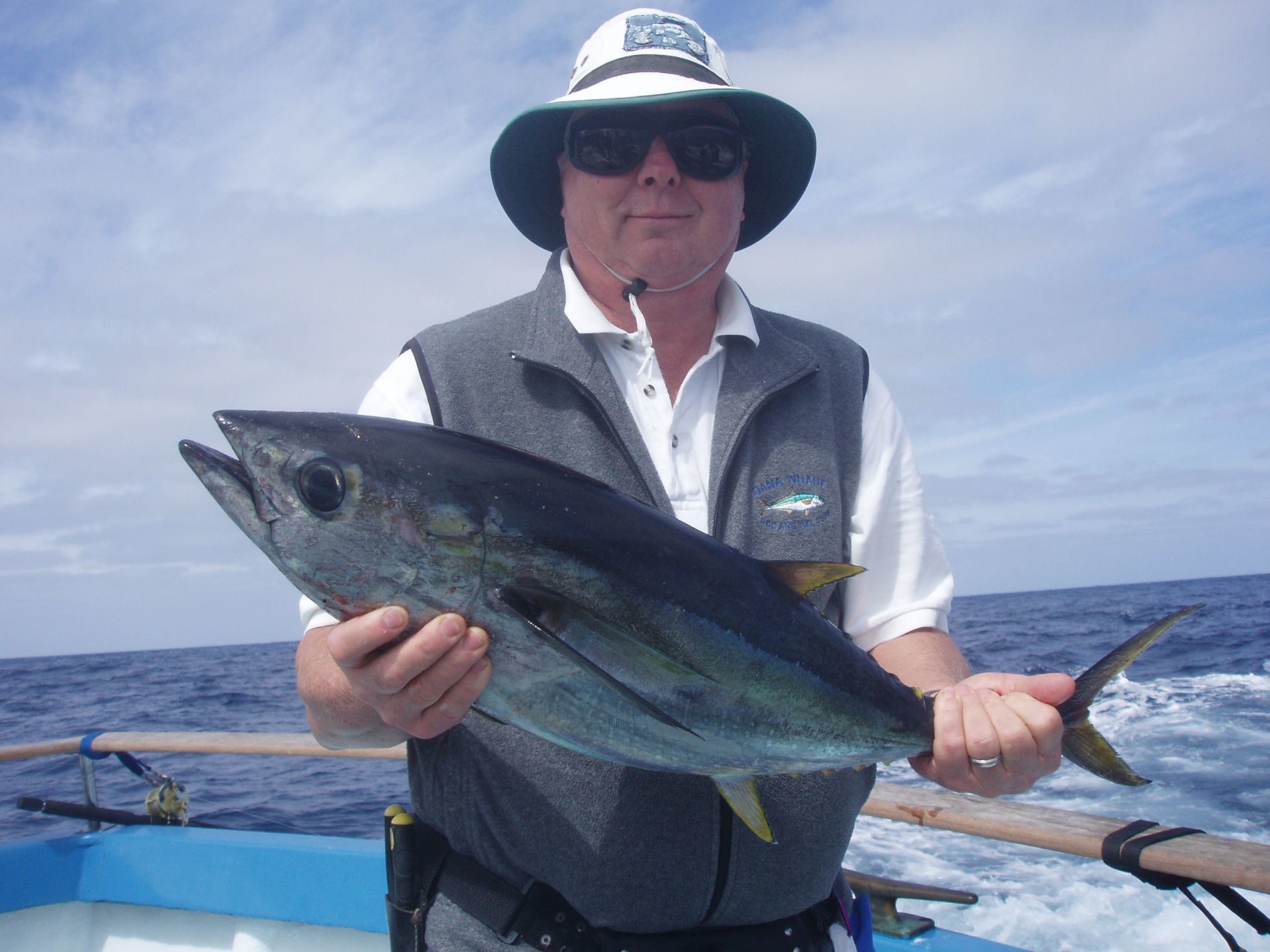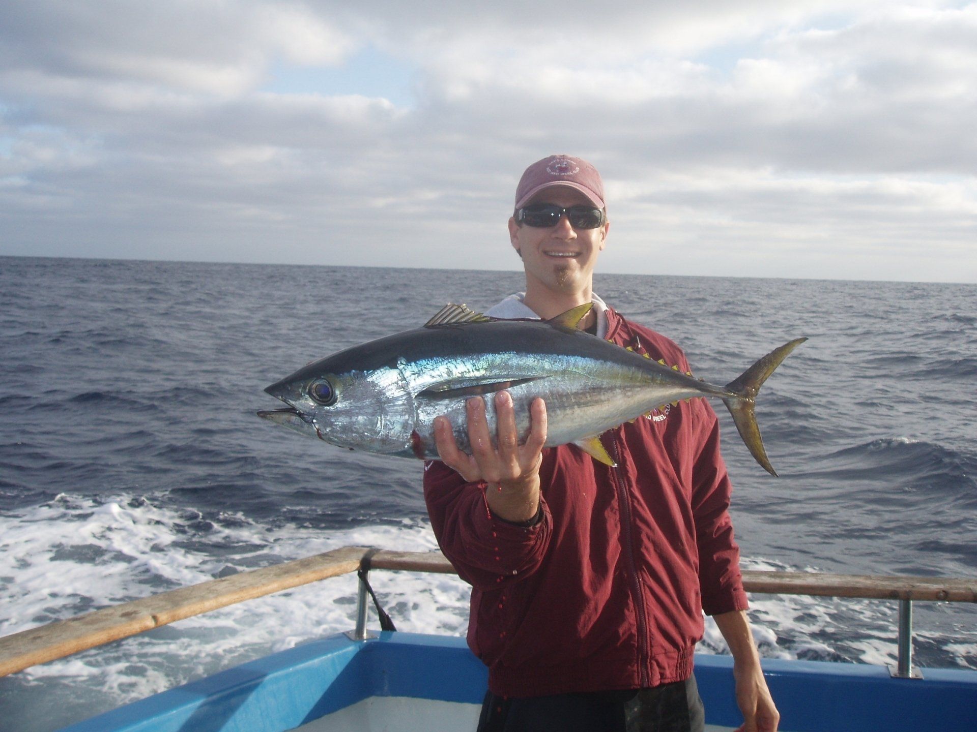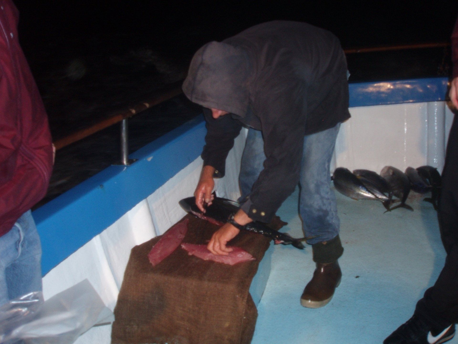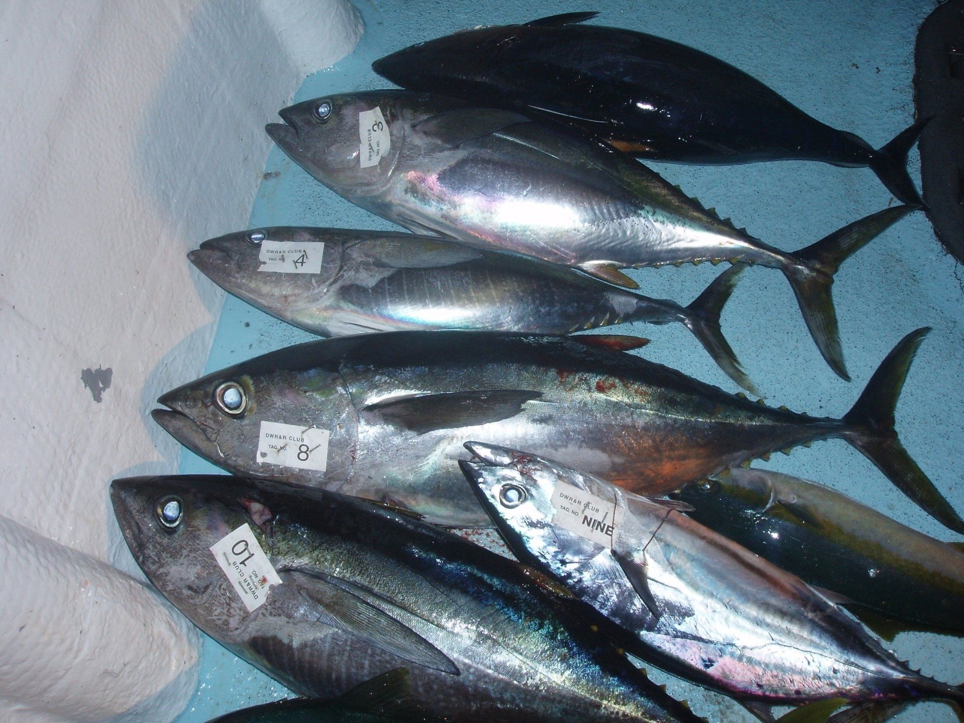 Trip #5: Boat: Thunderbird 2.5 day Departs: Tuesday August 19th Fishing: August 20th, 21th Returns: August 22th am Thunderbird Crew: Jeff Markland- Captain Steve Raby- 2nd Captain Jose, Jared & Nate on deck Goofy in his usual form in the Galley The usual suspects, newer club members and a slew of guests began gathering for the upcoming 2.5-day venture on board the Thunderbird on Tuesday afternoon/evening, a lot of discussion occurred around where will we fish, what is our bait, are we going to fish for tuna, and more importantly, the weather. Forecast was for pretty breezy on the outer banks and tuna grounds with somewhat better at the island. Thursday weather looked much improved everywhere. As it turned out, the weather turned out nice the first day, and even nicer the second day. Also the good news was we would have sardines for bait. When the boat returned from the fuel dock around 7:30, I wandered down to the boat and sat with Jeff and discussed our “options”. There was about 2 scoops of live squid on the boat and the squid at San Clemente Island was available but by jigging. Also, the yellowtail fishing was hit or miss at best early in the cove, and then really nothing to catch the rest of the day unless the bass decided to bite. The tuna grounds were in range to do some night fishing between the days, and daytime fishing was producing smaller fish. The Tanner Bank had the 10-15 lb variety which was spotty, and inside toward SCI were bigger 30-35lb variety with some larger mixed in. Getting bites though would be hard. The Cortez Bank coughed up 100 yellowtail for Jeff a few days before. There was also some white sea bass caught at San Nicholas Island so that was an option. Soooo, one more time, what to do. Jeff decided he will decide when we leave the bait receiver as I said give it your best shot. The final decision, with the weather forecast improving, we would head to the Cortez Bank since there had been some yellowtail there a few days before. And off we went. Travel out was not too bad. Day 1- Arrived at the Cortez Bank around 7:45 am, fished a couple areas for nothing except some of the jumbo bonito, large mackerel and a few bottom dwellers. There was no sign of yellowtail. Where the F**k did they go? Around 10:00am, Jeff pulled the plug and we headed back inside to the tuna grounds, about 30 miles away. Weather was getting much nicer, We ended up picking at the BFT not long after we arrived in the area around 2:00pm and joined “the fleet”. We had one decent plunker drift for 16 BFT, and scratched up 9 more at sundown. As dark fell, we headed into the island to try for the early morning yellowtail fishing at the Lost Point area. Day 1 fish count- 25 BFT, 4 Bonito kept, a few misc bottom dwellers kept JP winner- Bronson Noggle (Cory Steinwand Guest)- 30 plus lb BFT, Patch winner Cory Steinwand- 30 plus lb BFT (it was very close) Day 2- had a few yellowtail bites in the dark and grey light at Lost Point, all nice fish. Headed out after grey light for yesterday’s tuna grounds. Flat calm weather. Worked the area with “the fleet” for a couple of hours and covering a lot of water. Jeff finally pulled the plug and decided to take a gamble and head to the Tanner Bank since there were tuna there a few days before. And the gamble certainly paid off. We were greeted with boiling fish in the chum circle when we arrived, boiling fish on the anchor and steady fishing on the 10-15 lb BFT the rest of the afternoon. We fished a couple deep spots for decent reds and other stuff, one nice ling cod and headed back to the area west of SCI toward San Nicholas Island for some night fishing. We had several stops on spots of fish, and got a few anywhere from 30 plus lbs up to 100lbs. Around midnight, we headed home. We were able to fish that long because by chance, the boat was not scheduled to run a ¾ day trip when we got in, so we got to fish longer. Arrived at the dock around 7:20am, unloaded and that was it. Day 2 fish count- 6 Yellowtail, 40 BFT, 1 Halibut, 2 Barracuda, 100 plus mixed Reds and Rockfish, 1 Ling Cod JP & Patch winner- Cory Steinwand- 102 lb BFT Trip total- 65 BFT, 6 Yellowtail, 1 Halibut, 4 Bonito, 100 plus mixed Reds/Rockfish, 1 Ling Cod The weather for the entire trip was good. Temperature cool both days but very nice. Very little wind to flat calm the entire 2 days. One thing that was troubling was the amount of casualties on these smaller tuna. Seems like most everyone liberated one or two, or more. (We won’t mention my luck!). Small hooks and light line with too much pressure and these little guys were hot! All in all a good time had by all and a very good group of guests on this trip as well. That’s it! Your Scribe- Gary Thompson