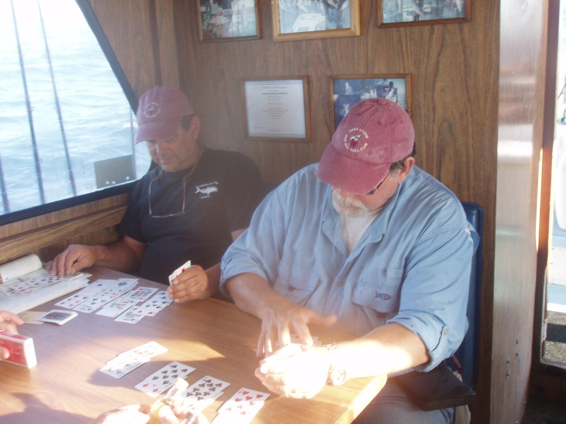 Trip #5: Boat: Thunderbird 2.5 day Departs: Tuesday August 19th Fishing: August 20th, 21th Returns: August 22th am Thunderbird Crew: Jeff Markland- Captain Steve Raby- 2nd Captain Jose, Jared & Nate on deck Goofy in his usual form in the Galley The usual suspects, newer club members and a slew of guests began gathering for the upcoming 2.5-day venture on board the Thunderbird on Tuesday afternoon/evening, a lot of discussion occurred around where will we fish, what is our bait, are we going to fish for tuna, and more importantly, the weather. Forecast was for pretty breezy on the outer banks and tuna grounds with somewhat better at the island. Thursday weather looked much improved everywhere. As it turned out, the weather turned out nice the first day, and even nicer the second day. Also the good news was we would have sardines for bait. When the boat returned from the fuel dock around 7:30, I wandered down to the boat and sat with Jeff and discussed our “options”. There was about 2 scoops of live squid on the boat and the squid at San Clemente Island was available but by jigging. Also, the yellowtail fishing was hit or miss at best early in the cove, and then really nothing to catch the rest of the day unless the bass decided to bite. The tuna grounds were in range to do some night fishing between the days, and daytime fishing was producing smaller fish. The Tanner Bank had the 10-15 lb variety which was spotty, and inside toward SCI were bigger 30-35lb variety with some larger mixed in. Getting bites though would be hard. The Cortez Bank coughed up 100 yellowtail for Jeff a few days before. There was also some white sea bass caught at San Nicholas Island so that was an option. Soooo, one more time, what to do. Jeff decided he will decide when we leave the bait receiver as I said give it your best shot. The final decision, with the weather forecast improving, we would head to the Cortez Bank since there had been some yellowtail there a few days before. And off we went. Travel out was not too bad. Day 1- Arrived at the Cortez Bank around 7:45 am, fished a couple areas for nothing except some of the jumbo bonito, large mackerel and a few bottom dwellers. There was no sign of yellowtail. Where the F**k did they go? Around 10:00am, Jeff pulled the plug and we headed back inside to the tuna grounds, about 30 miles away. Weather was getting much nicer, We ended up picking at the BFT not long after we arrived in the area around 2:00pm and joined “the fleet”. We had one decent plunker drift for 16 BFT, and scratched up 9 more at sundown. As dark fell, we headed into the island to try for the early morning yellowtail fishing at the Lost Point area. Day 1 fish count- 25 BFT, 4 Bonito kept, a few misc bottom dwellers kept JP winner- Bronson Noggle (Cory Steinwand Guest)- 30 plus lb BFT, Patch winner Cory Steinwand- 30 plus lb BFT (it was very close) Day 2- had a few yellowtail bites in the dark and grey light at Lost Point, all nice fish. Headed out after grey light for yesterday’s tuna grounds. Flat calm weather. Worked the area with “the fleet” for a couple of hours and covering a lot of water. Jeff finally pulled the plug and decided to take a gamble and head to the Tanner Bank since there were tuna there a few days before. And the gamble certainly paid off. We were greeted with boiling fish in the chum circle when we arrived, boiling fish on the anchor and steady fishing on the 10-15 lb BFT the rest of the afternoon. We fished a couple deep spots for decent reds and other stuff, one nice ling cod and headed back to the area west of SCI toward San Nicholas Island for some night fishing. We had several stops on spots of fish, and got a few anywhere from 30 plus lbs up to 100lbs. Around midnight, we headed home. We were able to fish that long because by chance, the boat was not scheduled to run a ¾ day trip when we got in, so we got to fish longer. Arrived at the dock around 7:20am, unloaded and that was it. Day 2 fish count- 6 Yellowtail, 40 BFT, 1 Halibut, 2 Barracuda, 100 plus mixed Reds and Rockfish, 1 Ling Cod JP & Patch winner- Cory Steinwand- 102 lb BFT Trip total- 65 BFT, 6 Yellowtail, 1 Halibut, 4 Bonito, 100 plus mixed Reds/Rockfish, 1 Ling Cod The weather for the entire trip was good. Temperature cool both days but very nice. Very little wind to flat calm the entire 2 days. One thing that was troubling was the amount of casualties on these smaller tuna. Seems like most everyone liberated one or two, or more. (We won’t mention my luck!). Small hooks and light line with too much pressure and these little guys were hot! All in all a good time had by all and a very good group of guests on this trip as well. That’s it! Your Scribe- Gary Thompson