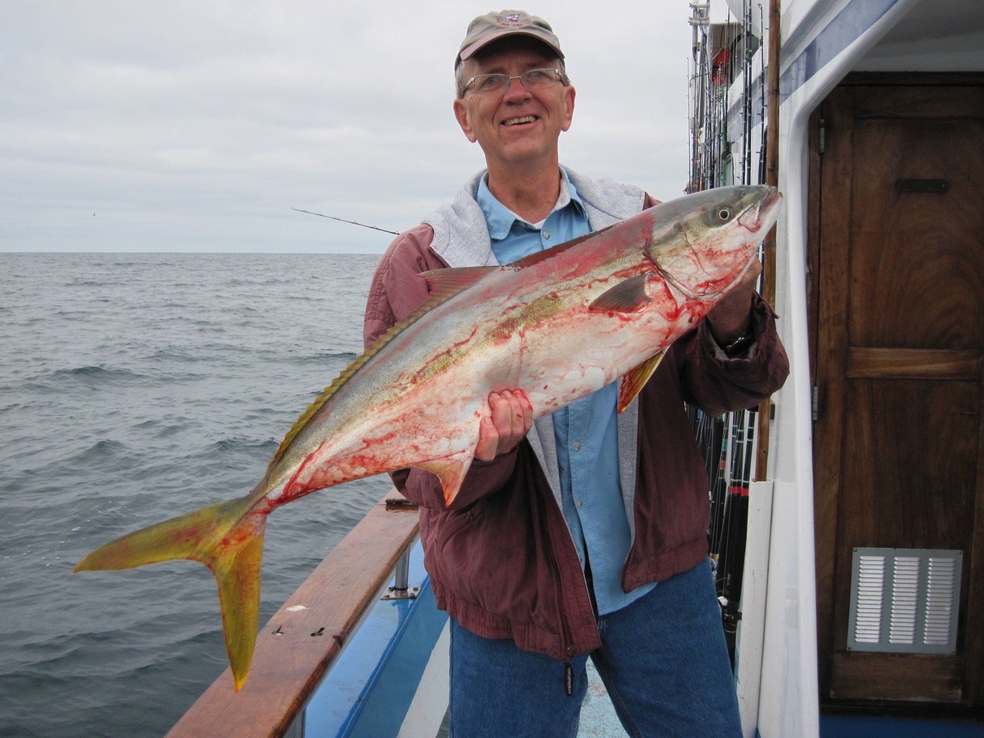 Trip #4: Boat: Thunderbird 2 day Departs: Thursday August 7th Fishing: August 8th, 9th Returns: August 9th pm Trip 4 started as usual with people arriving at Newport Landing at all hours of the day with anticipation of fishing. The preliminary reports from Gary Thompson were all too familiar to what we’ve seen this year. Bait was going to be an issue. And last but not least, was the fish seemed to pop up one day and then disappear the next. Nevertheless, everyone was ready to go. Friday morning saw us anchored at the usual cove off SCI. Weather was OK; fishable, but not a lot of fish. But the ones we caught were quality yellowtail and white sea bass. The sea lions provided ample entertainment …err I mean frustration. We hopped around to a few spots picking up the occasional calico but not much. Day 1 jackpot went to Alex Arthur (Justin Becker’s Guest) with the patch going to Nick Burson for some chunky YT’s Day 2 started much as it did Day 1 but the weather was worse than Day 1. We looked here and there with only 3 yellowtail to show for our efforts. Eventually, the Thunderbird turned towards offshore waters to try our luck at some bluefin. Unfortunately, the fish didn’t get the memo and we saw neither sign or had any bites. Mr, “Hey that’s my fish” Tom Hill was the lucky jackpot and patch winner for Day 2 with a 15# YT. So, there you have it, not a, “Hey you missed a great trip” kind ‘a trip but per usual, the members of our club all seemed to enjoy doing what we do. It’s not always about the fish; it’s about the people and the experience. LOL! Who am I kidding…we all want more fish. Until next time, step to the right/left and take up your slack.