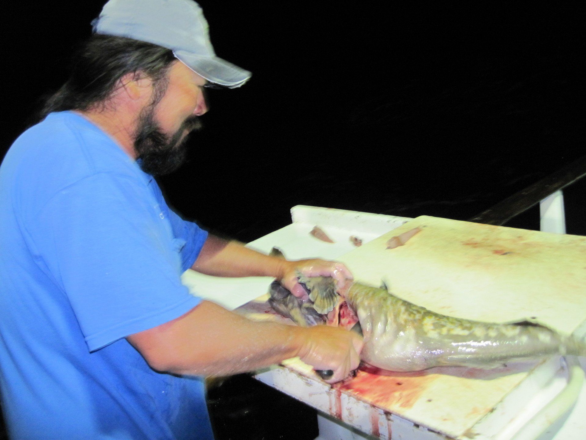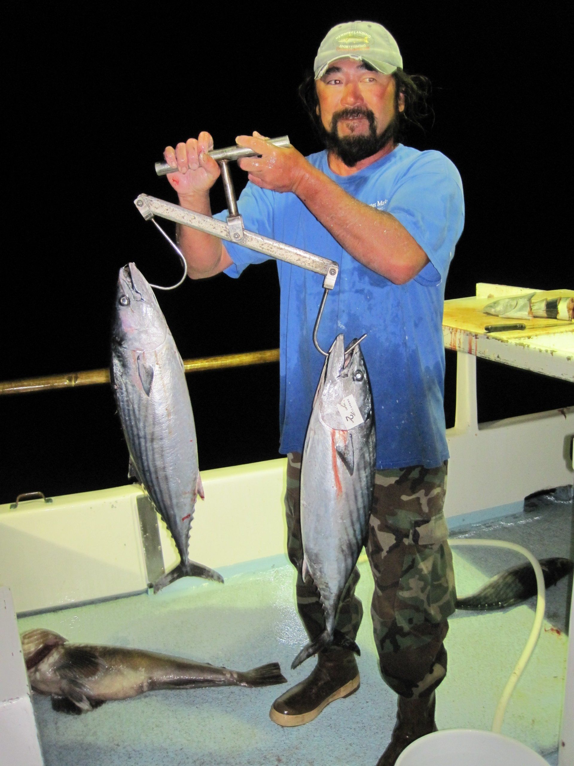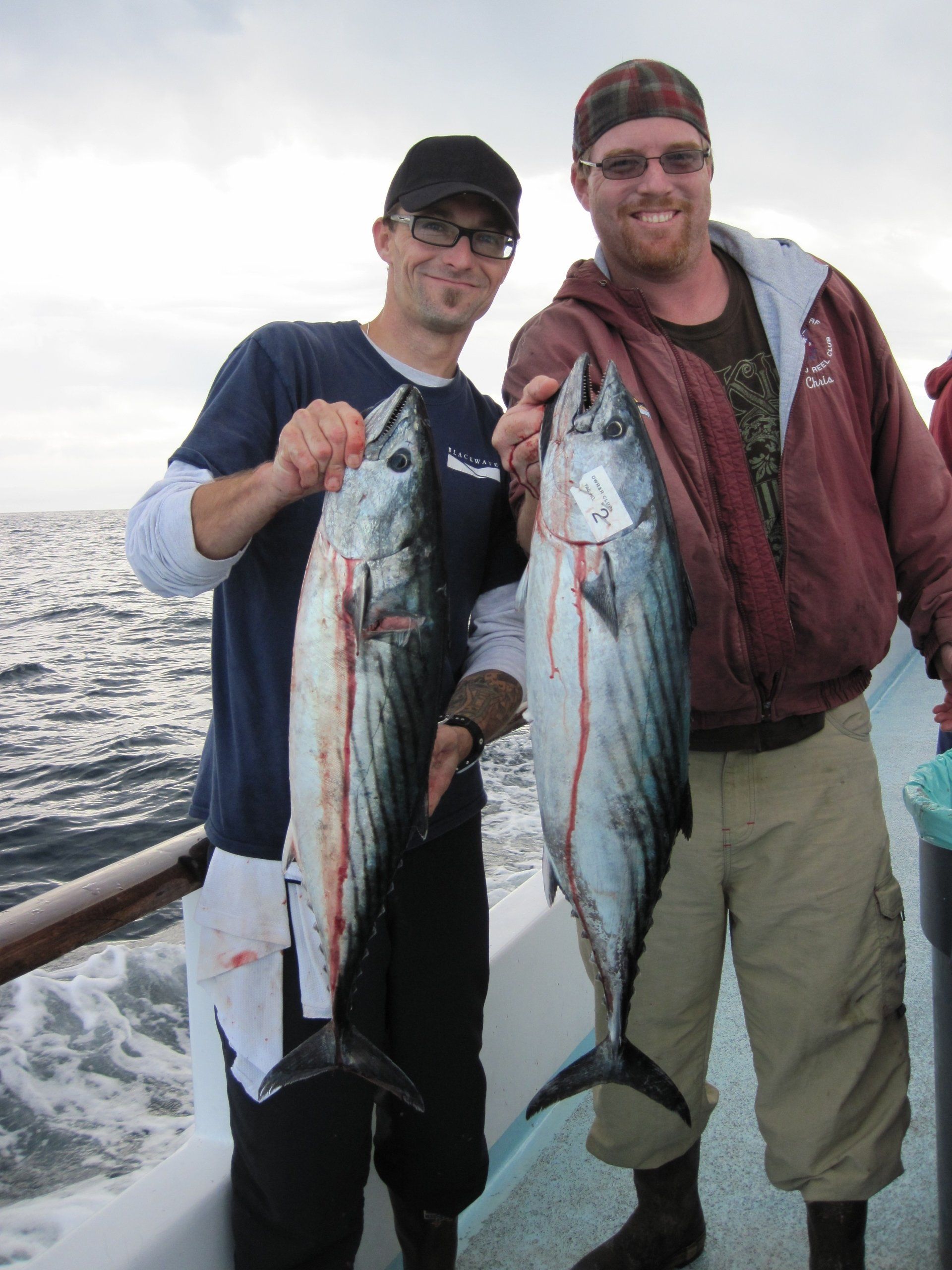 Trip #5: Boat: Thunderbird 2.5 day Departs: Tuesday August 19th Fishing: August 20th, 21th Returns: August 22th am Thunderbird Crew: Jeff Markland- Captain Steve Raby- 2nd Captain Jose, Jared & Nate on deck Goofy in his usual form in the Galley The usual suspects, newer club members and a slew of guests began gathering for the upcoming 2.5-day venture on board the Thunderbird on Tuesday afternoon/evening, a lot of discussion occurred around where will we fish, what is our bait, are we going to fish for tuna, and more importantly, the weather. Forecast was for pretty breezy on the outer banks and tuna grounds with somewhat better at the island. Thursday weather looked much improved everywhere. As it turned out, the weather turned out nice the first day, and even nicer the second day. Also the good news was we would have sardines for bait. When the boat returned from the fuel dock around 7:30, I wandered down to the boat and sat with Jeff and discussed our “options”. There was about 2 scoops of live squid on the boat and the squid at San Clemente Island was available but by jigging. Also, the yellowtail fishing was hit or miss at best early in the cove, and then really nothing to catch the rest of the day unless the bass decided to bite. The tuna grounds were in range to do some night fishing between the days, and daytime fishing was producing smaller fish. The Tanner Bank had the 10-15 lb variety which was spotty, and inside toward SCI were bigger 30-35lb variety with some larger mixed in. Getting bites though would be hard. The Cortez Bank coughed up 100 yellowtail for Jeff a few days before. There was also some white sea bass caught at San Nicholas Island so that was an option. Soooo, one more time, what to do. Jeff decided he will decide when we leave the bait receiver as I said give it your best shot. The final decision, with the weather forecast improving, we would head to the Cortez Bank since there had been some yellowtail there a few days before. And off we went. Travel out was not too bad. Day 1- Arrived at the Cortez Bank around 7:45 am, fished a couple areas for nothing except some of the jumbo bonito, large mackerel and a few bottom dwellers. There was no sign of yellowtail. Where the F**k did they go? Around 10:00am, Jeff pulled the plug and we headed back inside to the tuna grounds, about 30 miles away. Weather was getting much nicer, We ended up picking at the BFT not long after we arrived in the area around 2:00pm and joined “the fleet”. We had one decent plunker drift for 16 BFT, and scratched up 9 more at sundown. As dark fell, we headed into the island to try for the early morning yellowtail fishing at the Lost Point area. Day 1 fish count- 25 BFT, 4 Bonito kept, a few misc bottom dwellers kept JP winner- Bronson Noggle (Cory Steinwand Guest)- 30 plus lb BFT, Patch winner Cory Steinwand- 30 plus lb BFT (it was very close) Day 2- had a few yellowtail bites in the dark and grey light at Lost Point, all nice fish. Headed out after grey light for yesterday’s tuna grounds. Flat calm weather. Worked the area with “the fleet” for a couple of hours and covering a lot of water. Jeff finally pulled the plug and decided to take a gamble and head to the Tanner Bank since there were tuna there a few days before. And the gamble certainly paid off. We were greeted with boiling fish in the chum circle when we arrived, boiling fish on the anchor and steady fishing on the 10-15 lb BFT the rest of the afternoon. We fished a couple deep spots for decent reds and other stuff, one nice ling cod and headed back to the area west of SCI toward San Nicholas Island for some night fishing. We had several stops on spots of fish, and got a few anywhere from 30 plus lbs up to 100lbs. Around midnight, we headed home. We were able to fish that long because by chance, the boat was not scheduled to run a ¾ day trip when we got in, so we got to fish longer. Arrived at the dock around 7:20am, unloaded and that was it. Day 2 fish count- 6 Yellowtail, 40 BFT, 1 Halibut, 2 Barracuda, 100 plus mixed Reds and Rockfish, 1 Ling Cod JP & Patch winner- Cory Steinwand- 102 lb BFT Trip total- 65 BFT, 6 Yellowtail, 1 Halibut, 4 Bonito, 100 plus mixed Reds/Rockfish, 1 Ling Cod The weather for the entire trip was good. Temperature cool both days but very nice. Very little wind to flat calm the entire 2 days. One thing that was troubling was the amount of casualties on these smaller tuna. Seems like most everyone liberated one or two, or more. (We won’t mention my luck!). Small hooks and light line with too much pressure and these little guys were hot! All in all a good time had by all and a very good group of guests on this trip as well. That’s it! Your Scribe- Gary Thompson
