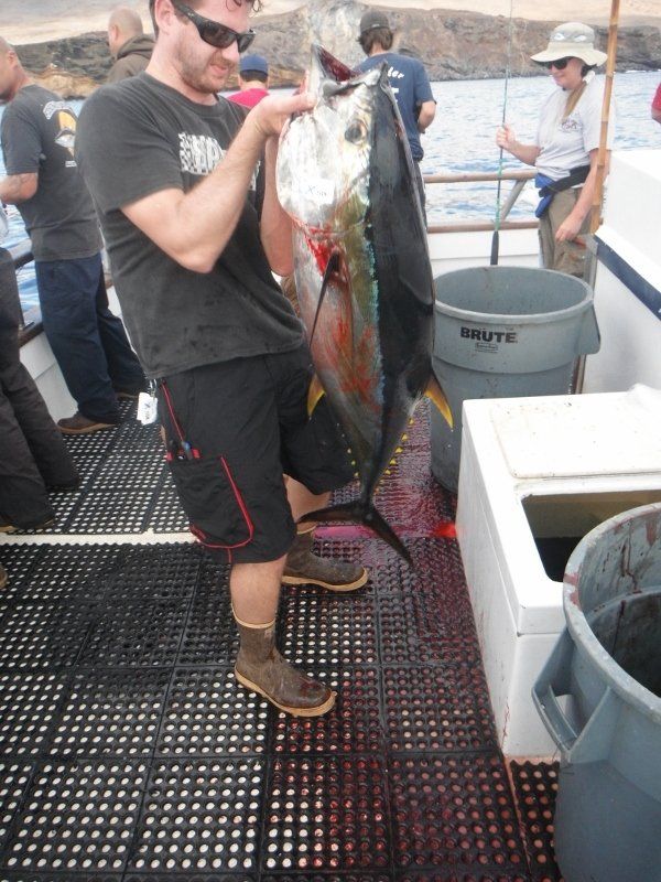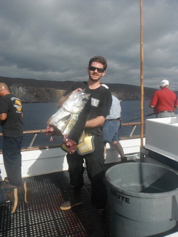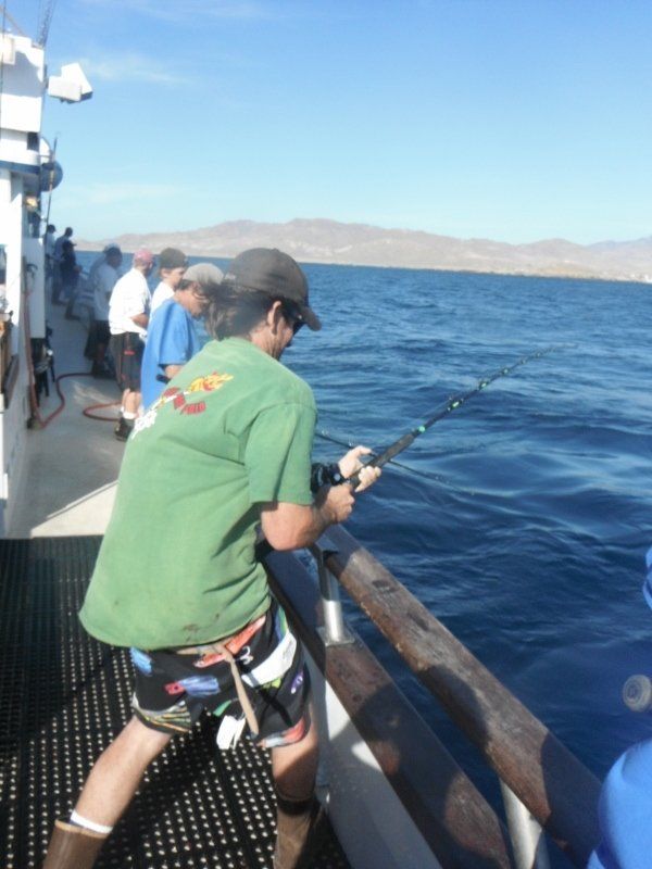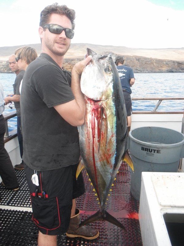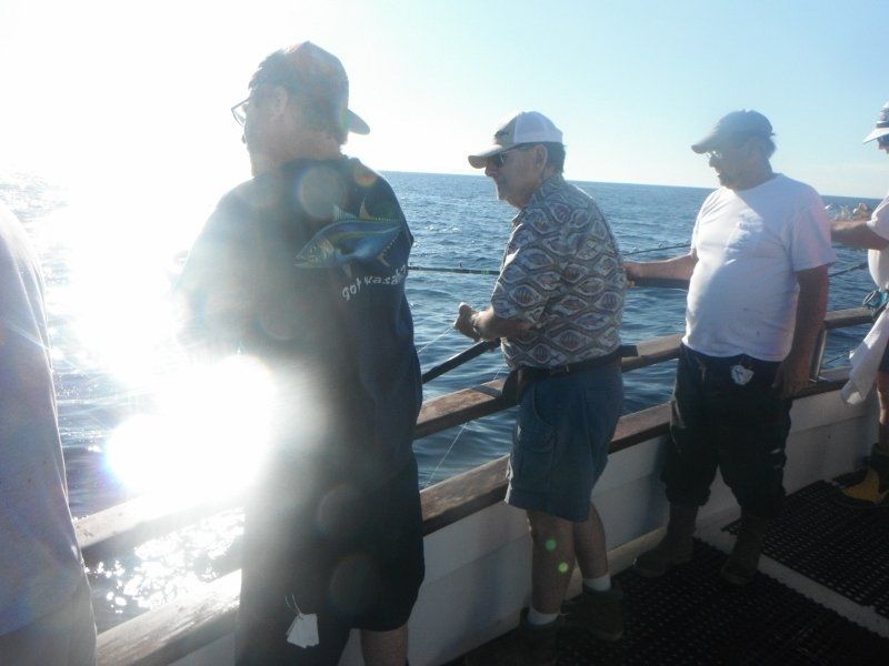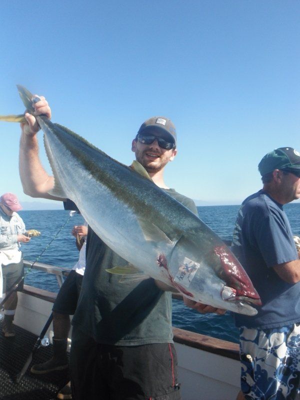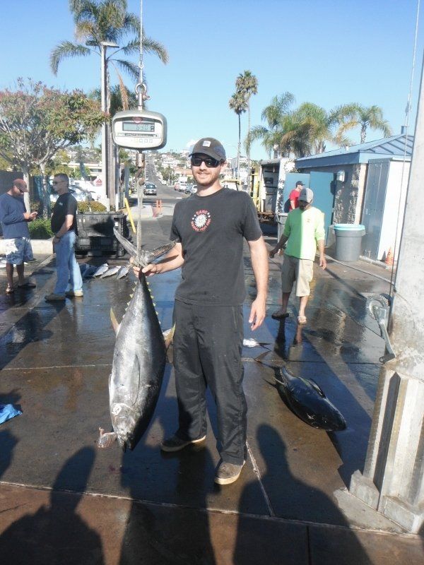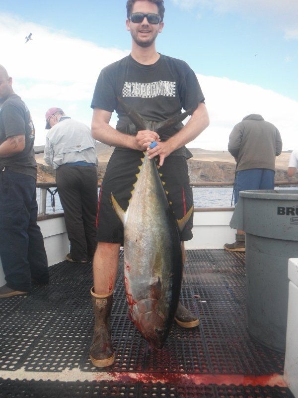 Trip #5: Boat: Thunderbird 2.5 day Departs: Tuesday August 19th Fishing: August 20th, 21th Returns: August 22th am Thunderbird Crew: Jeff Markland- Captain Steve Raby- 2nd Captain Jose, Jared & Nate on deck Goofy in his usual form in the Galley The usual suspects, newer club members and a slew of guests began gathering for the upcoming 2.5-day venture on board the Thunderbird on Tuesday afternoon/evening, a lot of discussion occurred around where will we fish, what is our bait, are we going to fish for tuna, and more importantly, the weather. Forecast was for pretty breezy on the outer banks and tuna grounds with somewhat better at the island. Thursday weather looked much improved everywhere. As it turned out, the weather turned out nice the first day, and even nicer the second day. Also the good news was we would have sardines for bait. When the boat returned from the fuel dock around 7:30, I wandered down to the boat and sat with Jeff and discussed our “options”. There was about 2 scoops of live squid on the boat and the squid at San Clemente Island was available but by jigging. Also, the yellowtail fishing was hit or miss at best early in the cove, and then really nothing to catch the rest of the day unless the bass decided to bite. The tuna grounds were in range to do some night fishing between the days, and daytime fishing was producing smaller fish. The Tanner Bank had the 10-15 lb variety which was spotty, and inside toward SCI were bigger 30-35lb variety with some larger mixed in. Getting bites though would be hard. The Cortez Bank coughed up 100 yellowtail for Jeff a few days before. There was also some white sea bass caught at San Nicholas Island so that was an option. Soooo, one more time, what to do. Jeff decided he will decide when we leave the bait receiver as I said give it your best shot. The final decision, with the weather forecast improving, we would head to the Cortez Bank since there had been some yellowtail there a few days before. And off we went. Travel out was not too bad. Day 1- Arrived at the Cortez Bank around 7:45 am, fished a couple areas for nothing except some of the jumbo bonito, large mackerel and a few bottom dwellers. There was no sign of yellowtail. Where the F**k did they go? Around 10:00am, Jeff pulled the plug and we headed back inside to the tuna grounds, about 30 miles away. Weather was getting much nicer, We ended up picking at the BFT not long after we arrived in the area around 2:00pm and joined “the fleet”. We had one decent plunker drift for 16 BFT, and scratched up 9 more at sundown. As dark fell, we headed into the island to try for the early morning yellowtail fishing at the Lost Point area. Day 1 fish count- 25 BFT, 4 Bonito kept, a few misc bottom dwellers kept JP winner- Bronson Noggle (Cory Steinwand Guest)- 30 plus lb BFT, Patch winner Cory Steinwand- 30 plus lb BFT (it was very close) Day 2- had a few yellowtail bites in the dark and grey light at Lost Point, all nice fish. Headed out after grey light for yesterday’s tuna grounds. Flat calm weather. Worked the area with “the fleet” for a couple of hours and covering a lot of water. Jeff finally pulled the plug and decided to take a gamble and head to the Tanner Bank since there were tuna there a few days before. And the gamble certainly paid off. We were greeted with boiling fish in the chum circle when we arrived, boiling fish on the anchor and steady fishing on the 10-15 lb BFT the rest of the afternoon. We fished a couple deep spots for decent reds and other stuff, one nice ling cod and headed back to the area west of SCI toward San Nicholas Island for some night fishing. We had several stops on spots of fish, and got a few anywhere from 30 plus lbs up to 100lbs. Around midnight, we headed home. We were able to fish that long because by chance, the boat was not scheduled to run a ¾ day trip when we got in, so we got to fish longer. Arrived at the dock around 7:20am, unloaded and that was it. Day 2 fish count- 6 Yellowtail, 40 BFT, 1 Halibut, 2 Barracuda, 100 plus mixed Reds and Rockfish, 1 Ling Cod JP & Patch winner- Cory Steinwand- 102 lb BFT Trip total- 65 BFT, 6 Yellowtail, 1 Halibut, 4 Bonito, 100 plus mixed Reds/Rockfish, 1 Ling Cod The weather for the entire trip was good. Temperature cool both days but very nice. Very little wind to flat calm the entire 2 days. One thing that was troubling was the amount of casualties on these smaller tuna. Seems like most everyone liberated one or two, or more. (We won’t mention my luck!). Small hooks and light line with too much pressure and these little guys were hot! All in all a good time had by all and a very good group of guests on this trip as well. That’s it! Your Scribe- Gary Thompson