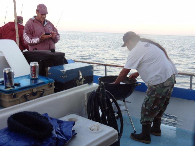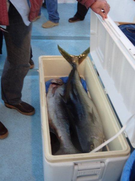 Trip #5: Boat: Thunderbird 2.5 day Departs: Tuesday August 19th Fishing: August 20th, 21th Returns: August 22th am Thunderbird Crew: Jeff Markland- Captain Steve Raby- 2nd Captain Jose, Jared & Nate on deck Goofy in his usual form in the Galley The usual suspects, newer club members and a slew of guests began gathering for the upcoming 2.5-day venture on board the Thunderbird on Tuesday afternoon/evening, a lot of discussion occurred around where will we fish, what is our bait, are we going to fish for tuna, and more importantly, the weather. Forecast was for pretty breezy on the outer banks and tuna grounds with somewhat better at the island. Thursday weather looked much improved everywhere. As it turned out, the weather turned out nice the first day, and even nicer the second day. Also the good news was we would have sardines for bait. When the boat returned from the fuel dock around 7:30, I wandered down to the boat and sat with Jeff and discussed our “options”. There was about 2 scoops of live squid on the boat and the squid at San Clemente Island was available but by jigging. Also, the yellowtail fishing was hit or miss at best early in the cove, and then really nothing to catch the rest of the day unless the bass decided to bite. The tuna grounds were in range to do some night fishing between the days, and daytime fishing was producing smaller fish. The Tanner Bank had the 10-15 lb variety which was spotty, and inside toward SCI were bigger 30-35lb variety with some larger mixed in. Getting bites though would be hard. The Cortez Bank coughed up 100 yellowtail for Jeff a few days before. There was also some white sea bass caught at San Nicholas Island so that was an option. Soooo, one more time, what to do. Jeff decided he will decide when we leave the bait receiver as I said give it your best shot. The final decision, with the weather forecast improving, we would head to the Cortez Bank since there had been some yellowtail there a few days before. And off we went. Travel out was not too bad. Day 1- Arrived at the Cortez Bank around 7:45 am, fished a couple areas for nothing except some of the jumbo bonito, large mackerel and a few bottom dwellers. There was no sign of yellowtail. Where the F**k did they go? Around 10:00am, Jeff pulled the plug and we headed back inside to the tuna grounds, about 30 miles away. Weather was getting much nicer, We ended up picking at the BFT not long after we arrived in the area around 2:00pm and joined “the fleet”. We had one decent plunker drift for 16 BFT, and scratched up 9 more at sundown. As dark fell, we headed into the island to try for the early morning yellowtail fishing at the Lost Point area. Day 1 fish count- 25 BFT, 4 Bonito kept, a few misc bottom dwellers kept JP winner- Bronson Noggle (Cory Steinwand Guest)- 30 plus lb BFT, Patch winner Cory Steinwand- 30 plus lb BFT (it was very close) Day 2- had a few yellowtail bites in the dark and grey light at Lost Point, all nice fish. Headed out after grey light for yesterday’s tuna grounds. Flat calm weather. Worked the area with “the fleet” for a couple of hours and covering a lot of water. Jeff finally pulled the plug and decided to take a gamble and head to the Tanner Bank since there were tuna there a few days before. And the gamble certainly paid off. We were greeted with boiling fish in the chum circle when we arrived, boiling fish on the anchor and steady fishing on the 10-15 lb BFT the rest of the afternoon. We fished a couple deep spots for decent reds and other stuff, one nice ling cod and headed back to the area west of SCI toward San Nicholas Island for some night fishing. We had several stops on spots of fish, and got a few anywhere from 30 plus lbs up to 100lbs. Around midnight, we headed home. We were able to fish that long because by chance, the boat was not scheduled to run a ¾ day trip when we got in, so we got to fish longer. Arrived at the dock around 7:20am, unloaded and that was it. Day 2 fish count- 6 Yellowtail, 40 BFT, 1 Halibut, 2 Barracuda, 100 plus mixed Reds and Rockfish, 1 Ling Cod JP & Patch winner- Cory Steinwand- 102 lb BFT Trip total- 65 BFT, 6 Yellowtail, 1 Halibut, 4 Bonito, 100 plus mixed Reds/Rockfish, 1 Ling Cod The weather for the entire trip was good. Temperature cool both days but very nice. Very little wind to flat calm the entire 2 days. One thing that was troubling was the amount of casualties on these smaller tuna. Seems like most everyone liberated one or two, or more. (We won’t mention my luck!). Small hooks and light line with too much pressure and these little guys were hot! All in all a good time had by all and a very good group of guests on this trip as well. That’s it! Your Scribe- Gary Thompson
