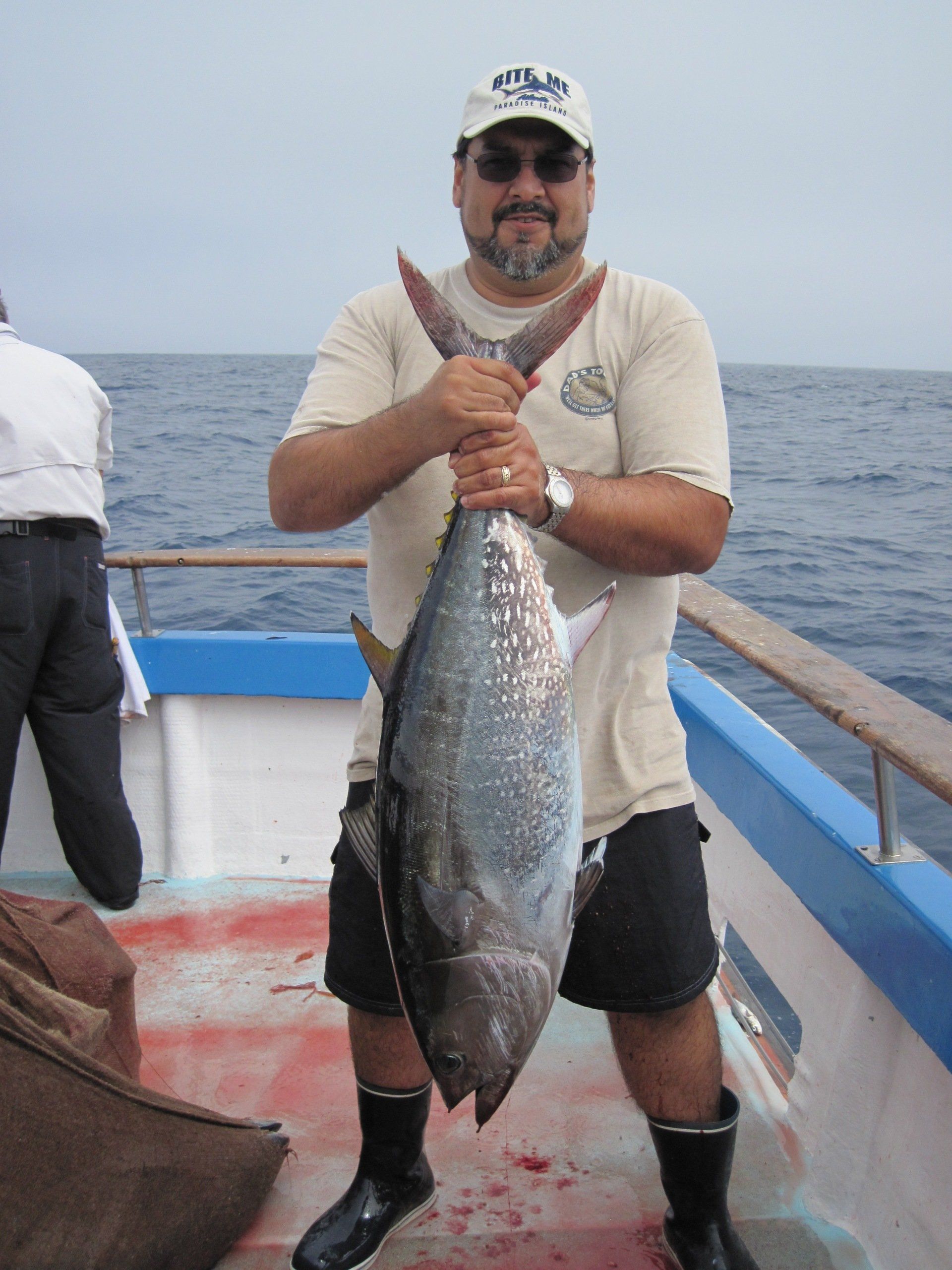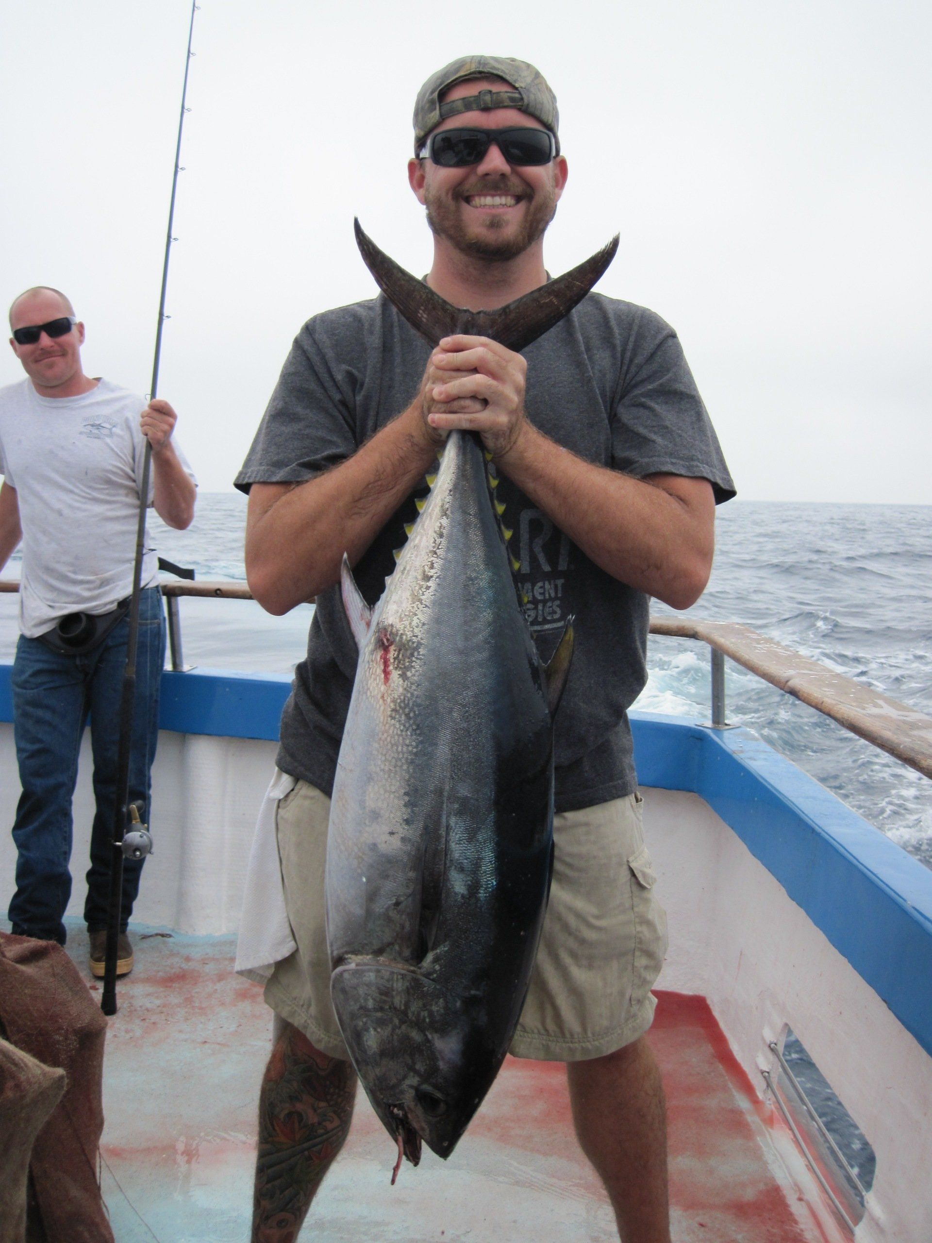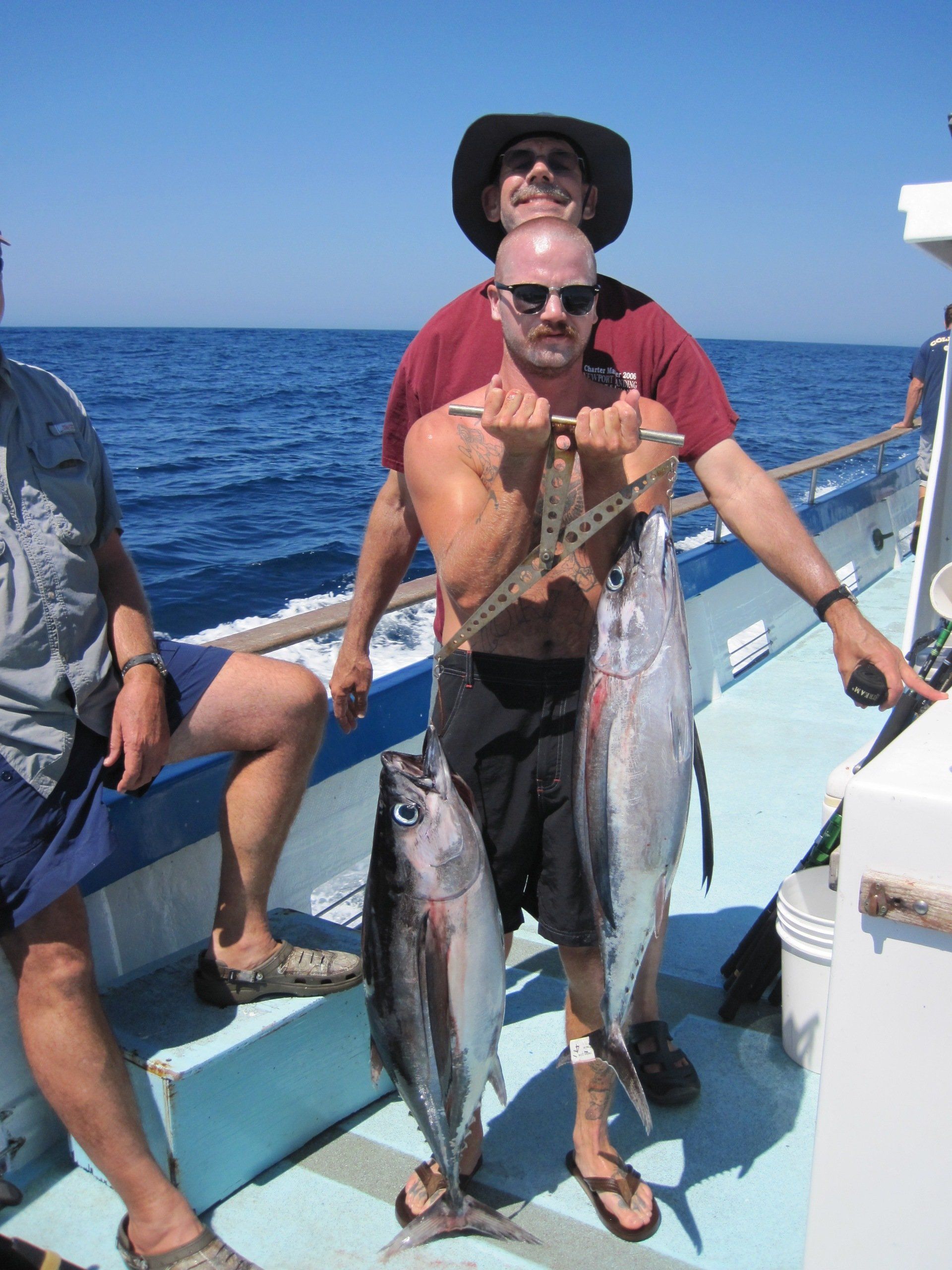 Trip #5: Boat: Thunderbird 2.5 day Departs: Tuesday August 19th Fishing: August 20th, 21th Returns: August 22th am Thunderbird Crew: Jeff Markland- Captain Steve Raby- 2nd Captain Jose, Jared & Nate on deck Goofy in his usual form in the Galley The usual suspects, newer club members and a slew of guests began gathering for the upcoming 2.5-day venture on board the Thunderbird on Tuesday afternoon/evening, a lot of discussion occurred around where will we fish, what is our bait, are we going to fish for tuna, and more importantly, the weather. Forecast was for pretty breezy on the outer banks and tuna grounds with somewhat better at the island. Thursday weather looked much improved everywhere. As it turned out, the weather turned out nice the first day, and even nicer the second day. Also the good news was we would have sardines for bait. When the boat returned from the fuel dock around 7:30, I wandered down to the boat and sat with Jeff and discussed our “options”. There was about 2 scoops of live squid on the boat and the squid at San Clemente Island was available but by jigging. Also, the yellowtail fishing was hit or miss at best early in the cove, and then really nothing to catch the rest of the day unless the bass decided to bite. The tuna grounds were in range to do some night fishing between the days, and daytime fishing was producing smaller fish. The Tanner Bank had the 10-15 lb variety which was spotty, and inside toward SCI were bigger 30-35lb variety with some larger mixed in. Getting bites though would be hard. The Cortez Bank coughed up 100 yellowtail for Jeff a few days before. There was also some white sea bass caught at San Nicholas Island so that was an option. Soooo, one more time, what to do. Jeff decided he will decide when we leave the bait receiver as I said give it your best shot. The final decision, with the weather forecast improving, we would head to the Cortez Bank since there had been some yellowtail there a few days before. And off we went. Travel out was not too bad. Day 1- Arrived at the Cortez Bank around 7:45 am, fished a couple areas for nothing except some of the jumbo bonito, large mackerel and a few bottom dwellers. There was no sign of yellowtail. Where the F**k did they go? Around 10:00am, Jeff pulled the plug and we headed back inside to the tuna grounds, about 30 miles away. Weather was getting much nicer, We ended up picking at the BFT not long after we arrived in the area around 2:00pm and joined “the fleet”. We had one decent plunker drift for 16 BFT, and scratched up 9 more at sundown. As dark fell, we headed into the island to try for the early morning yellowtail fishing at the Lost Point area. Day 1 fish count- 25 BFT, 4 Bonito kept, a few misc bottom dwellers kept JP winner- Bronson Noggle (Cory Steinwand Guest)- 30 plus lb BFT, Patch winner Cory Steinwand- 30 plus lb BFT (it was very close) Day 2- had a few yellowtail bites in the dark and grey light at Lost Point, all nice fish. Headed out after grey light for yesterday’s tuna grounds. Flat calm weather. Worked the area with “the fleet” for a couple of hours and covering a lot of water. Jeff finally pulled the plug and decided to take a gamble and head to the Tanner Bank since there were tuna there a few days before. And the gamble certainly paid off. We were greeted with boiling fish in the chum circle when we arrived, boiling fish on the anchor and steady fishing on the 10-15 lb BFT the rest of the afternoon. We fished a couple deep spots for decent reds and other stuff, one nice ling cod and headed back to the area west of SCI toward San Nicholas Island for some night fishing. We had several stops on spots of fish, and got a few anywhere from 30 plus lbs up to 100lbs. Around midnight, we headed home. We were able to fish that long because by chance, the boat was not scheduled to run a ¾ day trip when we got in, so we got to fish longer. Arrived at the dock around 7:20am, unloaded and that was it. Day 2 fish count- 6 Yellowtail, 40 BFT, 1 Halibut, 2 Barracuda, 100 plus mixed Reds and Rockfish, 1 Ling Cod JP & Patch winner- Cory Steinwand- 102 lb BFT Trip total- 65 BFT, 6 Yellowtail, 1 Halibut, 4 Bonito, 100 plus mixed Reds/Rockfish, 1 Ling Cod The weather for the entire trip was good. Temperature cool both days but very nice. Very little wind to flat calm the entire 2 days. One thing that was troubling was the amount of casualties on these smaller tuna. Seems like most everyone liberated one or two, or more. (We won’t mention my luck!). Small hooks and light line with too much pressure and these little guys were hot! All in all a good time had by all and a very good group of guests on this trip as well. That’s it! Your Scribe- Gary Thompson