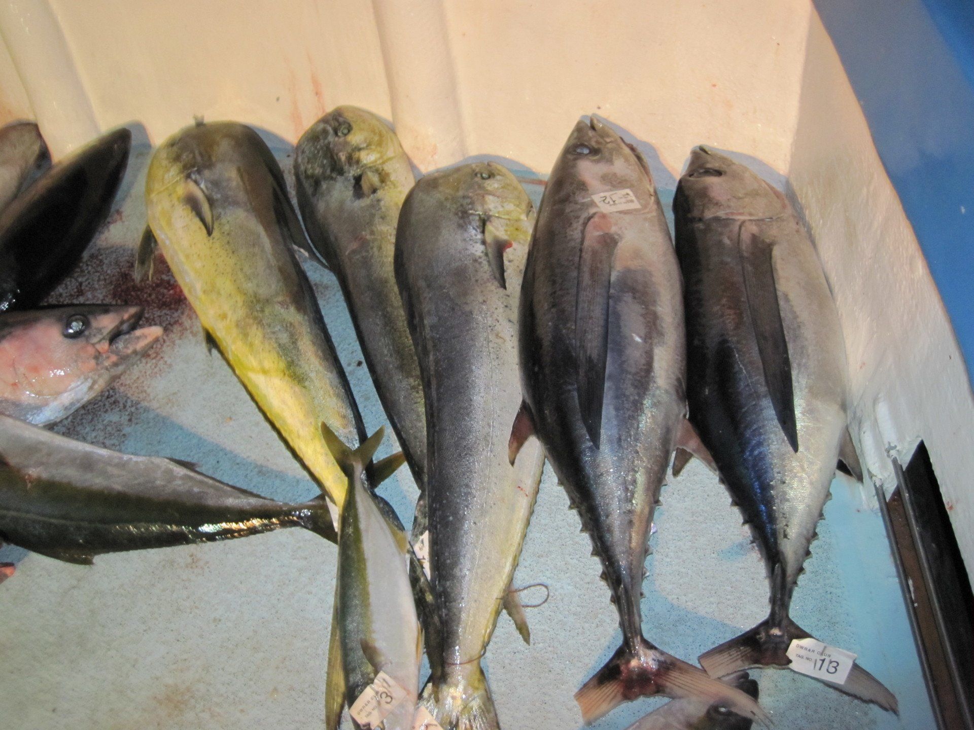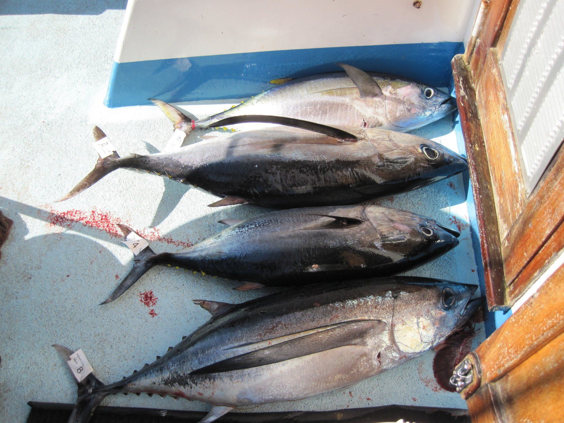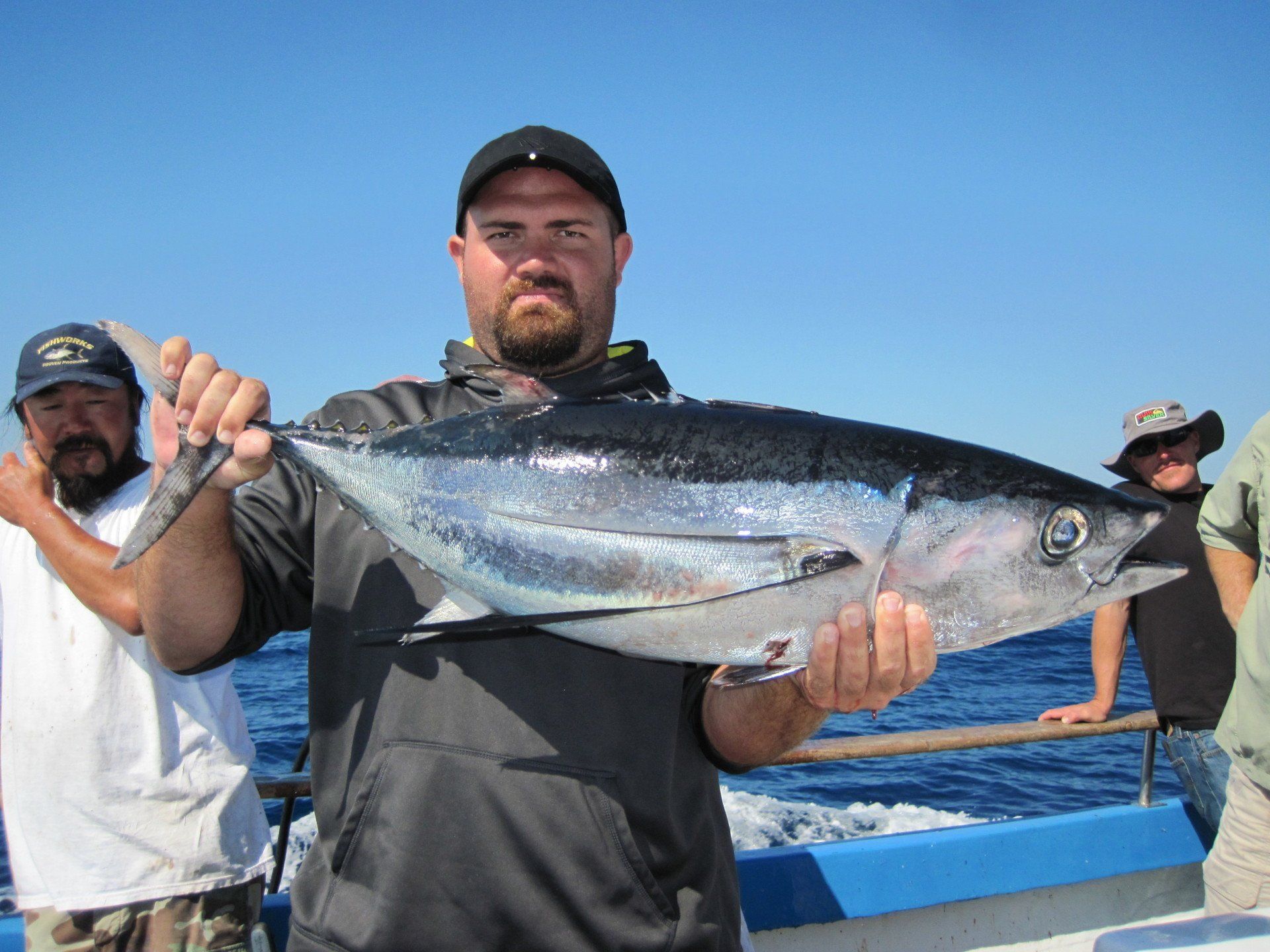 Trip #5: Boat: Thunderbird 2.5 day Departs: Tuesday August 19th Fishing: August 20th, 21th Returns: August 22th am Thunderbird Crew: Jeff Markland- Captain Steve Raby- 2nd Captain Jose, Jared & Nate on deck Goofy in his usual form in the Galley The usual suspects, newer club members and a slew of guests began gathering for the upcoming 2.5-day venture on board the Thunderbird on Tuesday afternoon/evening, a lot of discussion occurred around where will we fish, what is our bait, are we going to fish for tuna, and more importantly, the weather. Forecast was for pretty breezy on the outer banks and tuna grounds with somewhat better at the island. Thursday weather looked much improved everywhere. As it turned out, the weather turned out nice the first day, and even nicer the second day. Also the good news was we would have sardines for bait. When the boat returned from the fuel dock around 7:30, I wandered down to the boat and sat with Jeff and discussed our “options”. There was about 2 scoops of live squid on the boat and the squid at San Clemente Island was available but by jigging. Also, the yellowtail fishing was hit or miss at best early in the cove, and then really nothing to catch the rest of the day unless the bass decided to bite. The tuna grounds were in range to do some night fishing between the days, and daytime fishing was producing smaller fish. The Tanner Bank had the 10-15 lb variety which was spotty, and inside toward SCI were bigger 30-35lb variety with some larger mixed in. Getting bites though would be hard. The Cortez Bank coughed up 100 yellowtail for Jeff a few days before. There was also some white sea bass caught at San Nicholas Island so that was an option. Soooo, one more time, what to do. Jeff decided he will decide when we leave the bait receiver as I said give it your best shot. The final decision, with the weather forecast improving, we would head to the Cortez Bank since there had been some yellowtail there a few days before. And off we went. Travel out was not too bad. Day 1- Arrived at the Cortez Bank around 7:45 am, fished a couple areas for nothing except some of the jumbo bonito, large mackerel and a few bottom dwellers. There was no sign of yellowtail. Where the F**k did they go? Around 10:00am, Jeff pulled the plug and we headed back inside to the tuna grounds, about 30 miles away. Weather was getting much nicer, We ended up picking at the BFT not long after we arrived in the area around 2:00pm and joined “the fleet”. We had one decent plunker drift for 16 BFT, and scratched up 9 more at sundown. As dark fell, we headed into the island to try for the early morning yellowtail fishing at the Lost Point area. Day 1 fish count- 25 BFT, 4 Bonito kept, a few misc bottom dwellers kept JP winner- Bronson Noggle (Cory Steinwand Guest)- 30 plus lb BFT, Patch winner Cory Steinwand- 30 plus lb BFT (it was very close) Day 2- had a few yellowtail bites in the dark and grey light at Lost Point, all nice fish. Headed out after grey light for yesterday’s tuna grounds. Flat calm weather. Worked the area with “the fleet” for a couple of hours and covering a lot of water. Jeff finally pulled the plug and decided to take a gamble and head to the Tanner Bank since there were tuna there a few days before. And the gamble certainly paid off. We were greeted with boiling fish in the chum circle when we arrived, boiling fish on the anchor and steady fishing on the 10-15 lb BFT the rest of the afternoon. We fished a couple deep spots for decent reds and other stuff, one nice ling cod and headed back to the area west of SCI toward San Nicholas Island for some night fishing. We had several stops on spots of fish, and got a few anywhere from 30 plus lbs up to 100lbs. Around midnight, we headed home. We were able to fish that long because by chance, the boat was not scheduled to run a ¾ day trip when we got in, so we got to fish longer. Arrived at the dock around 7:20am, unloaded and that was it. Day 2 fish count- 6 Yellowtail, 40 BFT, 1 Halibut, 2 Barracuda, 100 plus mixed Reds and Rockfish, 1 Ling Cod JP & Patch winner- Cory Steinwand- 102 lb BFT Trip total- 65 BFT, 6 Yellowtail, 1 Halibut, 4 Bonito, 100 plus mixed Reds/Rockfish, 1 Ling Cod The weather for the entire trip was good. Temperature cool both days but very nice. Very little wind to flat calm the entire 2 days. One thing that was troubling was the amount of casualties on these smaller tuna. Seems like most everyone liberated one or two, or more. (We won’t mention my luck!). Small hooks and light line with too much pressure and these little guys were hot! All in all a good time had by all and a very good group of guests on this trip as well. That’s it! Your Scribe- Gary Thompson