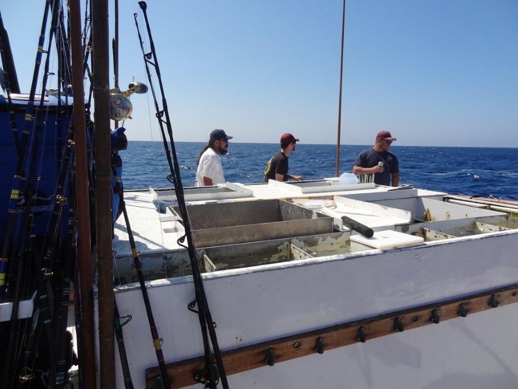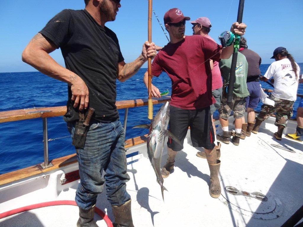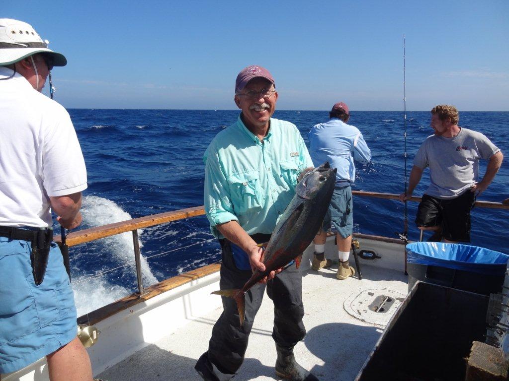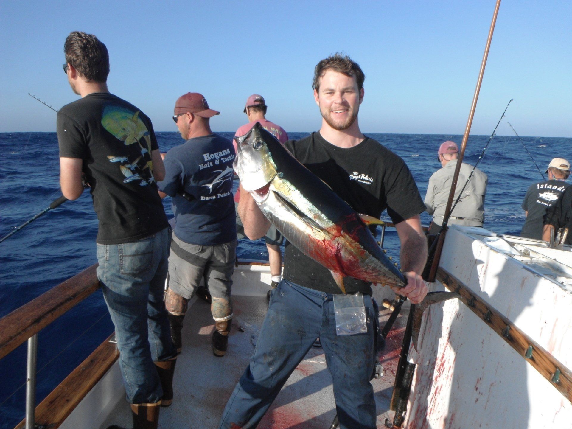 Trip #5: Boat: Thunderbird 2.5 day Departs: Tuesday August 19th Fishing: August 20th, 21th Returns: August 22th am Thunderbird Crew: Jeff Markland- Captain Steve Raby- 2nd Captain Jose, Jared & Nate on deck Goofy in his usual form in the Galley The usual suspects, newer club members and a slew of guests began gathering for the upcoming 2.5-day venture on board the Thunderbird on Tuesday afternoon/evening, a lot of discussion occurred around where will we fish, what is our bait, are we going to fish for tuna, and more importantly, the weather. Forecast was for pretty breezy on the outer banks and tuna grounds with somewhat better at the island. Thursday weather looked much improved everywhere. As it turned out, the weather turned out nice the first day, and even nicer the second day. Also the good news was we would have sardines for bait. When the boat returned from the fuel dock around 7:30, I wandered down to the boat and sat with Jeff and discussed our “options”. There was about 2 scoops of live squid on the boat and the squid at San Clemente Island was available but by jigging. Also, the yellowtail fishing was hit or miss at best early in the cove, and then really nothing to catch the rest of the day unless the bass decided to bite. The tuna grounds were in range to do some night fishing between the days, and daytime fishing was producing smaller fish. The Tanner Bank had the 10-15 lb variety which was spotty, and inside toward SCI were bigger 30-35lb variety with some larger mixed in. Getting bites though would be hard. The Cortez Bank coughed up 100 yellowtail for Jeff a few days before. There was also some white sea bass caught at San Nicholas Island so that was an option. Soooo, one more time, what to do. Jeff decided he will decide when we leave the bait receiver as I said give it your best shot. The final decision, with the weather forecast improving, we would head to the Cortez Bank since there had been some yellowtail there a few days before. And off we went. Travel out was not too bad. Day 1- Arrived at the Cortez Bank around 7:45 am, fished a couple areas for nothing except some of the jumbo bonito, large mackerel and a few bottom dwellers. There was no sign of yellowtail. Where the F**k did they go? Around 10:00am, Jeff pulled the plug and we headed back inside to the tuna grounds, about 30 miles away. Weather was getting much nicer, We ended up picking at the BFT not long after we arrived in the area around 2:00pm and joined “the fleet”. We had one decent plunker drift for 16 BFT, and scratched up 9 more at sundown. As dark fell, we headed into the island to try for the early morning yellowtail fishing at the Lost Point area. Day 1 fish count- 25 BFT, 4 Bonito kept, a few misc bottom dwellers kept JP winner- Bronson Noggle (Cory Steinwand Guest)- 30 plus lb BFT, Patch winner Cory Steinwand- 30 plus lb BFT (it was very close) Day 2- had a few yellowtail bites in the dark and grey light at Lost Point, all nice fish. Headed out after grey light for yesterday’s tuna grounds. Flat calm weather. Worked the area with “the fleet” for a couple of hours and covering a lot of water. Jeff finally pulled the plug and decided to take a gamble and head to the Tanner Bank since there were tuna there a few days before. And the gamble certainly paid off. We were greeted with boiling fish in the chum circle when we arrived, boiling fish on the anchor and steady fishing on the 10-15 lb BFT the rest of the afternoon. We fished a couple deep spots for decent reds and other stuff, one nice ling cod and headed back to the area west of SCI toward San Nicholas Island for some night fishing. We had several stops on spots of fish, and got a few anywhere from 30 plus lbs up to 100lbs. Around midnight, we headed home. We were able to fish that long because by chance, the boat was not scheduled to run a ¾ day trip when we got in, so we got to fish longer. Arrived at the dock around 7:20am, unloaded and that was it. Day 2 fish count- 6 Yellowtail, 40 BFT, 1 Halibut, 2 Barracuda, 100 plus mixed Reds and Rockfish, 1 Ling Cod JP & Patch winner- Cory Steinwand- 102 lb BFT Trip total- 65 BFT, 6 Yellowtail, 1 Halibut, 4 Bonito, 100 plus mixed Reds/Rockfish, 1 Ling Cod The weather for the entire trip was good. Temperature cool both days but very nice. Very little wind to flat calm the entire 2 days. One thing that was troubling was the amount of casualties on these smaller tuna. Seems like most everyone liberated one or two, or more. (We won’t mention my luck!). Small hooks and light line with too much pressure and these little guys were hot! All in all a good time had by all and a very good group of guests on this trip as well. That’s it! Your Scribe- Gary Thompson