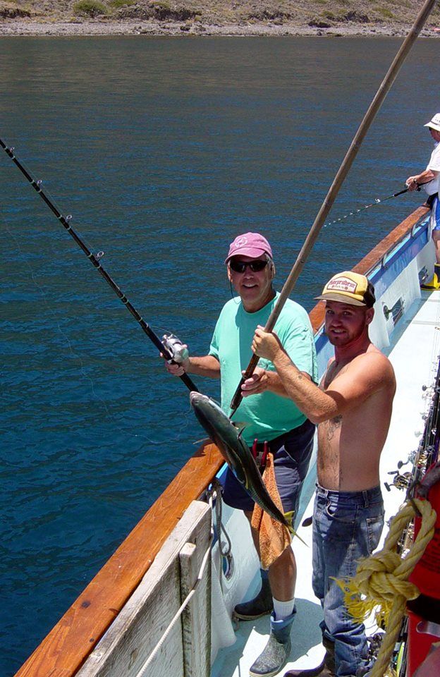 Trip #5: Boat: Thunderbird 2.5 day Departs: Tuesday August 19th Fishing: August 20th, 21th Returns: August 22th am Thunderbird Crew: Jeff Markland- Captain Steve Raby- 2nd Captain Jose, Jared & Nate on deck Goofy in his usual form in the Galley The usual suspects, newer club members and a slew of guests began gathering for the upcoming 2.5-day venture on board the Thunderbird on Tuesday afternoon/evening, a lot of discussion occurred around where will we fish, what is our bait, are we going to fish for tuna, and more importantly, the weather. Forecast was for pretty breezy on the outer banks and tuna grounds with somewhat better at the island. Thursday weather looked much improved everywhere. As it turned out, the weather turned out nice the first day, and even nicer the second day. Also the good news was we would have sardines for bait. When the boat returned from the fuel dock around 7:30, I wandered down to the boat and sat with Jeff and discussed our “options”. There was about 2 scoops of live squid on the boat and the squid at San Clemente Island was available but by jigging. Also, the yellowtail fishing was hit or miss at best early in the cove, and then really nothing to catch the rest of the day unless the bass decided to bite. The tuna grounds were in range to do some night fishing between the days, and daytime fishing was producing smaller fish. The Tanner Bank had the 10-15 lb variety which was spotty, and inside toward SCI were bigger 30-35lb variety with some larger mixed in. Getting bites though would be hard. The Cortez Bank coughed up 100 yellowtail for Jeff a few days before. There was also some white sea bass caught at San Nicholas Island so that was an option. Soooo, one more time, what to do. Jeff decided he will decide when we leave the bait receiver as I said give it your best shot. The final decision, with the weather forecast improving, we would head to the Cortez Bank since there had been some yellowtail there a few days before. And off we went. Travel out was not too bad. Day 1- Arrived at the Cortez Bank around 7:45 am, fished a couple areas for nothing except some of the jumbo bonito, large mackerel and a few bottom dwellers. There was no sign of yellowtail. Where the F**k did they go? Around 10:00am, Jeff pulled the plug and we headed back inside to the tuna grounds, about 30 miles away. Weather was getting much nicer, We ended up picking at the BFT not long after we arrived in the area around 2:00pm and joined “the fleet”. We had one decent plunker drift for 16 BFT, and scratched up 9 more at sundown. As dark fell, we headed into the island to try for the early morning yellowtail fishing at the Lost Point area. Day 1 fish count- 25 BFT, 4 Bonito kept, a few misc bottom dwellers kept JP winner- Bronson Noggle (Cory Steinwand Guest)- 30 plus lb BFT, Patch winner Cory Steinwand- 30 plus lb BFT (it was very close) Day 2- had a few yellowtail bites in the dark and grey light at Lost Point, all nice fish. Headed out after grey light for yesterday’s tuna grounds. Flat calm weather. Worked the area with “the fleet” for a couple of hours and covering a lot of water. Jeff finally pulled the plug and decided to take a gamble and head to the Tanner Bank since there were tuna there a few days before. And the gamble certainly paid off. We were greeted with boiling fish in the chum circle when we arrived, boiling fish on the anchor and steady fishing on the 10-15 lb BFT the rest of the afternoon. We fished a couple deep spots for decent reds and other stuff, one nice ling cod and headed back to the area west of SCI toward San Nicholas Island for some night fishing. We had several stops on spots of fish, and got a few anywhere from 30 plus lbs up to 100lbs. Around midnight, we headed home. We were able to fish that long because by chance, the boat was not scheduled to run a ¾ day trip when we got in, so we got to fish longer. Arrived at the dock around 7:20am, unloaded and that was it. Day 2 fish count- 6 Yellowtail, 40 BFT, 1 Halibut, 2 Barracuda, 100 plus mixed Reds and Rockfish, 1 Ling Cod JP & Patch winner- Cory Steinwand- 102 lb BFT Trip total- 65 BFT, 6 Yellowtail, 1 Halibut, 4 Bonito, 100 plus mixed Reds/Rockfish, 1 Ling Cod The weather for the entire trip was good. Temperature cool both days but very nice. Very little wind to flat calm the entire 2 days. One thing that was troubling was the amount of casualties on these smaller tuna. Seems like most everyone liberated one or two, or more. (We won’t mention my luck!). Small hooks and light line with too much pressure and these little guys were hot! All in all a good time had by all and a very good group of guests on this trip as well. That’s it! Your Scribe- Gary Thompson