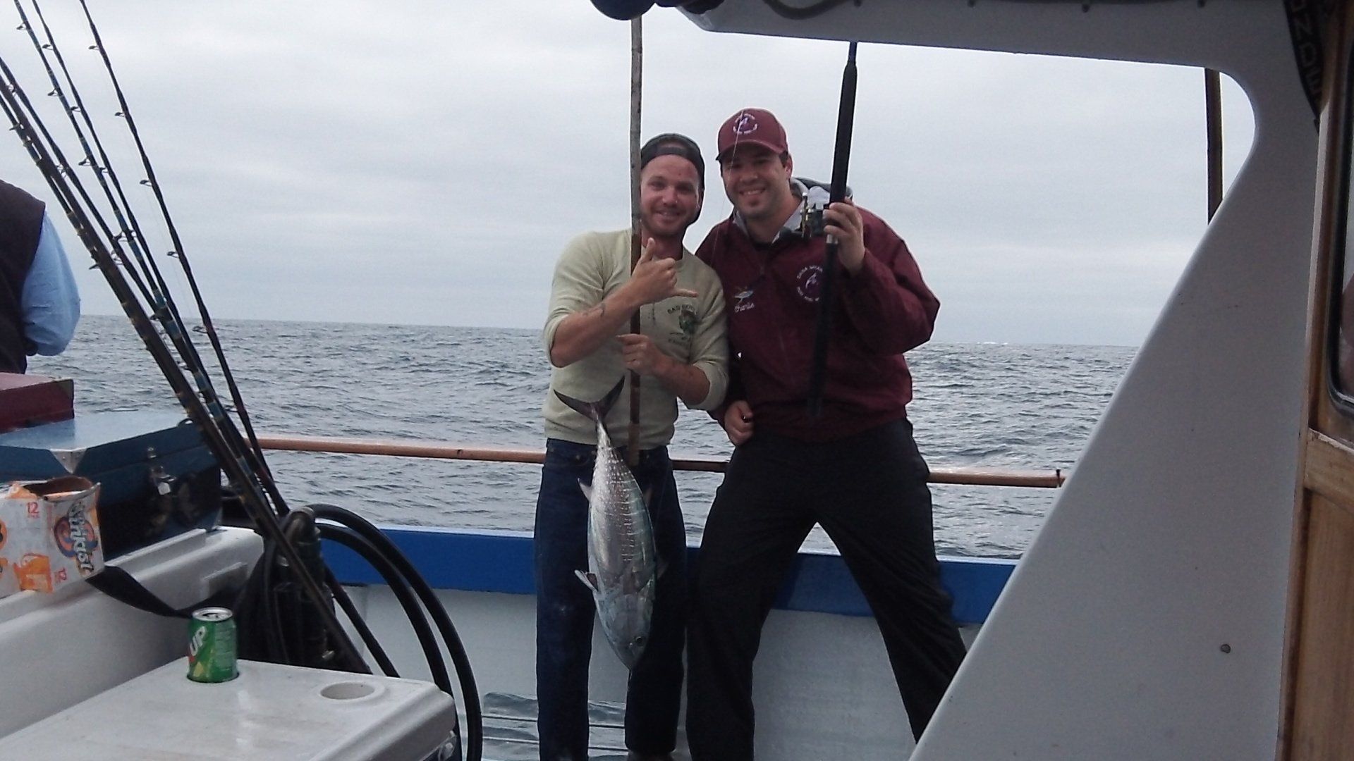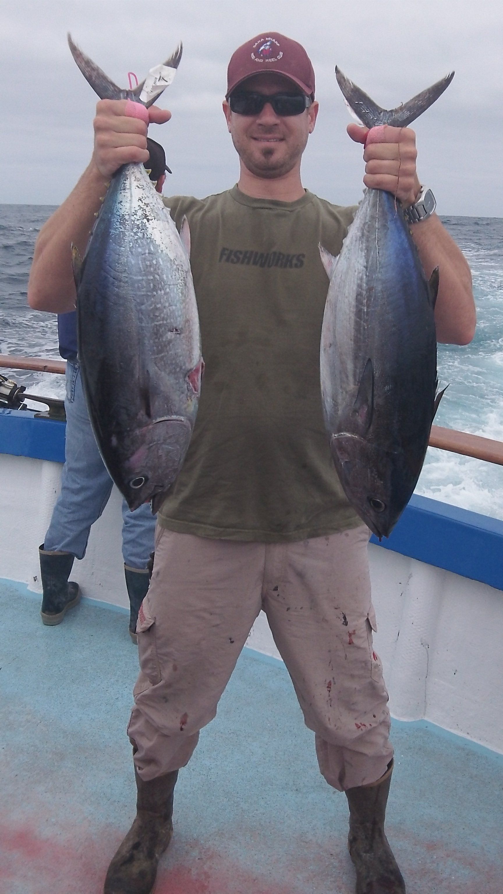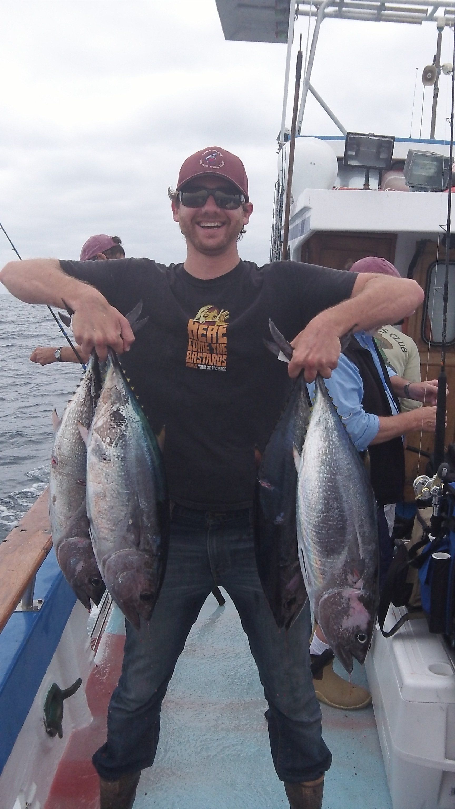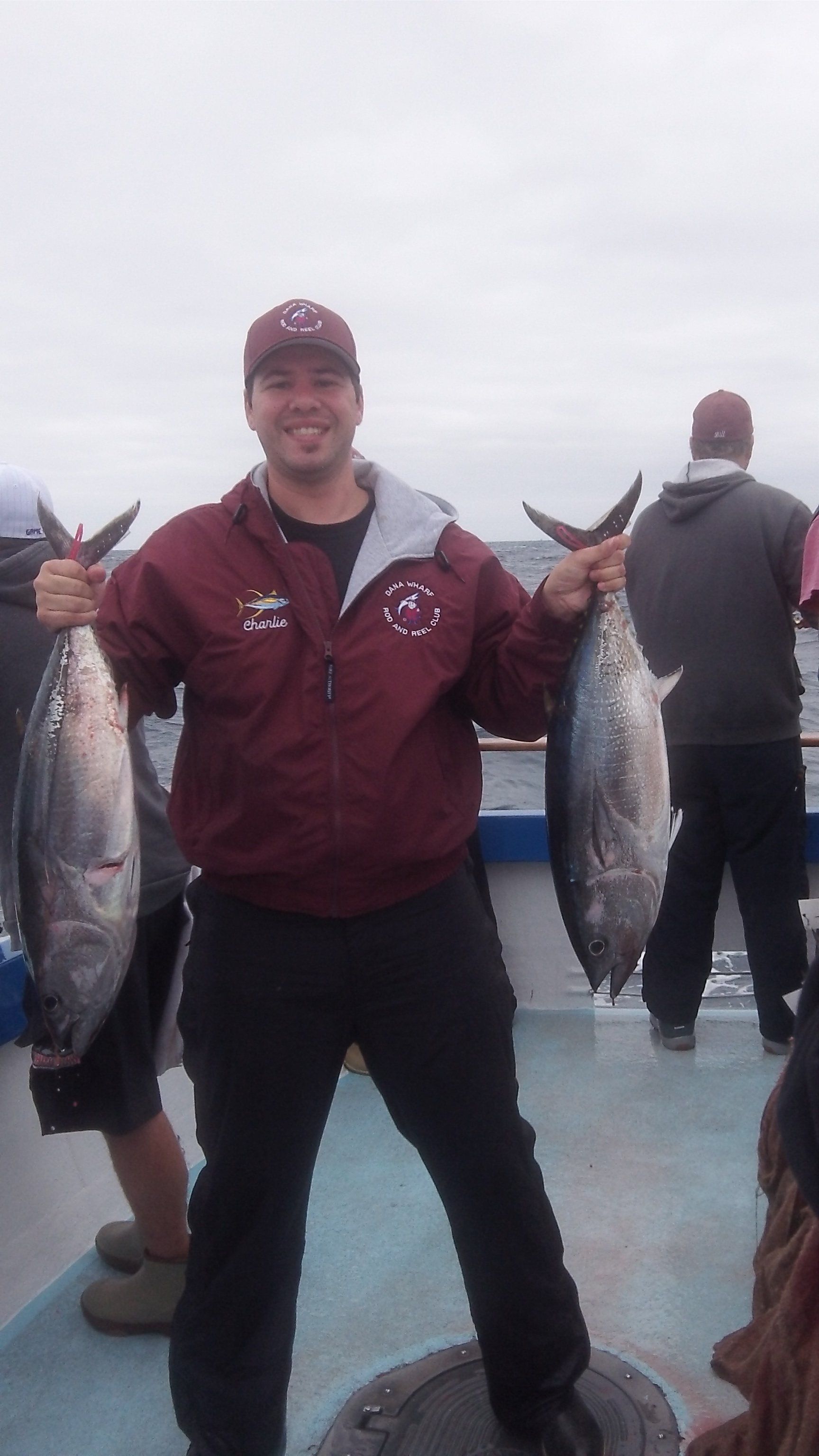 Trip #5: Boat: Thunderbird 2.5 day Departs: Tuesday August 19th Fishing: August 20th, 21th Returns: August 22th am Thunderbird Crew: Jeff Markland- Captain Steve Raby- 2nd Captain Jose, Jared & Nate on deck Goofy in his usual form in the Galley The usual suspects, newer club members and a slew of guests began gathering for the upcoming 2.5-day venture on board the Thunderbird on Tuesday afternoon/evening, a lot of discussion occurred around where will we fish, what is our bait, are we going to fish for tuna, and more importantly, the weather. Forecast was for pretty breezy on the outer banks and tuna grounds with somewhat better at the island. Thursday weather looked much improved everywhere. As it turned out, the weather turned out nice the first day, and even nicer the second day. Also the good news was we would have sardines for bait. When the boat returned from the fuel dock around 7:30, I wandered down to the boat and sat with Jeff and discussed our “options”. There was about 2 scoops of live squid on the boat and the squid at San Clemente Island was available but by jigging. Also, the yellowtail fishing was hit or miss at best early in the cove, and then really nothing to catch the rest of the day unless the bass decided to bite. The tuna grounds were in range to do some night fishing between the days, and daytime fishing was producing smaller fish. The Tanner Bank had the 10-15 lb variety which was spotty, and inside toward SCI were bigger 30-35lb variety with some larger mixed in. Getting bites though would be hard. The Cortez Bank coughed up 100 yellowtail for Jeff a few days before. There was also some white sea bass caught at San Nicholas Island so that was an option. Soooo, one more time, what to do. Jeff decided he will decide when we leave the bait receiver as I said give it your best shot. The final decision, with the weather forecast improving, we would head to the Cortez Bank since there had been some yellowtail there a few days before. And off we went. Travel out was not too bad. Day 1- Arrived at the Cortez Bank around 7:45 am, fished a couple areas for nothing except some of the jumbo bonito, large mackerel and a few bottom dwellers. There was no sign of yellowtail. Where the F**k did they go? Around 10:00am, Jeff pulled the plug and we headed back inside to the tuna grounds, about 30 miles away. Weather was getting much nicer, We ended up picking at the BFT not long after we arrived in the area around 2:00pm and joined “the fleet”. We had one decent plunker drift for 16 BFT, and scratched up 9 more at sundown. As dark fell, we headed into the island to try for the early morning yellowtail fishing at the Lost Point area. Day 1 fish count- 25 BFT, 4 Bonito kept, a few misc bottom dwellers kept JP winner- Bronson Noggle (Cory Steinwand Guest)- 30 plus lb BFT, Patch winner Cory Steinwand- 30 plus lb BFT (it was very close) Day 2- had a few yellowtail bites in the dark and grey light at Lost Point, all nice fish. Headed out after grey light for yesterday’s tuna grounds. Flat calm weather. Worked the area with “the fleet” for a couple of hours and covering a lot of water. Jeff finally pulled the plug and decided to take a gamble and head to the Tanner Bank since there were tuna there a few days before. And the gamble certainly paid off. We were greeted with boiling fish in the chum circle when we arrived, boiling fish on the anchor and steady fishing on the 10-15 lb BFT the rest of the afternoon. We fished a couple deep spots for decent reds and other stuff, one nice ling cod and headed back to the area west of SCI toward San Nicholas Island for some night fishing. We had several stops on spots of fish, and got a few anywhere from 30 plus lbs up to 100lbs. Around midnight, we headed home. We were able to fish that long because by chance, the boat was not scheduled to run a ¾ day trip when we got in, so we got to fish longer. Arrived at the dock around 7:20am, unloaded and that was it. Day 2 fish count- 6 Yellowtail, 40 BFT, 1 Halibut, 2 Barracuda, 100 plus mixed Reds and Rockfish, 1 Ling Cod JP & Patch winner- Cory Steinwand- 102 lb BFT Trip total- 65 BFT, 6 Yellowtail, 1 Halibut, 4 Bonito, 100 plus mixed Reds/Rockfish, 1 Ling Cod The weather for the entire trip was good. Temperature cool both days but very nice. Very little wind to flat calm the entire 2 days. One thing that was troubling was the amount of casualties on these smaller tuna. Seems like most everyone liberated one or two, or more. (We won’t mention my luck!). Small hooks and light line with too much pressure and these little guys were hot! All in all a good time had by all and a very good group of guests on this trip as well. That’s it! Your Scribe- Gary Thompson