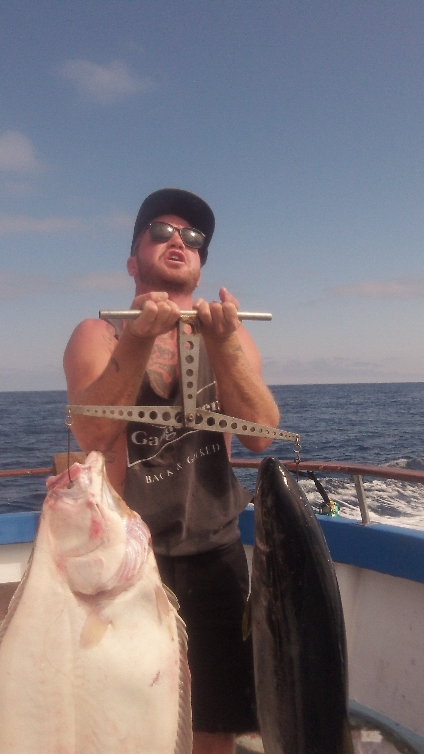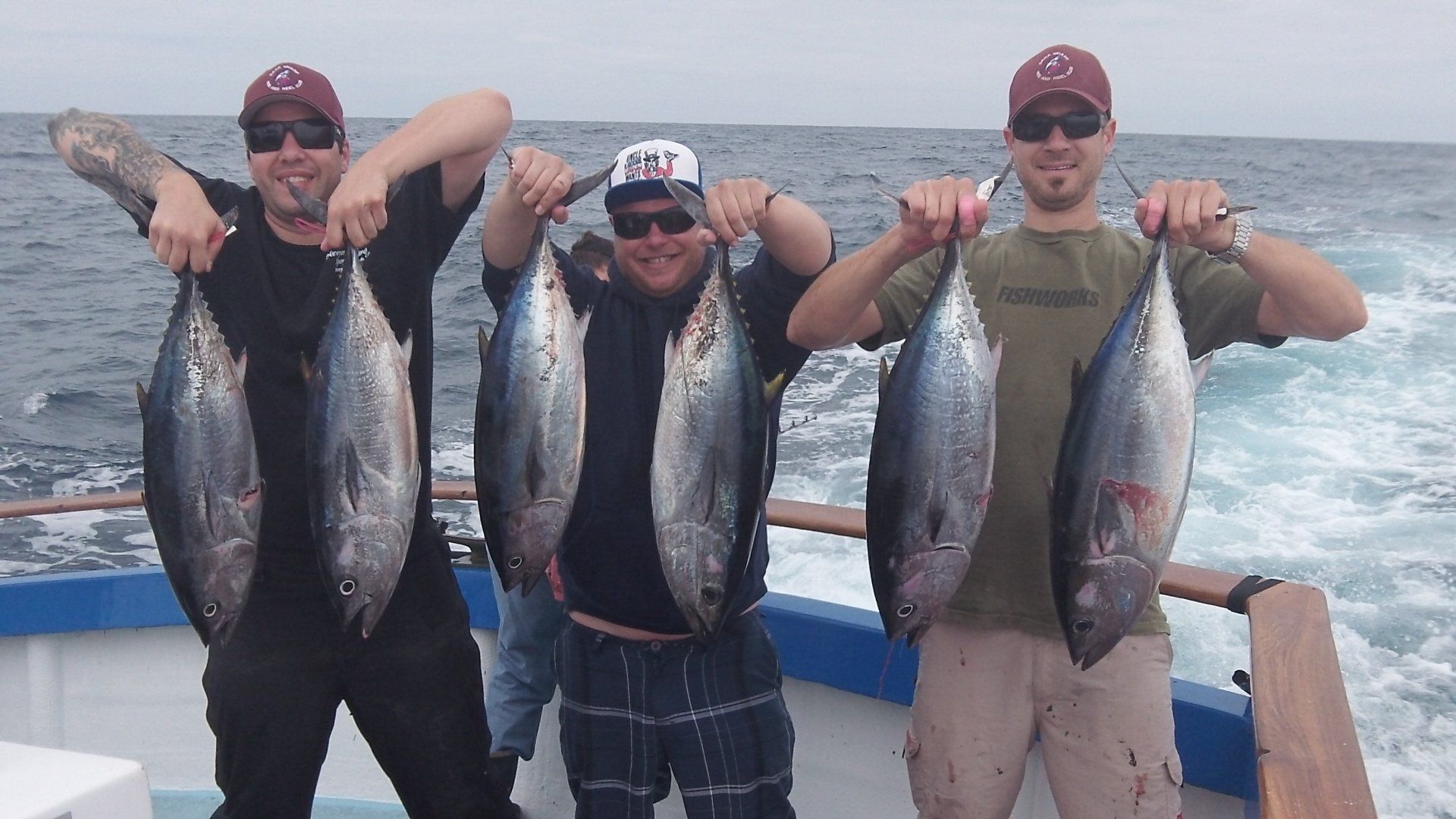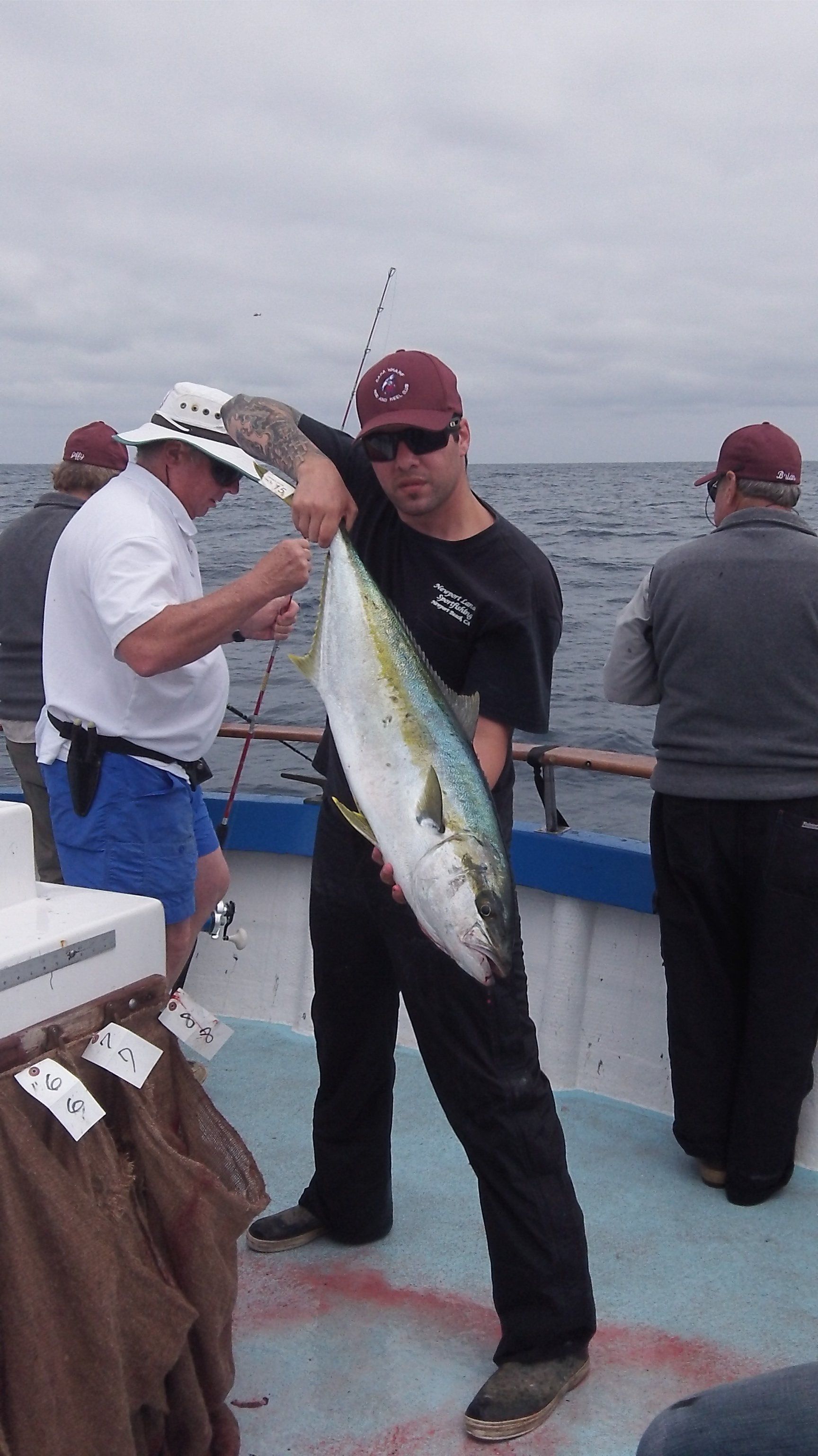 Trip #5: Boat: Thunderbird 2.5 day Departs: Tuesday August 19th Fishing: August 20th, 21th Returns: August 22th am Thunderbird Crew: Jeff Markland- Captain Steve Raby- 2nd Captain Jose, Jared & Nate on deck Goofy in his usual form in the Galley The usual suspects, newer club members and a slew of guests began gathering for the upcoming 2.5-day venture on board the Thunderbird on Tuesday afternoon/evening, a lot of discussion occurred around where will we fish, what is our bait, are we going to fish for tuna, and more importantly, the weather. Forecast was for pretty breezy on the outer banks and tuna grounds with somewhat better at the island. Thursday weather looked much improved everywhere. As it turned out, the weather turned out nice the first day, and even nicer the second day. Also the good news was we would have sardines for bait. When the boat returned from the fuel dock around 7:30, I wandered down to the boat and sat with Jeff and discussed our “options”. There was about 2 scoops of live squid on the boat and the squid at San Clemente Island was available but by jigging. Also, the yellowtail fishing was hit or miss at best early in the cove, and then really nothing to catch the rest of the day unless the bass decided to bite. The tuna grounds were in range to do some night fishing between the days, and daytime fishing was producing smaller fish. The Tanner Bank had the 10-15 lb variety which was spotty, and inside toward SCI were bigger 30-35lb variety with some larger mixed in. Getting bites though would be hard. The Cortez Bank coughed up 100 yellowtail for Jeff a few days before. There was also some white sea bass caught at San Nicholas Island so that was an option. Soooo, one more time, what to do. Jeff decided he will decide when we leave the bait receiver as I said give it your best shot. The final decision, with the weather forecast improving, we would head to the Cortez Bank since there had been some yellowtail there a few days before. And off we went. Travel out was not too bad. Day 1- Arrived at the Cortez Bank around 7:45 am, fished a couple areas for nothing except some of the jumbo bonito, large mackerel and a few bottom dwellers. There was no sign of yellowtail. Where the F**k did they go? Around 10:00am, Jeff pulled the plug and we headed back inside to the tuna grounds, about 30 miles away. Weather was getting much nicer, We ended up picking at the BFT not long after we arrived in the area around 2:00pm and joined “the fleet”. We had one decent plunker drift for 16 BFT, and scratched up 9 more at sundown. As dark fell, we headed into the island to try for the early morning yellowtail fishing at the Lost Point area. Day 1 fish count- 25 BFT, 4 Bonito kept, a few misc bottom dwellers kept JP winner- Bronson Noggle (Cory Steinwand Guest)- 30 plus lb BFT, Patch winner Cory Steinwand- 30 plus lb BFT (it was very close) Day 2- had a few yellowtail bites in the dark and grey light at Lost Point, all nice fish. Headed out after grey light for yesterday’s tuna grounds. Flat calm weather. Worked the area with “the fleet” for a couple of hours and covering a lot of water. Jeff finally pulled the plug and decided to take a gamble and head to the Tanner Bank since there were tuna there a few days before. And the gamble certainly paid off. We were greeted with boiling fish in the chum circle when we arrived, boiling fish on the anchor and steady fishing on the 10-15 lb BFT the rest of the afternoon. We fished a couple deep spots for decent reds and other stuff, one nice ling cod and headed back to the area west of SCI toward San Nicholas Island for some night fishing. We had several stops on spots of fish, and got a few anywhere from 30 plus lbs up to 100lbs. Around midnight, we headed home. We were able to fish that long because by chance, the boat was not scheduled to run a ¾ day trip when we got in, so we got to fish longer. Arrived at the dock around 7:20am, unloaded and that was it. Day 2 fish count- 6 Yellowtail, 40 BFT, 1 Halibut, 2 Barracuda, 100 plus mixed Reds and Rockfish, 1 Ling Cod JP & Patch winner- Cory Steinwand- 102 lb BFT Trip total- 65 BFT, 6 Yellowtail, 1 Halibut, 4 Bonito, 100 plus mixed Reds/Rockfish, 1 Ling Cod The weather for the entire trip was good. Temperature cool both days but very nice. Very little wind to flat calm the entire 2 days. One thing that was troubling was the amount of casualties on these smaller tuna. Seems like most everyone liberated one or two, or more. (We won’t mention my luck!). Small hooks and light line with too much pressure and these little guys were hot! All in all a good time had by all and a very good group of guests on this trip as well. That’s it! Your Scribe- Gary Thompson