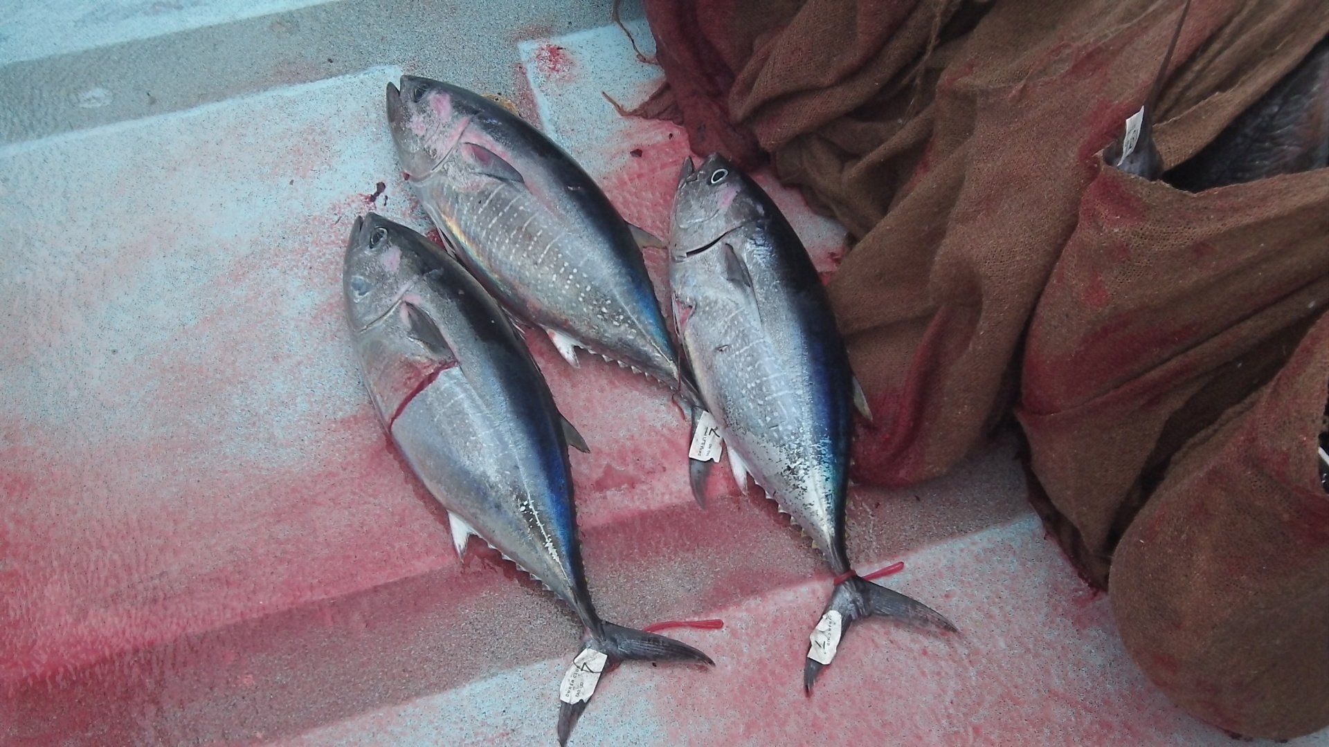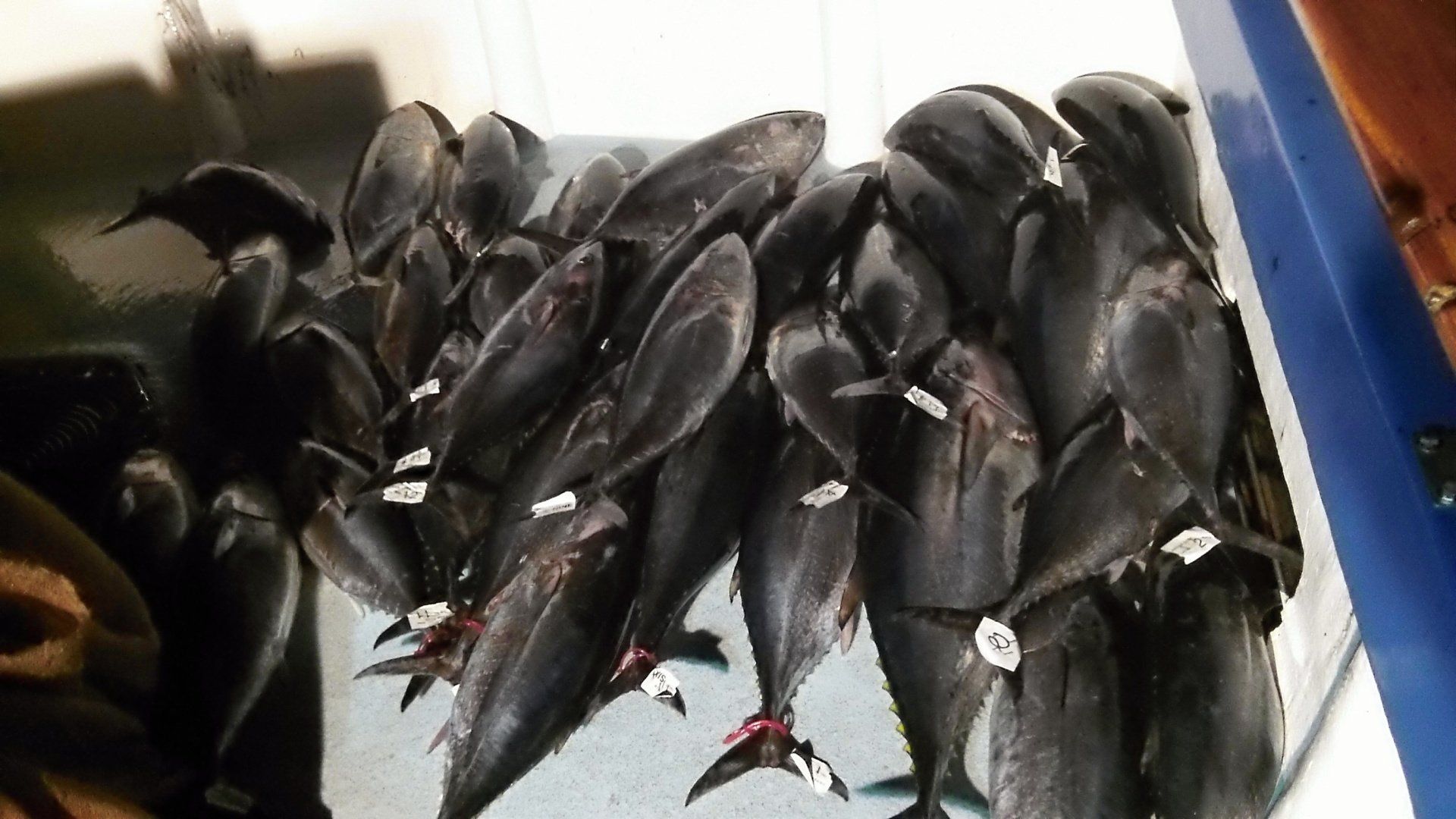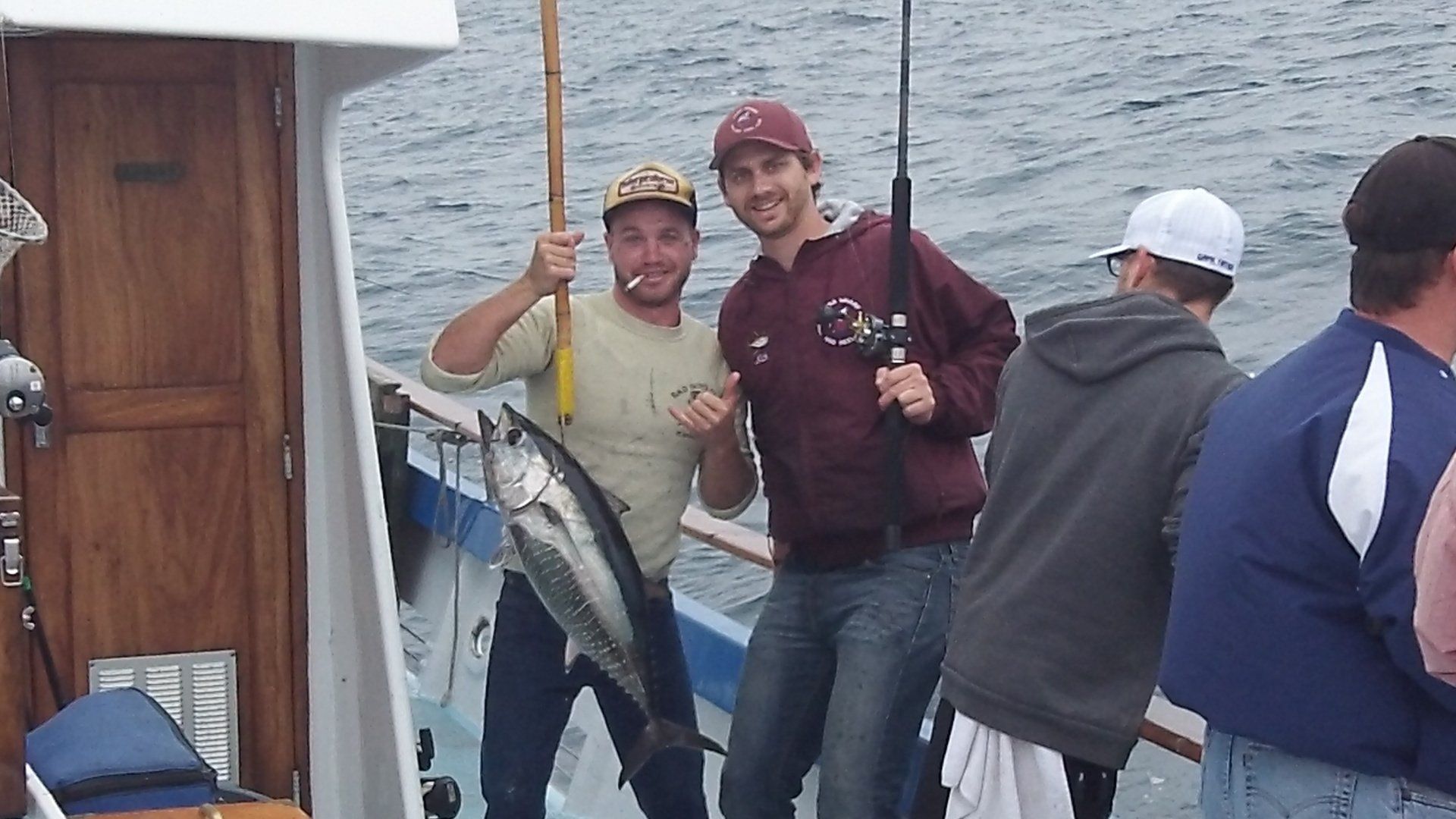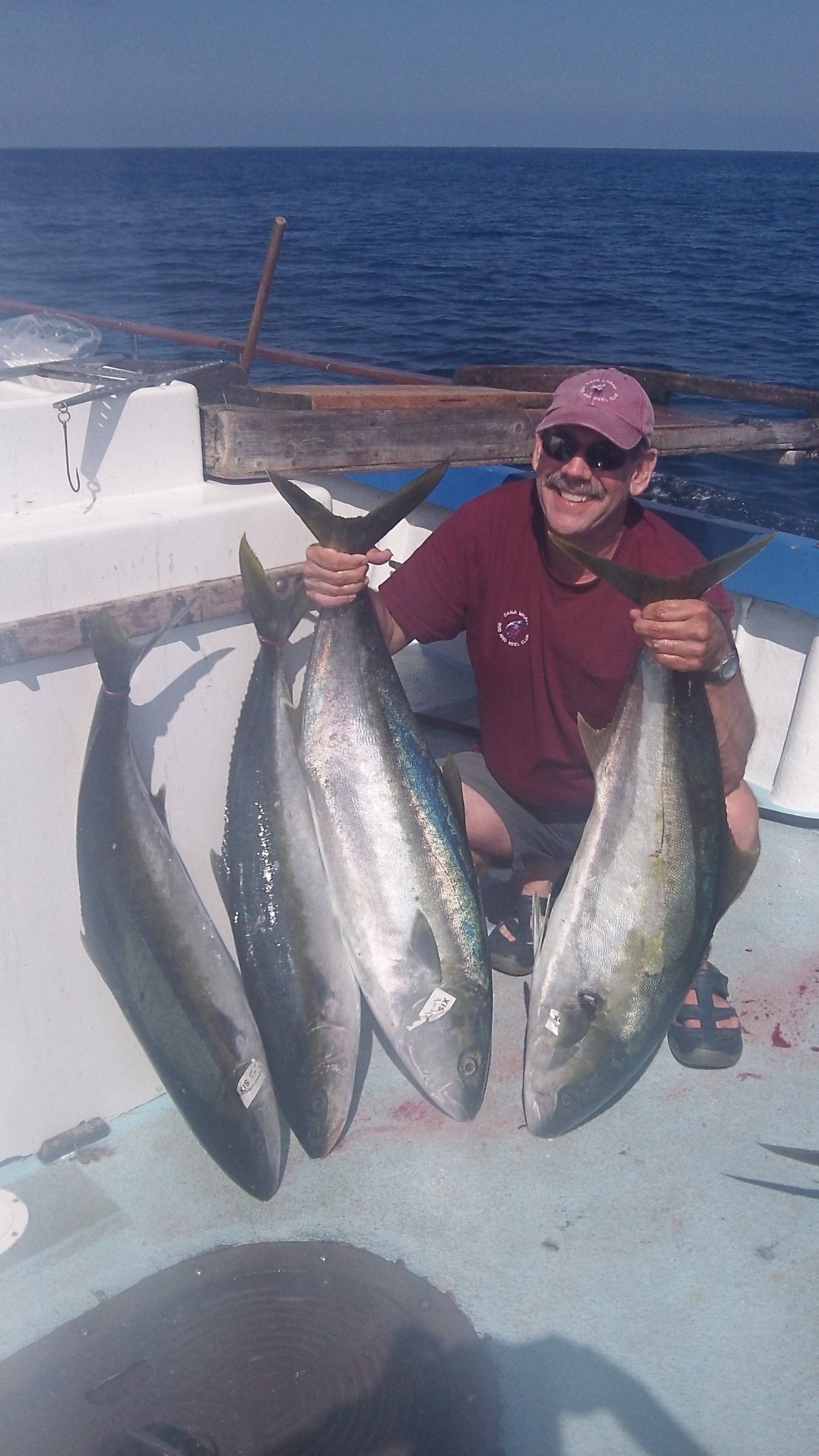 Trip #5: Boat: Thunderbird 2.5 day Departs: Tuesday August 19th Fishing: August 20th, 21th Returns: August 22th am Thunderbird Crew: Jeff Markland- Captain Steve Raby- 2nd Captain Jose, Jared & Nate on deck Goofy in his usual form in the Galley The usual suspects, newer club members and a slew of guests began gathering for the upcoming 2.5-day venture on board the Thunderbird on Tuesday afternoon/evening, a lot of discussion occurred around where will we fish, what is our bait, are we going to fish for tuna, and more importantly, the weather. Forecast was for pretty breezy on the outer banks and tuna grounds with somewhat better at the island. Thursday weather looked much improved everywhere. As it turned out, the weather turned out nice the first day, and even nicer the second day. Also the good news was we would have sardines for bait. When the boat returned from the fuel dock around 7:30, I wandered down to the boat and sat with Jeff and discussed our “options”. There was about 2 scoops of live squid on the boat and the squid at San Clemente Island was available but by jigging. Also, the yellowtail fishing was hit or miss at best early in the cove, and then really nothing to catch the rest of the day unless the bass decided to bite. The tuna grounds were in range to do some night fishing between the days, and daytime fishing was producing smaller fish. The Tanner Bank had the 10-15 lb variety which was spotty, and inside toward SCI were bigger 30-35lb variety with some larger mixed in. Getting bites though would be hard. The Cortez Bank coughed up 100 yellowtail for Jeff a few days before. There was also some white sea bass caught at San Nicholas Island so that was an option. Soooo, one more time, what to do. Jeff decided he will decide when we leave the bait receiver as I said give it your best shot. The final decision, with the weather forecast improving, we would head to the Cortez Bank since there had been some yellowtail there a few days before. And off we went. Travel out was not too bad. Day 1- Arrived at the Cortez Bank around 7:45 am, fished a couple areas for nothing except some of the jumbo bonito, large mackerel and a few bottom dwellers. There was no sign of yellowtail. Where the F**k did they go? Around 10:00am, Jeff pulled the plug and we headed back inside to the tuna grounds, about 30 miles away. Weather was getting much nicer, We ended up picking at the BFT not long after we arrived in the area around 2:00pm and joined “the fleet”. We had one decent plunker drift for 16 BFT, and scratched up 9 more at sundown. As dark fell, we headed into the island to try for the early morning yellowtail fishing at the Lost Point area. Day 1 fish count- 25 BFT, 4 Bonito kept, a few misc bottom dwellers kept JP winner- Bronson Noggle (Cory Steinwand Guest)- 30 plus lb BFT, Patch winner Cory Steinwand- 30 plus lb BFT (it was very close) Day 2- had a few yellowtail bites in the dark and grey light at Lost Point, all nice fish. Headed out after grey light for yesterday’s tuna grounds. Flat calm weather. Worked the area with “the fleet” for a couple of hours and covering a lot of water. Jeff finally pulled the plug and decided to take a gamble and head to the Tanner Bank since there were tuna there a few days before. And the gamble certainly paid off. We were greeted with boiling fish in the chum circle when we arrived, boiling fish on the anchor and steady fishing on the 10-15 lb BFT the rest of the afternoon. We fished a couple deep spots for decent reds and other stuff, one nice ling cod and headed back to the area west of SCI toward San Nicholas Island for some night fishing. We had several stops on spots of fish, and got a few anywhere from 30 plus lbs up to 100lbs. Around midnight, we headed home. We were able to fish that long because by chance, the boat was not scheduled to run a ¾ day trip when we got in, so we got to fish longer. Arrived at the dock around 7:20am, unloaded and that was it. Day 2 fish count- 6 Yellowtail, 40 BFT, 1 Halibut, 2 Barracuda, 100 plus mixed Reds and Rockfish, 1 Ling Cod JP & Patch winner- Cory Steinwand- 102 lb BFT Trip total- 65 BFT, 6 Yellowtail, 1 Halibut, 4 Bonito, 100 plus mixed Reds/Rockfish, 1 Ling Cod The weather for the entire trip was good. Temperature cool both days but very nice. Very little wind to flat calm the entire 2 days. One thing that was troubling was the amount of casualties on these smaller tuna. Seems like most everyone liberated one or two, or more. (We won’t mention my luck!). Small hooks and light line with too much pressure and these little guys were hot! All in all a good time had by all and a very good group of guests on this trip as well. That’s it! Your Scribe- Gary Thompson