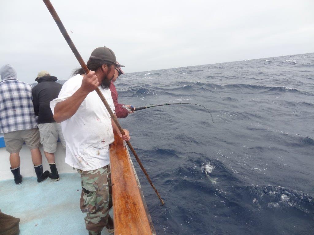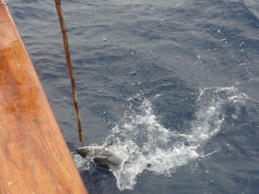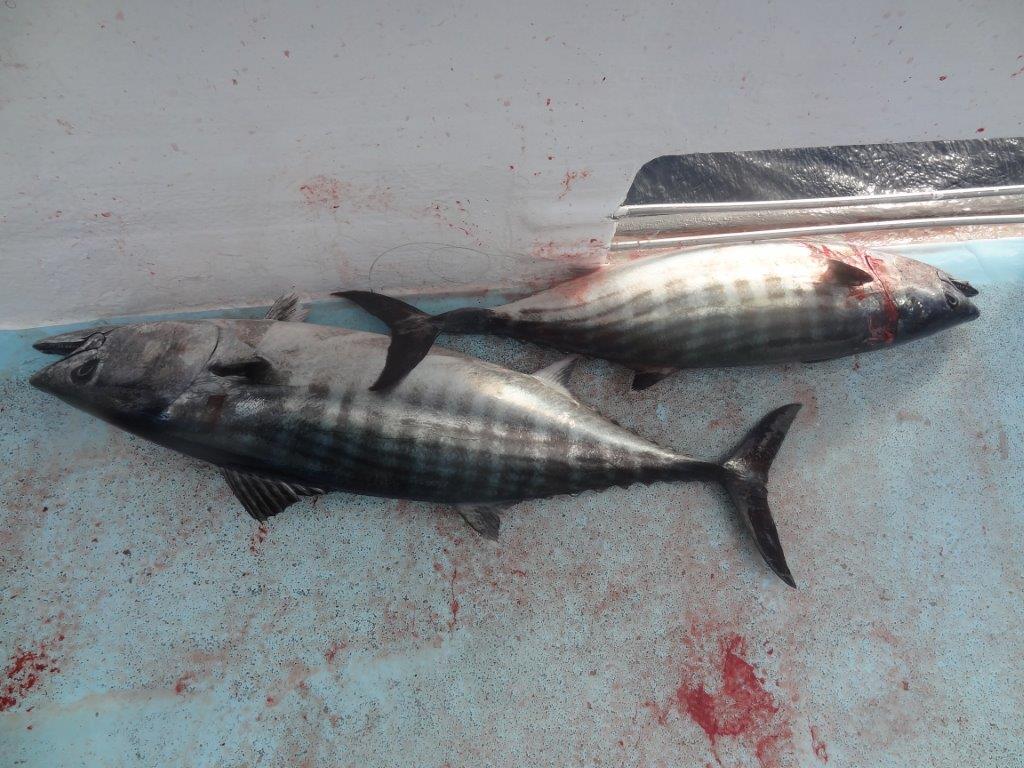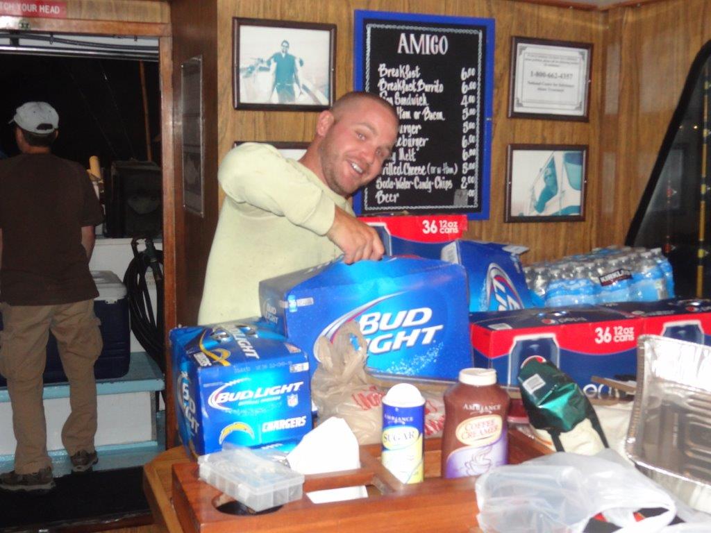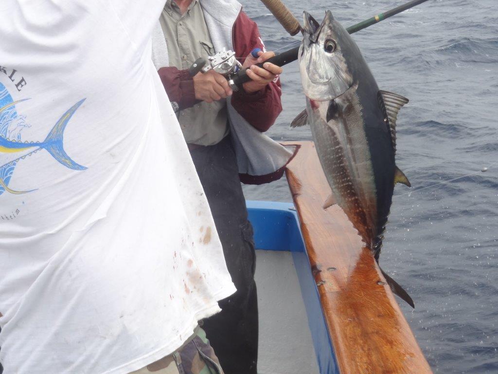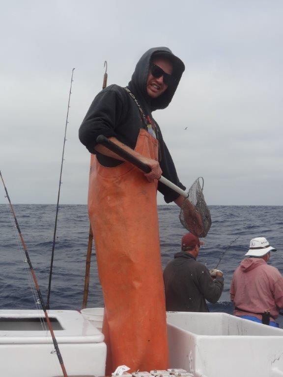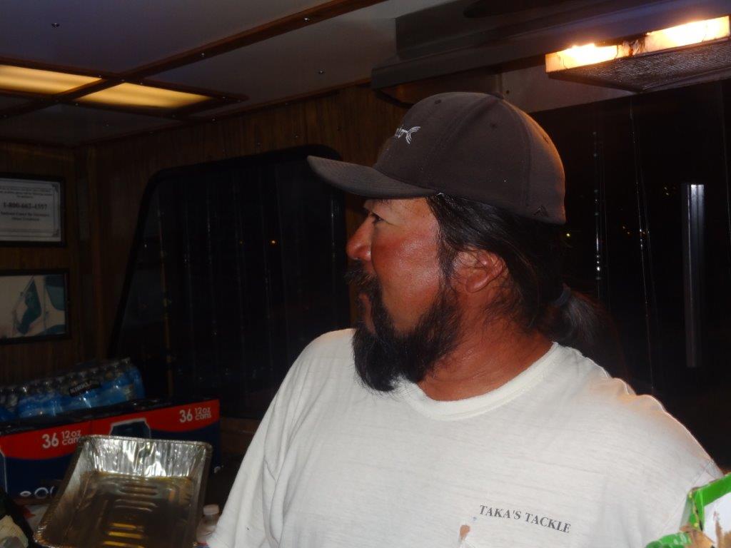 Trip #5: Boat: Thunderbird 2.5 day Departs: Tuesday August 19th Fishing: August 20th, 21th Returns: August 22th am Thunderbird Crew: Jeff Markland- Captain Steve Raby- 2nd Captain Jose, Jared & Nate on deck Goofy in his usual form in the Galley The usual suspects, newer club members and a slew of guests began gathering for the upcoming 2.5-day venture on board the Thunderbird on Tuesday afternoon/evening, a lot of discussion occurred around where will we fish, what is our bait, are we going to fish for tuna, and more importantly, the weather. Forecast was for pretty breezy on the outer banks and tuna grounds with somewhat better at the island. Thursday weather looked much improved everywhere. As it turned out, the weather turned out nice the first day, and even nicer the second day. Also the good news was we would have sardines for bait. When the boat returned from the fuel dock around 7:30, I wandered down to the boat and sat with Jeff and discussed our “options”. There was about 2 scoops of live squid on the boat and the squid at San Clemente Island was available but by jigging. Also, the yellowtail fishing was hit or miss at best early in the cove, and then really nothing to catch the rest of the day unless the bass decided to bite. The tuna grounds were in range to do some night fishing between the days, and daytime fishing was producing smaller fish. The Tanner Bank had the 10-15 lb variety which was spotty, and inside toward SCI were bigger 30-35lb variety with some larger mixed in. Getting bites though would be hard. The Cortez Bank coughed up 100 yellowtail for Jeff a few days before. There was also some white sea bass caught at San Nicholas Island so that was an option. Soooo, one more time, what to do. Jeff decided he will decide when we leave the bait receiver as I said give it your best shot. The final decision, with the weather forecast improving, we would head to the Cortez Bank since there had been some yellowtail there a few days before. And off we went. Travel out was not too bad. Day 1- Arrived at the Cortez Bank around 7:45 am, fished a couple areas for nothing except some of the jumbo bonito, large mackerel and a few bottom dwellers. There was no sign of yellowtail. Where the F**k did they go? Around 10:00am, Jeff pulled the plug and we headed back inside to the tuna grounds, about 30 miles away. Weather was getting much nicer, We ended up picking at the BFT not long after we arrived in the area around 2:00pm and joined “the fleet”. We had one decent plunker drift for 16 BFT, and scratched up 9 more at sundown. As dark fell, we headed into the island to try for the early morning yellowtail fishing at the Lost Point area. Day 1 fish count- 25 BFT, 4 Bonito kept, a few misc bottom dwellers kept JP winner- Bronson Noggle (Cory Steinwand Guest)- 30 plus lb BFT, Patch winner Cory Steinwand- 30 plus lb BFT (it was very close) Day 2- had a few yellowtail bites in the dark and grey light at Lost Point, all nice fish. Headed out after grey light for yesterday’s tuna grounds. Flat calm weather. Worked the area with “the fleet” for a couple of hours and covering a lot of water. Jeff finally pulled the plug and decided to take a gamble and head to the Tanner Bank since there were tuna there a few days before. And the gamble certainly paid off. We were greeted with boiling fish in the chum circle when we arrived, boiling fish on the anchor and steady fishing on the 10-15 lb BFT the rest of the afternoon. We fished a couple deep spots for decent reds and other stuff, one nice ling cod and headed back to the area west of SCI toward San Nicholas Island for some night fishing. We had several stops on spots of fish, and got a few anywhere from 30 plus lbs up to 100lbs. Around midnight, we headed home. We were able to fish that long because by chance, the boat was not scheduled to run a ¾ day trip when we got in, so we got to fish longer. Arrived at the dock around 7:20am, unloaded and that was it. Day 2 fish count- 6 Yellowtail, 40 BFT, 1 Halibut, 2 Barracuda, 100 plus mixed Reds and Rockfish, 1 Ling Cod JP & Patch winner- Cory Steinwand- 102 lb BFT Trip total- 65 BFT, 6 Yellowtail, 1 Halibut, 4 Bonito, 100 plus mixed Reds/Rockfish, 1 Ling Cod The weather for the entire trip was good. Temperature cool both days but very nice. Very little wind to flat calm the entire 2 days. One thing that was troubling was the amount of casualties on these smaller tuna. Seems like most everyone liberated one or two, or more. (We won’t mention my luck!). Small hooks and light line with too much pressure and these little guys were hot! All in all a good time had by all and a very good group of guests on this trip as well. That’s it! Your Scribe- Gary Thompson