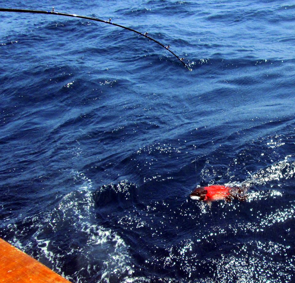 By about 7:15 am, the Amigo relocates to another position on the Nine. We are about five miles from the Cortez buoy. Fishing starts in earnest. Iron jigs and mackerel are deployed to bring in a mix of bocaccio (salmon grouper), whitefish, and johnny bass (olive rockfish). Throughout the day, most but not all hooked bocaccio return to the ocean. We abandon the bocaccio rich spots encountered for better pickings.