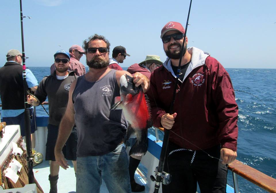 By now the wind is picking up, jackets are being donned and shorts pants exchanged for the longer variety. Luke shows off his fashionista neck scarf. Finding quality fish is difficult, presenting us with a difficult choice: (1) taking a 4-hour ride to San Clemente Island to get in a few hours of island fishing before dark, or (2) sticking it out at the bank. We decide to stay and encounter stronger winds and white caps as the day progresses. Standing on deck as the boat moves is now a wet proposition. At our next stop, we pick up four goats (sheepshead) and at 2:00 pm as Tom guides the anchor chain up for another move.