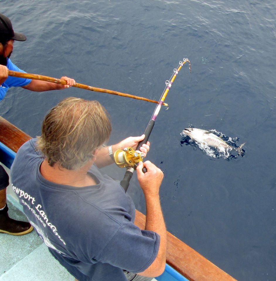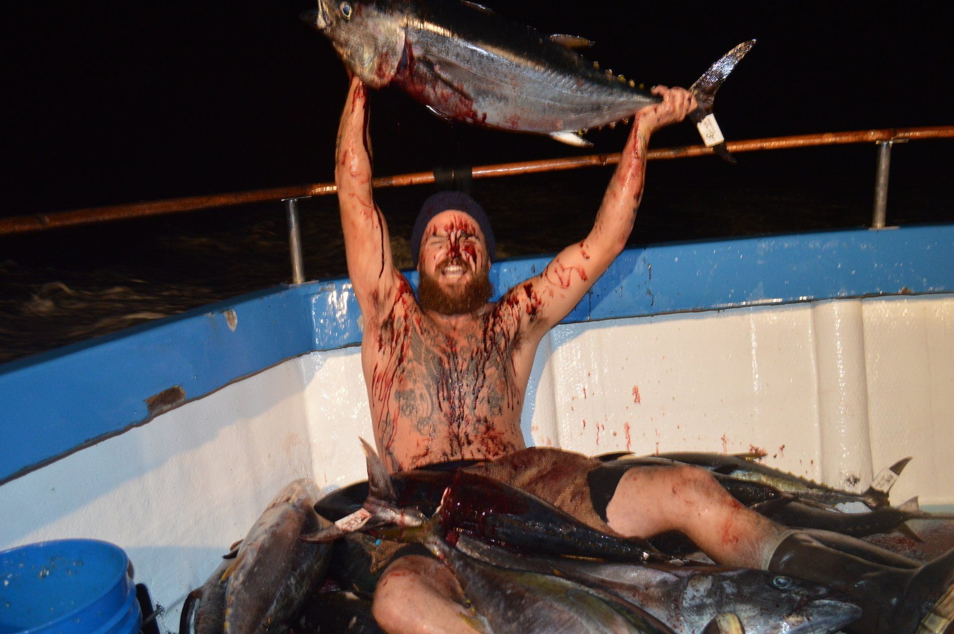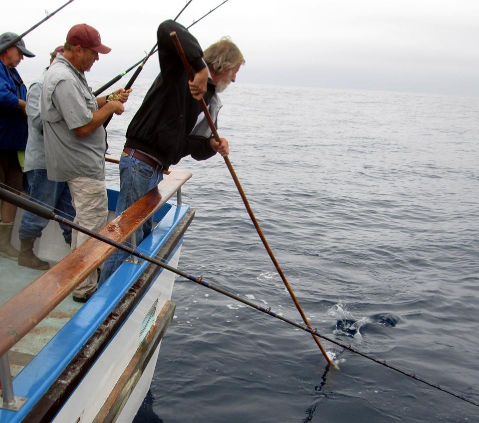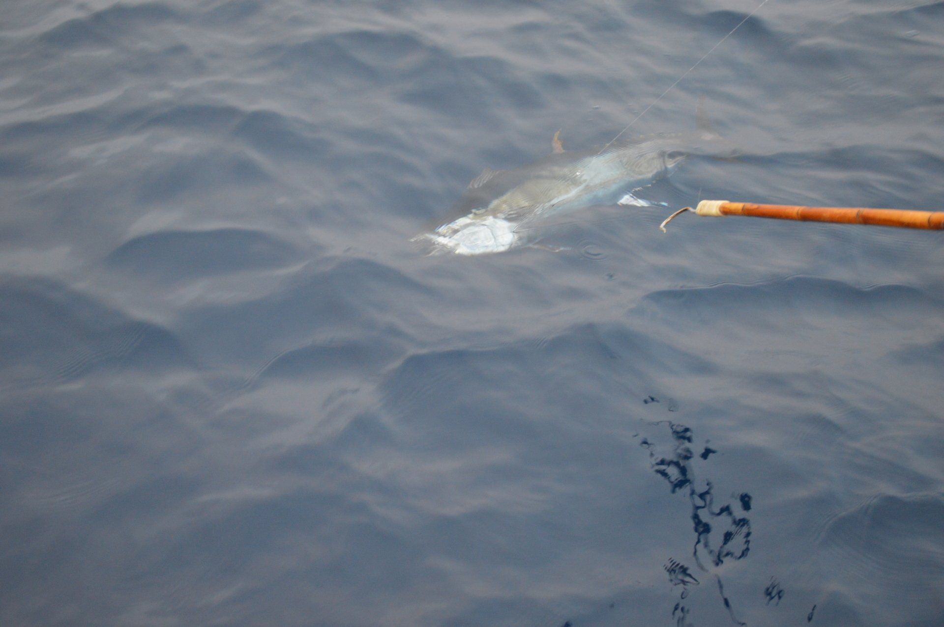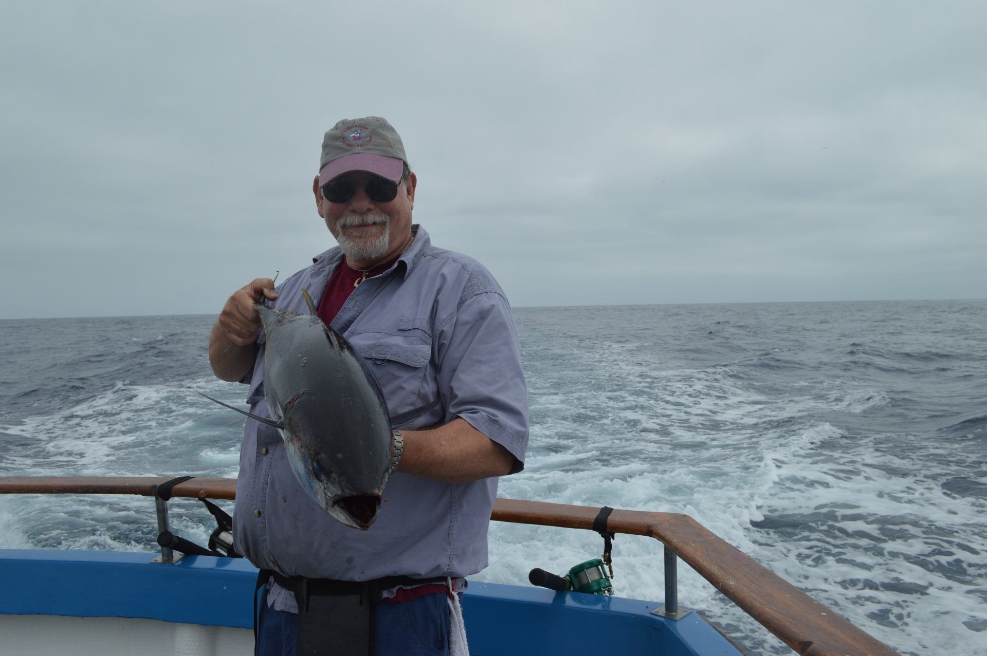 We arrived in the “zone” at 4:45am. It had to be the zone because the entire San Diego fleet was there, including half the long range fleet. Needless to say, there would be competition for fish today. We were at about 70 miles just above “the line”. Water temp was 71.8 degrees. We drifted until daylight and yours truly, Gary T, managed to get the first fish of the trip around 6:00am, a BFT around 15lbs. No more bites and we started trolling around 6:15am. A note here- we did not get one hit on the trolling rigs in two days. Highly unusual, but that had been the pattern for the boats fishing this area for the last several days.