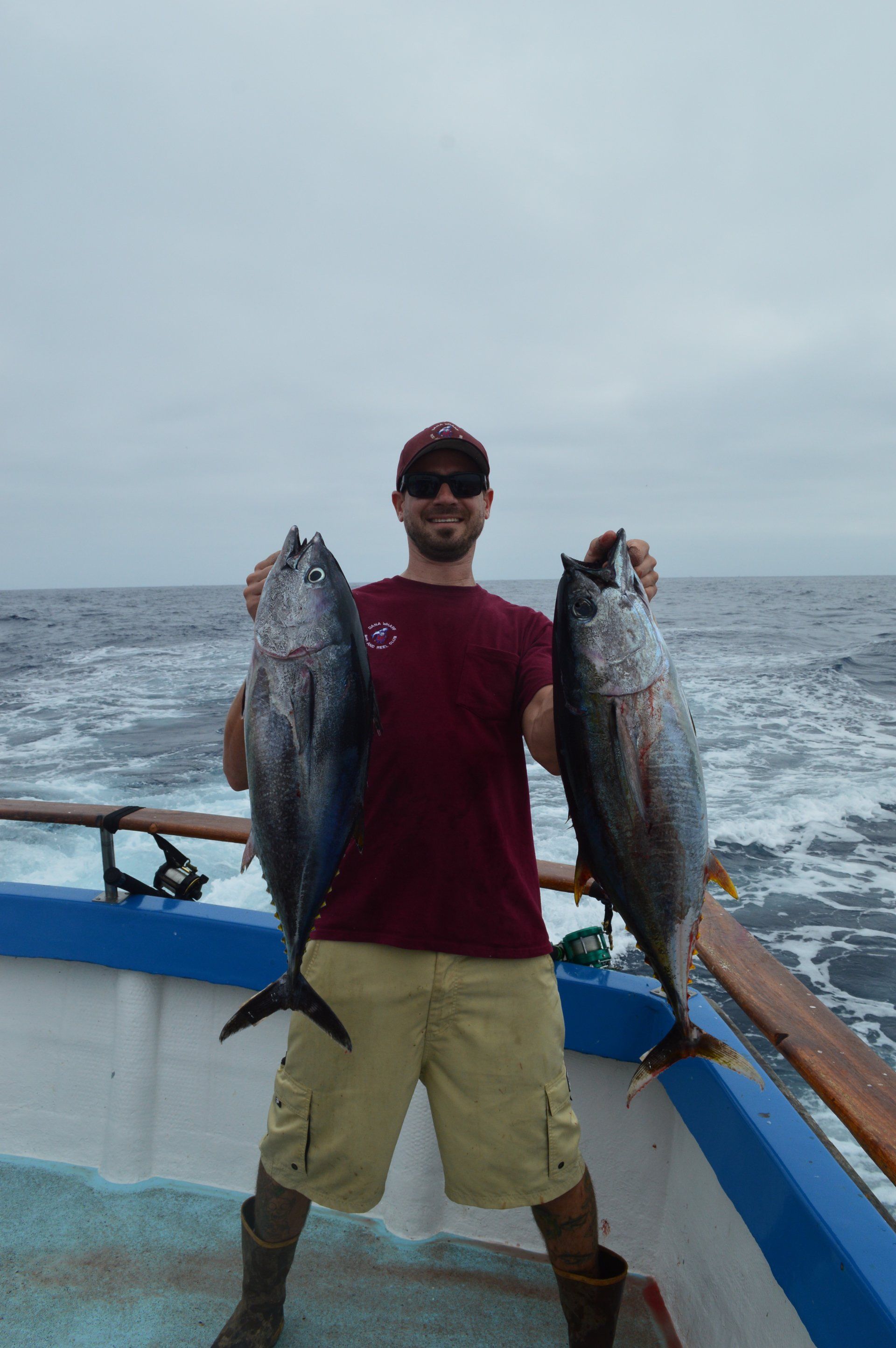 Trip #5: Boat: Thunderbird 2.5 day Departs: Tuesday August 19th Fishing: August 20th, 21th Returns: August 22th am Thunderbird Crew: Jeff Markland- Captain Steve Raby- 2nd Captain Jose, Jared & Nate on deck Goofy in his usual form in the Galley The usual suspects, newer club members and a slew of guests began gathering for the upcoming 2.5-day venture on board the Thunderbird on Tuesday afternoon/evening, a lot of discussion occurred around where will we fish, what is our bait, are we going to fish for tuna, and more importantly, the weather. Forecast was for pretty breezy on the outer banks and tuna grounds with somewhat better at the island. Thursday weather looked much improved everywhere. As it turned out, the weather turned out nice the first day, and even nicer the second day. Also the good news was we would have sardines for bait. When the boat returned from the fuel dock around 7:30, I wandered down to the boat and sat with Jeff and discussed our “options”. There was about 2 scoops of live squid on the boat and the squid at San Clemente Island was available but by jigging. Also, the yellowtail fishing was hit or miss at best early in the cove, and then really nothing to catch the rest of the day unless the bass decided to bite. The tuna grounds were in range to do some night fishing between the days, and daytime fishing was producing smaller fish. The Tanner Bank had the 10-15 lb variety which was spotty, and inside toward SCI were bigger 30-35lb variety with some larger mixed in. Getting bites though would be hard. The Cortez Bank coughed up 100 yellowtail for Jeff a few days before. There was also some white sea bass caught at San Nicholas Island so that was an option. Soooo, one more time, what to do. Jeff decided he will decide when we leave the bait receiver as I said give it your best shot. The final decision, with the weather forecast improving, we would head to the Cortez Bank since there had been some yellowtail there a few days before. And off we went. Travel out was not too bad. Day 1- Arrived at the Cortez Bank around 7:45 am, fished a couple areas for nothing except some of the jumbo bonito, large mackerel and a few bottom dwellers. There was no sign of yellowtail. Where the F**k did they go? Around 10:00am, Jeff pulled the plug and we headed back inside to the tuna grounds, about 30 miles away. Weather was getting much nicer, We ended up picking at the BFT not long after we arrived in the area around 2:00pm and joined “the fleet”. We had one decent plunker drift for 16 BFT, and scratched up 9 more at sundown. As dark fell, we headed into the island to try for the early morning yellowtail fishing at the Lost Point area. Day 1 fish count- 25 BFT, 4 Bonito kept, a few misc bottom dwellers kept JP winner- Bronson Noggle (Cory Steinwand Guest)- 30 plus lb BFT, Patch winner Cory Steinwand- 30 plus lb BFT (it was very close) Day 2- had a few yellowtail bites in the dark and grey light at Lost Point, all nice fish. Headed out after grey light for yesterday’s tuna grounds. Flat calm weather. Worked the area with “the fleet” for a couple of hours and covering a lot of water. Jeff finally pulled the plug and decided to take a gamble and head to the Tanner Bank since there were tuna there a few days before. And the gamble certainly paid off. We were greeted with boiling fish in the chum circle when we arrived, boiling fish on the anchor and steady fishing on the 10-15 lb BFT the rest of the afternoon. We fished a couple deep spots for decent reds and other stuff, one nice ling cod and headed back to the area west of SCI toward San Nicholas Island for some night fishing. We had several stops on spots of fish, and got a few anywhere from 30 plus lbs up to 100lbs. Around midnight, we headed home. We were able to fish that long because by chance, the boat was not scheduled to run a ¾ day trip when we got in, so we got to fish longer. Arrived at the dock around 7:20am, unloaded and that was it. Day 2 fish count- 6 Yellowtail, 40 BFT, 1 Halibut, 2 Barracuda, 100 plus mixed Reds and Rockfish, 1 Ling Cod JP & Patch winner- Cory Steinwand- 102 lb BFT Trip total- 65 BFT, 6 Yellowtail, 1 Halibut, 4 Bonito, 100 plus mixed Reds/Rockfish, 1 Ling Cod The weather for the entire trip was good. Temperature cool both days but very nice. Very little wind to flat calm the entire 2 days. One thing that was troubling was the amount of casualties on these smaller tuna. Seems like most everyone liberated one or two, or more. (We won’t mention my luck!). Small hooks and light line with too much pressure and these little guys were hot! All in all a good time had by all and a very good group of guests on this trip as well. That’s it! Your Scribe- Gary Thompson