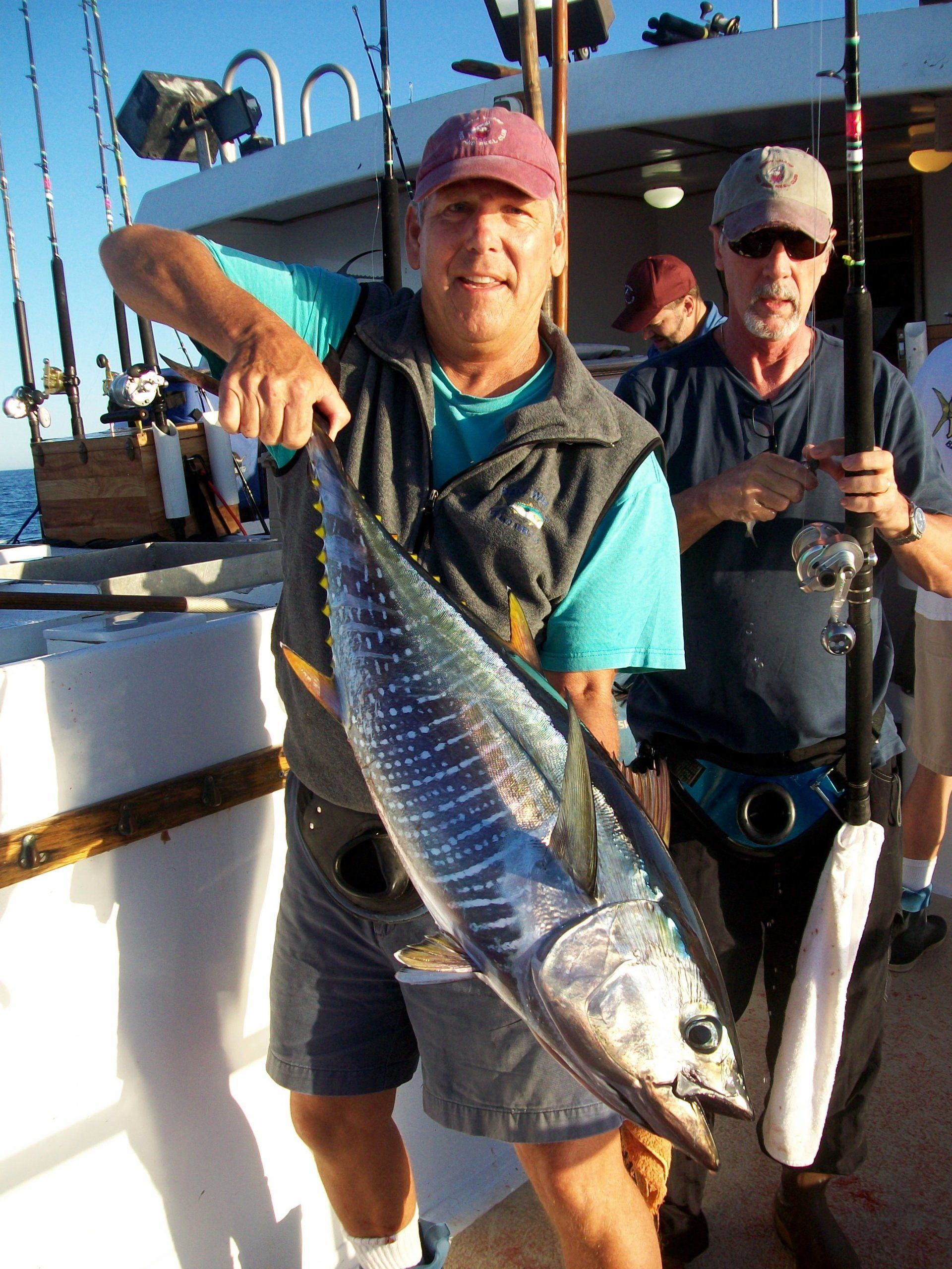 At about 10:00 the boat anchored over Tanner Bank. There were about 4 other boats there already. The bite was steady but not wide open all day. It produced a lot of fish using fin bait on the surface and yo yo irons. Since the water here was a little cooler, the fish caught were mostly YT and BFT. We moved around a few times to try different spots on the Tanner, but in the end we left Tanner headed for Cortez Bank for dinner and hopes of catching some mackerel for extra bait on Saturday. The mackerel were smaller fish about 4-6 inches. The larger baits did not seem to be there. We ate dinner (Enchiladas, Rice and Beans) with on the Cortez Bank and cocktails and the usual fine selections of wine. We spent a rocky night on the Cortez, but the weather held out and it was very warm and mild.