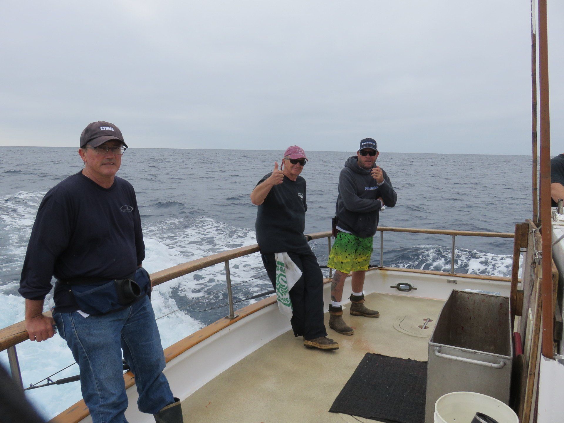 Trip #8: Boat: Thunderbird 1.5 day Departs: Thursday, October 2th Fishing: October 3th, 4th Returns: October 4th pm Thunderbird Crew: Capt. Jeff Capt. Chris Jose Nate Goofy Cast of Characters: Bill Parks Steve Morgan Riley Dyer Jim Bertella Justin Becker Jacob Richards Luke Burson Paul Morgan Mike Allen (Scribe) Patrick Thunyakij Bruce Granse Kevon Kong Michael Harris Ryan Burson Oscar Ochoa Ed Chutney Jeff Allen Andrew Ron Shrout Murphy Parks Romeo Ochoa James Harris Ozzie Baktiari Arriving for a trip in the month of October at Newport Landing is a far easier experience then one would have in the summer months of June – September. The dread of driving through the neighborhood in hopes of an empty space large enough to accommodate the larger trucks that many of the club members own seems to dissipate as the offerings are far more plentiful. While the welcomed views of summer also tend to be less abundant, the ensemble of club members arrived with plenty of time to catch-up on some conversations and enjoy a beverage or two.
