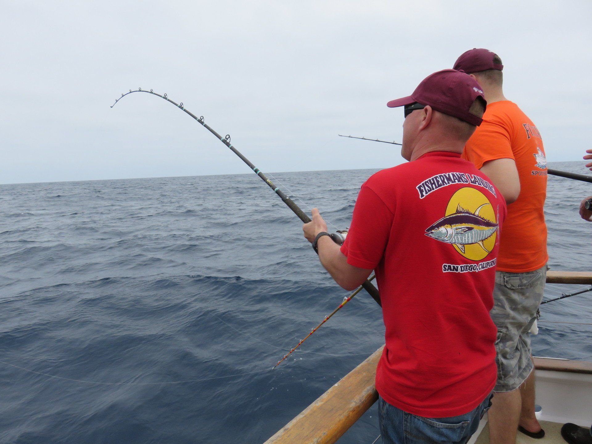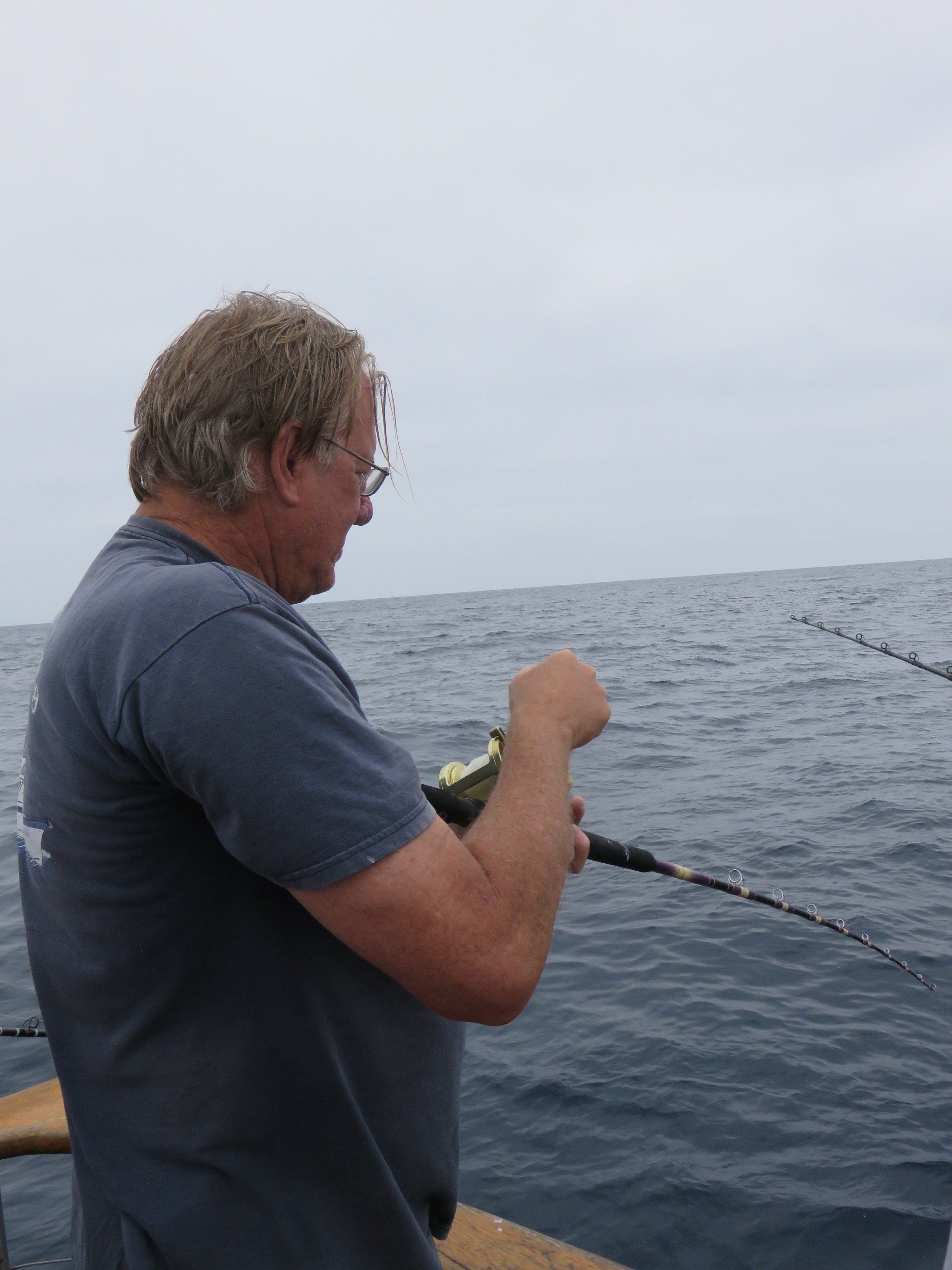 Friday morning gray found us on the west side of the San Diego Trough along with 576 other boats. It appears the reported location of the Tuna was not exactly “closed hole”. Bruce wanted three trollers only and at 0545 we started our rotation. Thirty minutes later, a meter mark stop and we started boating YF Tuna. Most were in the 20#