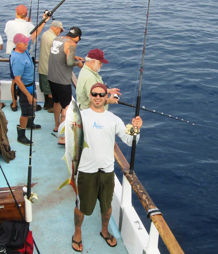 It didn’t take long for the fish to get with it. The fish were biting the fly line sardine and mackerel very well, but we were having heavy casualties due to the pinnacles on the bottom. At 9:00 a.m., we had 46 yellows. By 10:00 a.m., we had 80. The Dana Wharf Rod and Reel Club did not have a good batting average on these fish, except for Andy W who went 8 for 8 in the morning on 25 pound test. They were deep, mean and knew every rock on that reef.