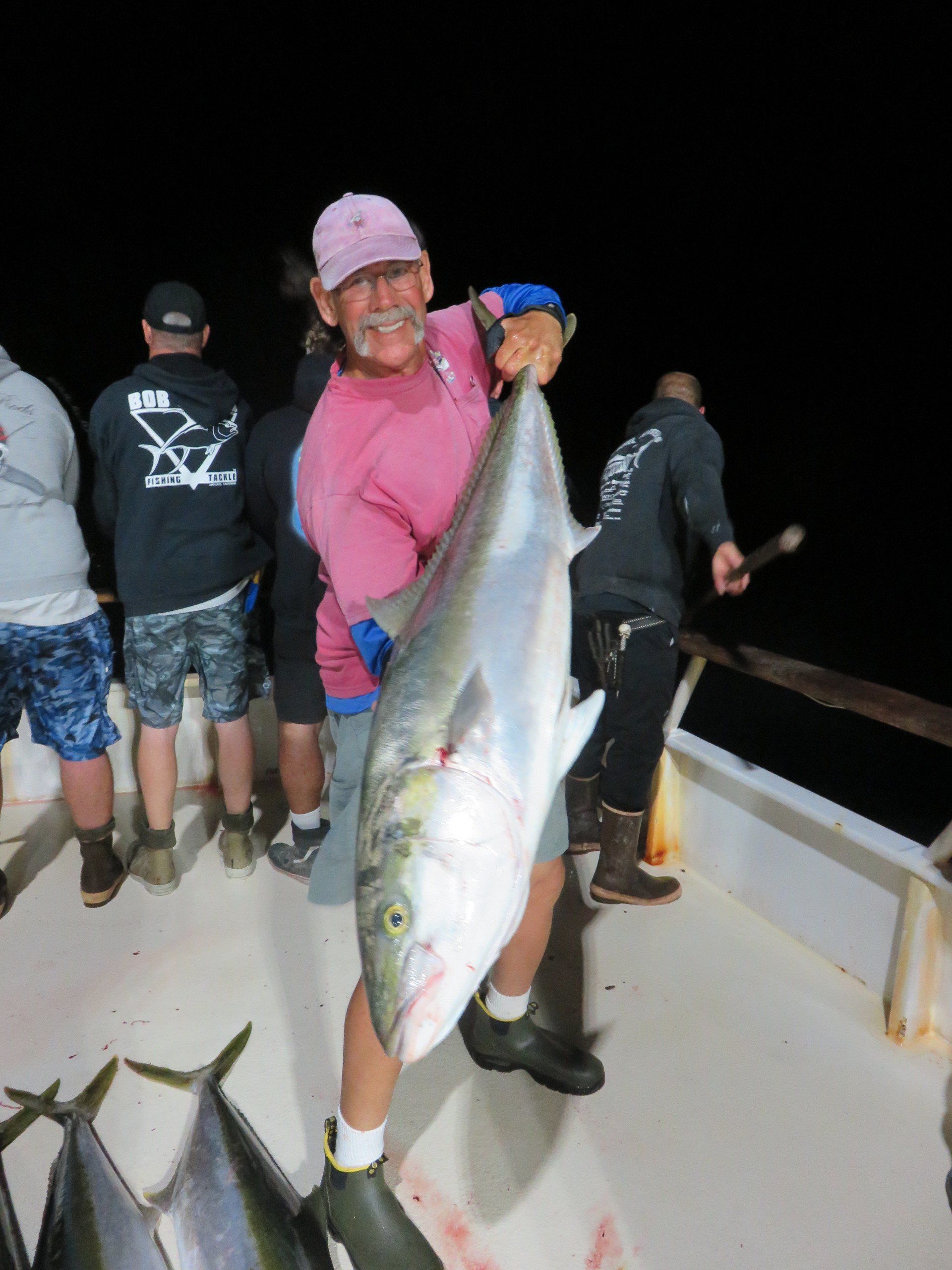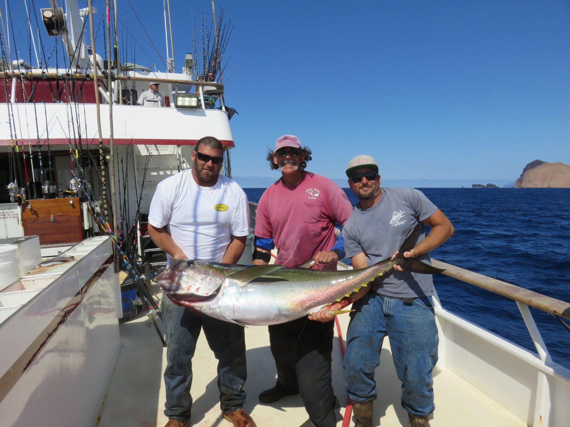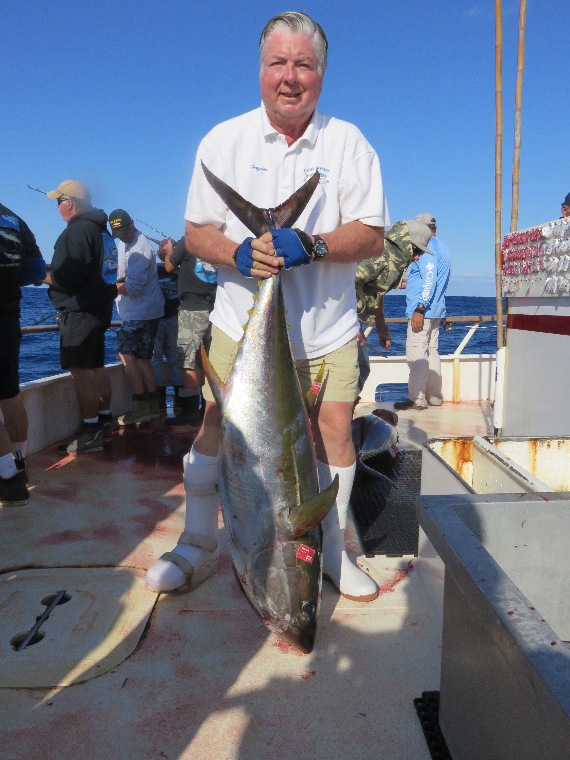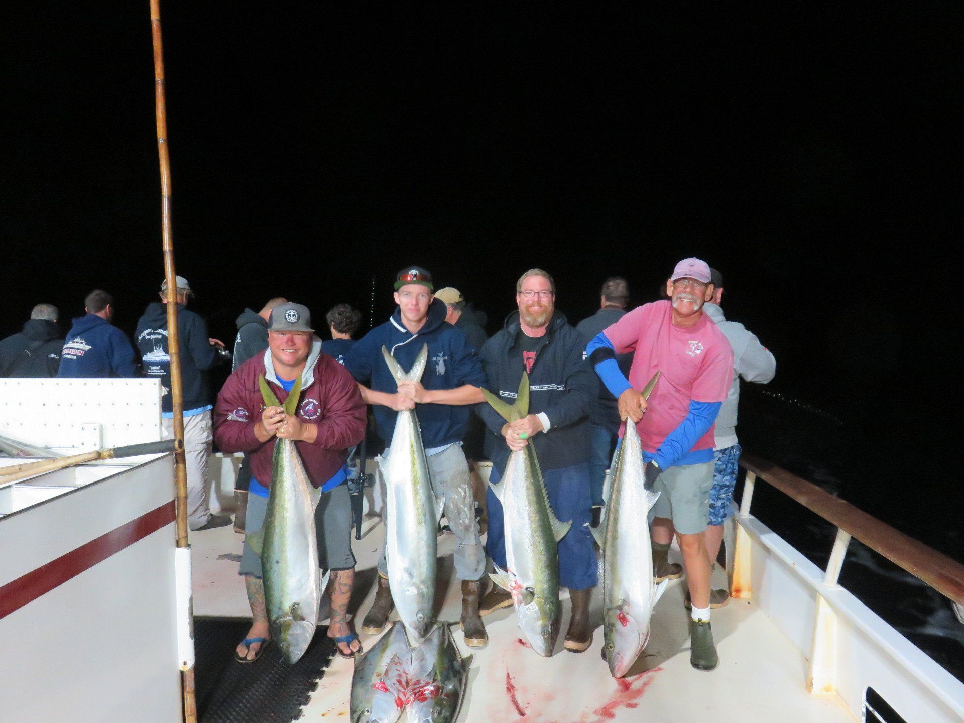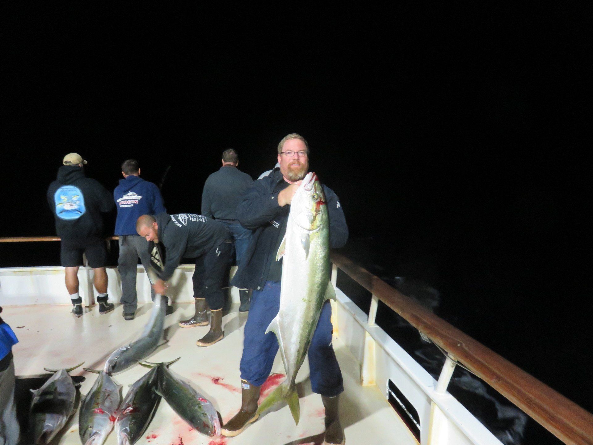 We arrived at Guadalupe at 2 AM on Wednesday morning and immediately started fishing for YT. It was pretty good with all the fish 30#s or more and the DWRRC contingent catching far more than their share. We ended with about 20 YT in the dark. Cody was again the hot stick on YT. Then the YFT fishing started and this was by far our best day. We had great current and the fish wanted to bite. For the day we ended with 53 YFT including our biggest fish for the trip. It was 125# and caught on the kite. Luke had one that was 109# and Bill had one at 107#s. Some anglers were more successful than others. Some dropped down in line size to get a bite but that usually did not end very well. We had a few GWS around the boat and the longer fights on lighter line put the odds in their favor. Mike was hooked up all day long on the lighter gear but paid the price to the GWSs. Luke was happy with his re-rigging and had a good day putting 8 fish on the deck including what turned out to be 2nd place JP.