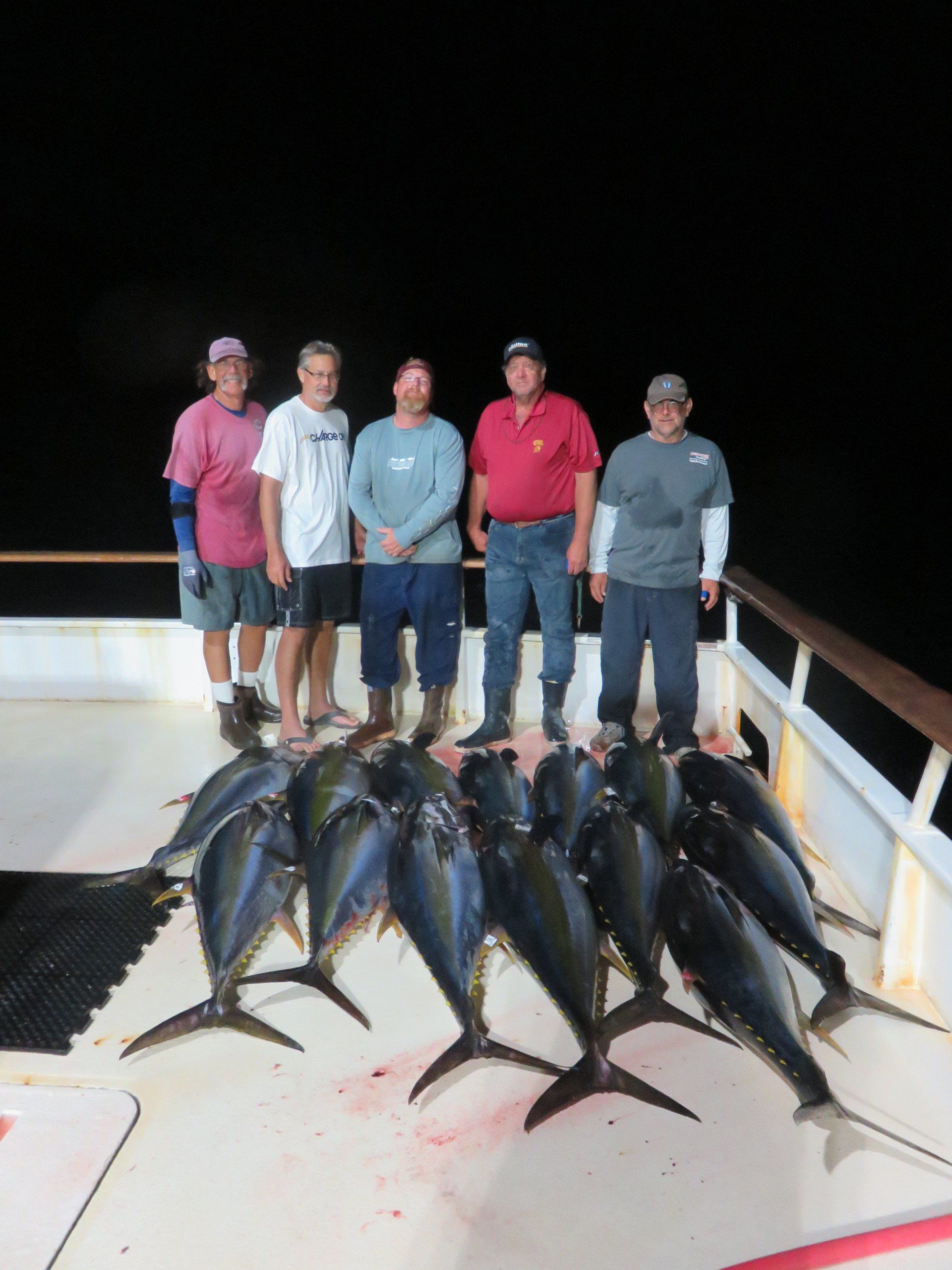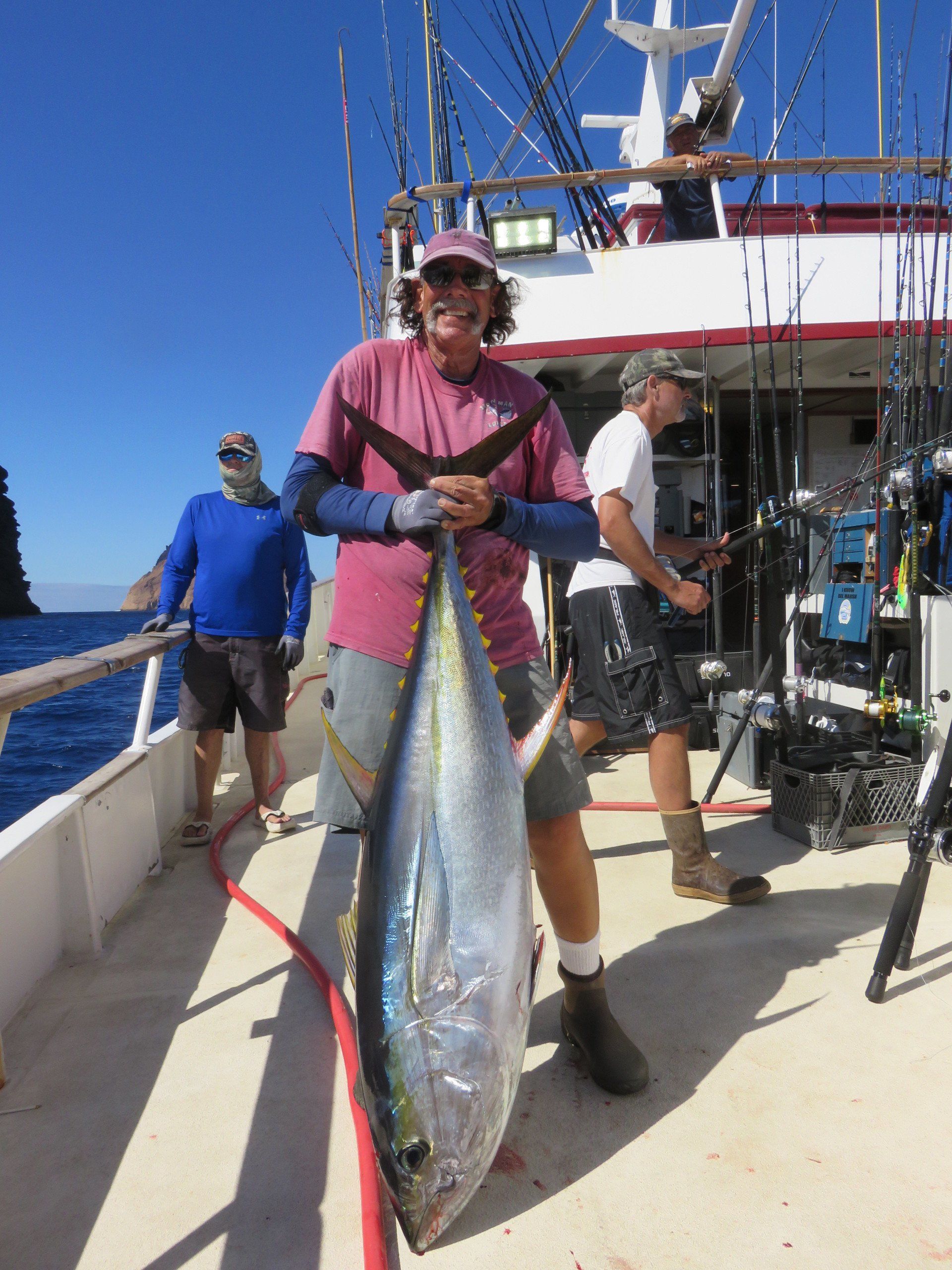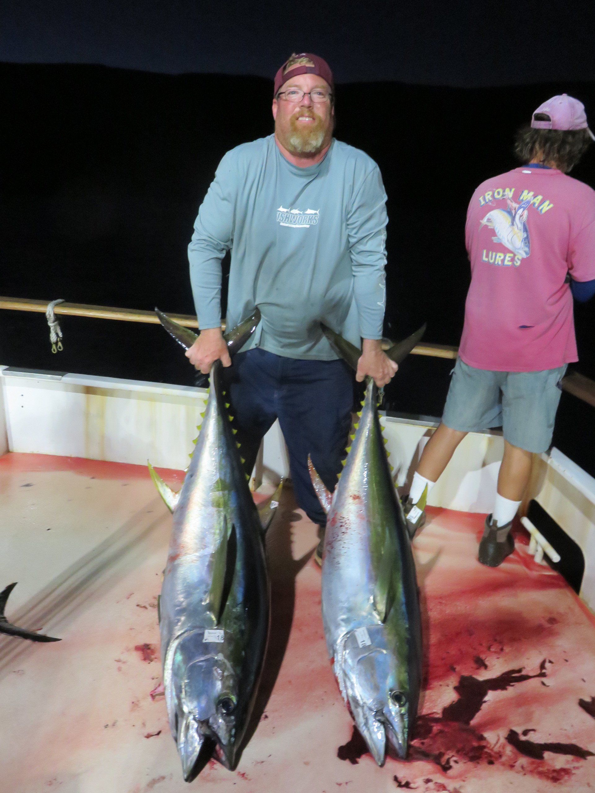 We got to the island around 3 PM and started looking for YFT. We found a small bunch that wanted to bite. By dark we caught 16 YFT that averaged about 75#s. Later that night we added a couple of YT. For the first day it was scratch fishing and some did not have a bite.