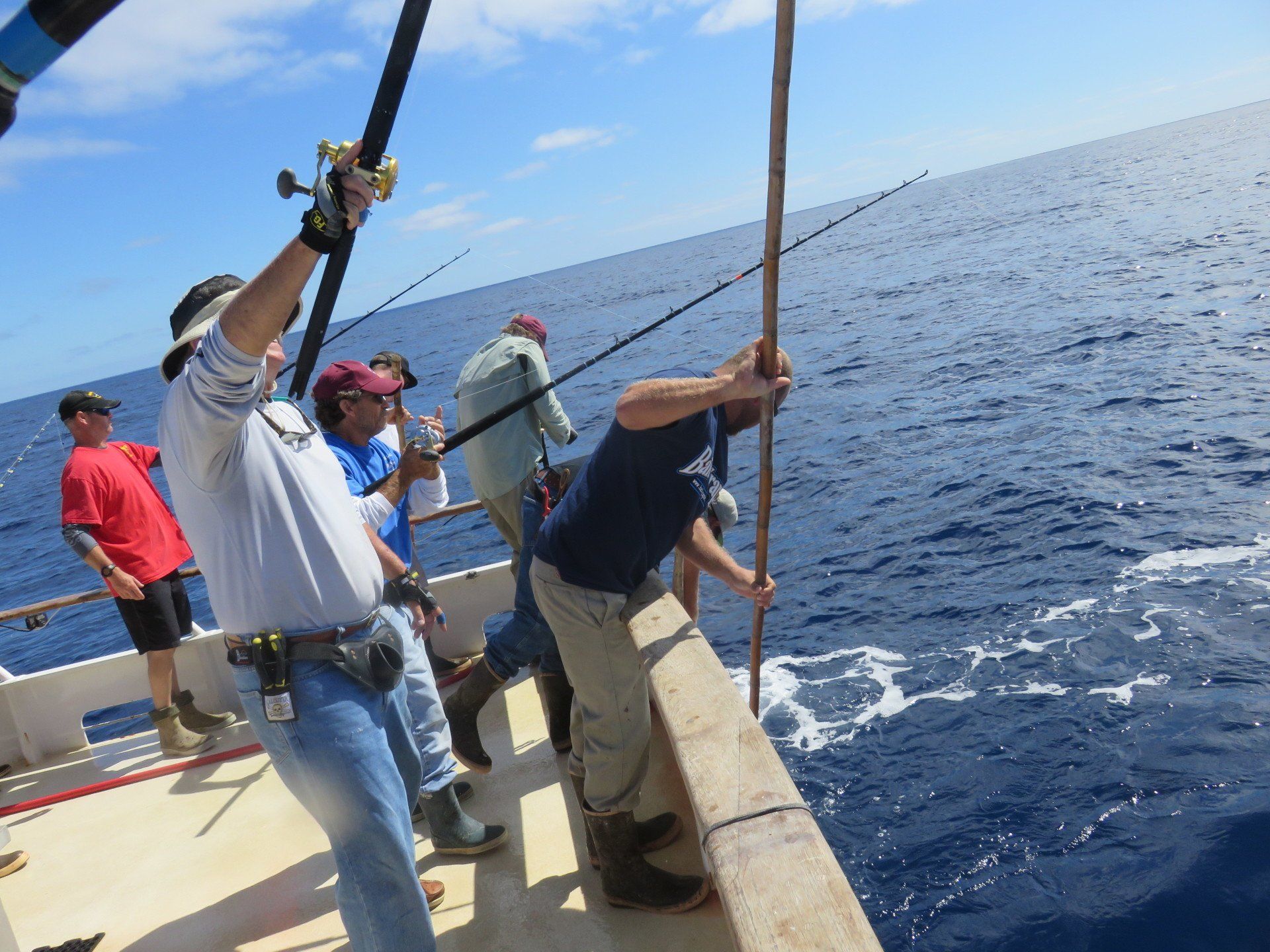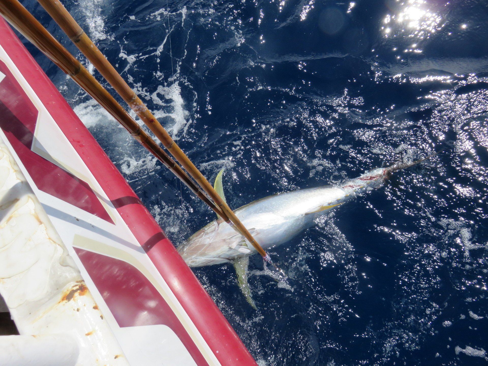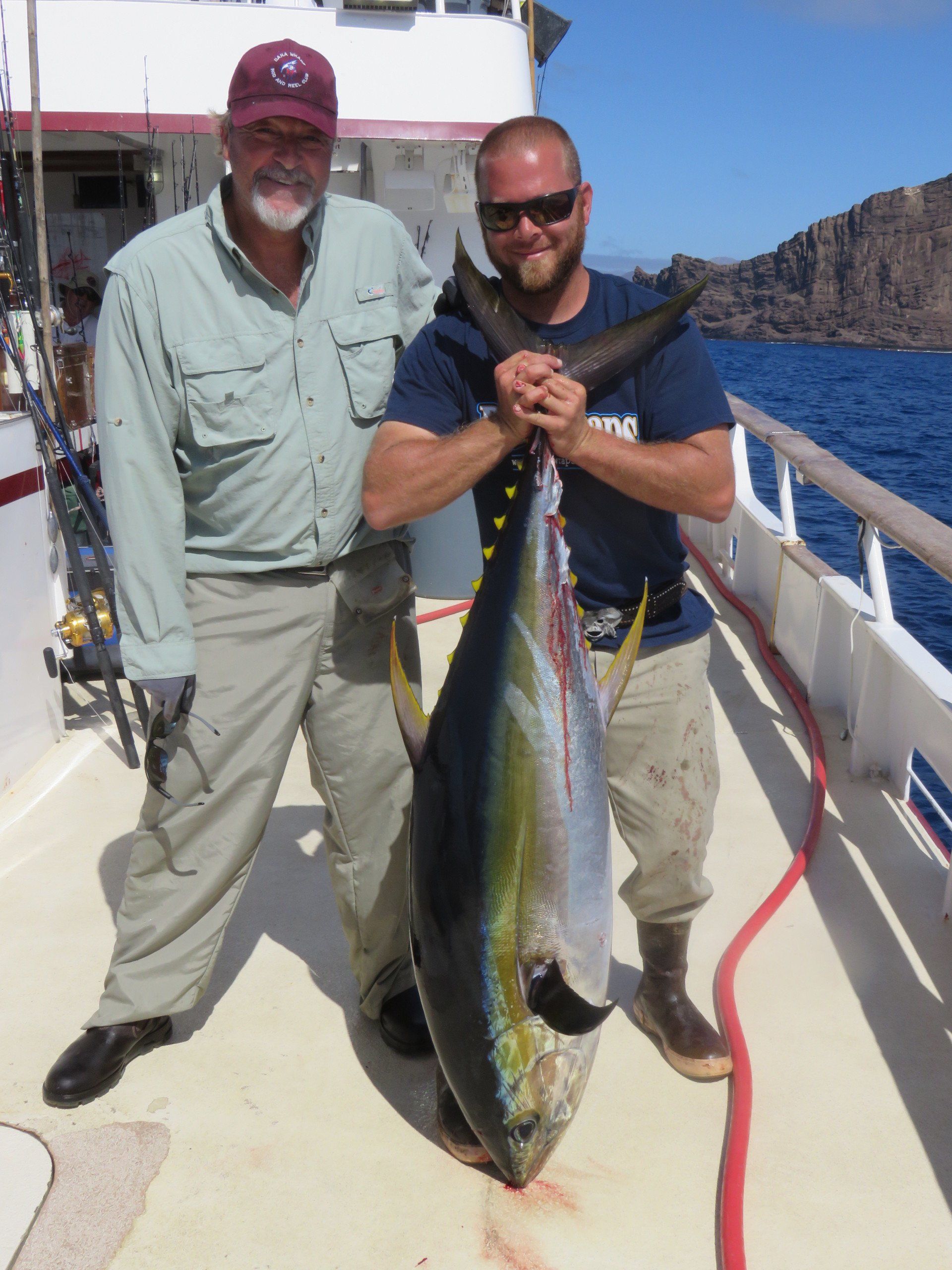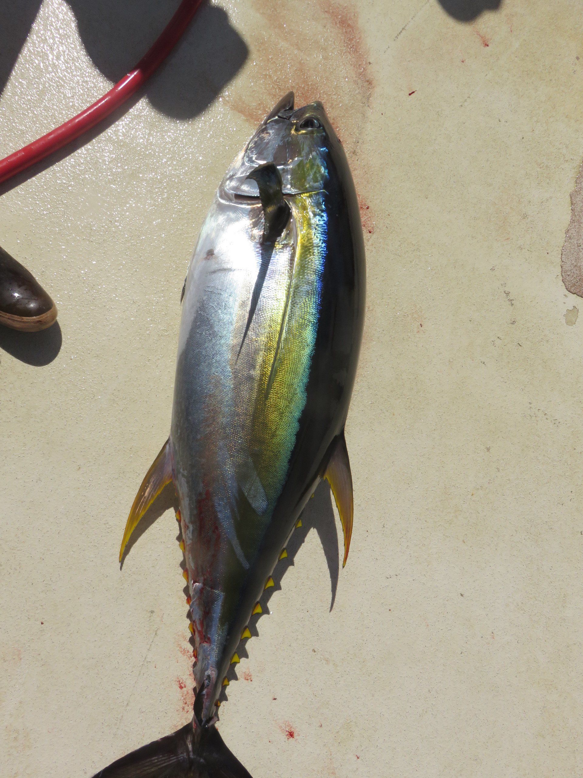 We got to the island around 3 PM and started looking for YFT. We found a small bunch that wanted to bite. By dark we caught 16 YFT that averaged about 75#s. Later that night we added a couple of YT. For the first day it was scratch fishing and some did not have a bite.