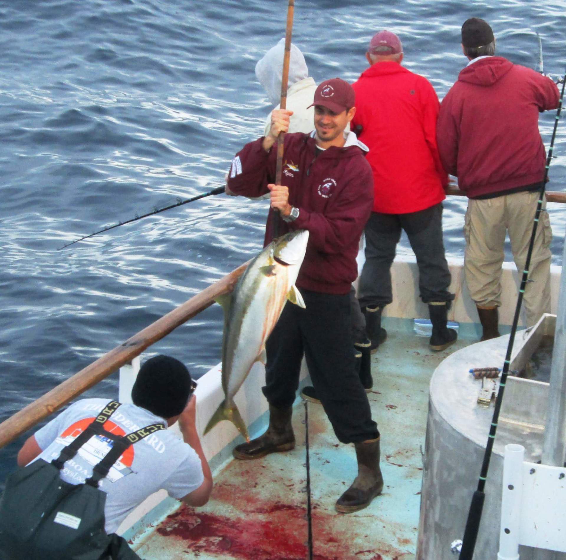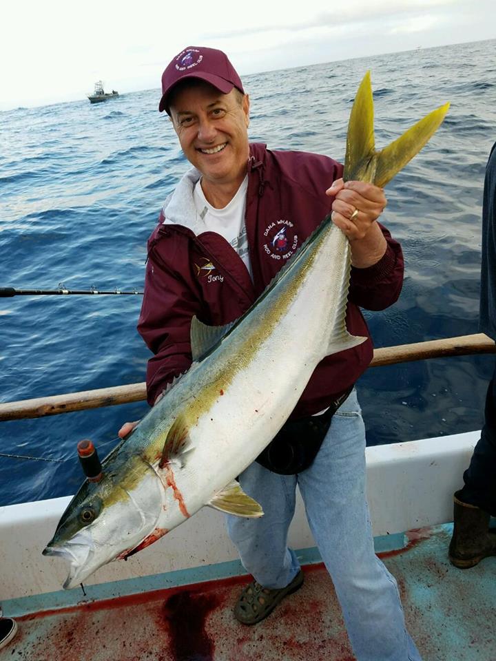 Trip #4: Boat: Thunderbird 2 day Departs: Thursday August 7th Fishing: August 8th, 9th Returns: August 9th pm Trip 4 started as usual with people arriving at Newport Landing at all hours of the day with anticipation of fishing. The preliminary reports from Gary Thompson were all too familiar to what we’ve seen this year. Bait was going to be an issue. And last but not least, was the fish seemed to pop up one day and then disappear the next. Nevertheless, everyone was ready to go. Friday morning saw us anchored at the usual cove off SCI. Weather was OK; fishable, but not a lot of fish. But the ones we caught were quality yellowtail and white sea bass. The sea lions provided ample entertainment …err I mean frustration. We hopped around to a few spots picking up the occasional calico but not much. Day 1 jackpot went to Alex Arthur (Justin Becker’s Guest) with the patch going to Nick Burson for some chunky YT’s Day 2 started much as it did Day 1 but the weather was worse than Day 1. We looked here and there with only 3 yellowtail to show for our efforts. Eventually, the Thunderbird turned towards offshore waters to try our luck at some bluefin. Unfortunately, the fish didn’t get the memo and we saw neither sign or had any bites. Mr, “Hey that’s my fish” Tom Hill was the lucky jackpot and patch winner for Day 2 with a 15# YT. So, there you have it, not a, “Hey you missed a great trip” kind ‘a trip but per usual, the members of our club all seemed to enjoy doing what we do. It’s not always about the fish; it’s about the people and the experience. LOL! Who am I kidding…we all want more fish. Until next time, step to the right/left and take up your slack.