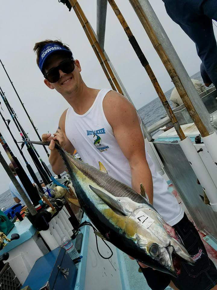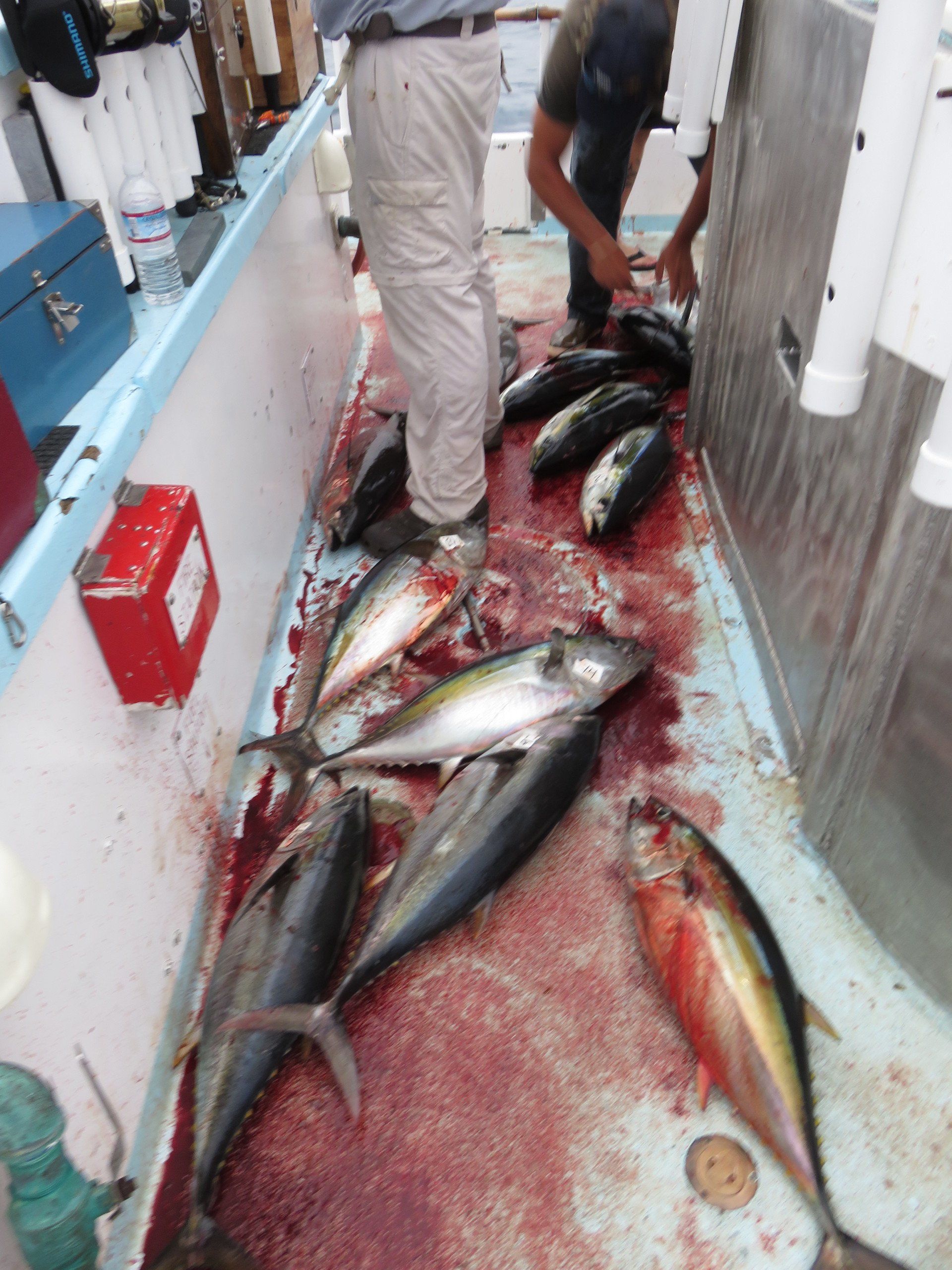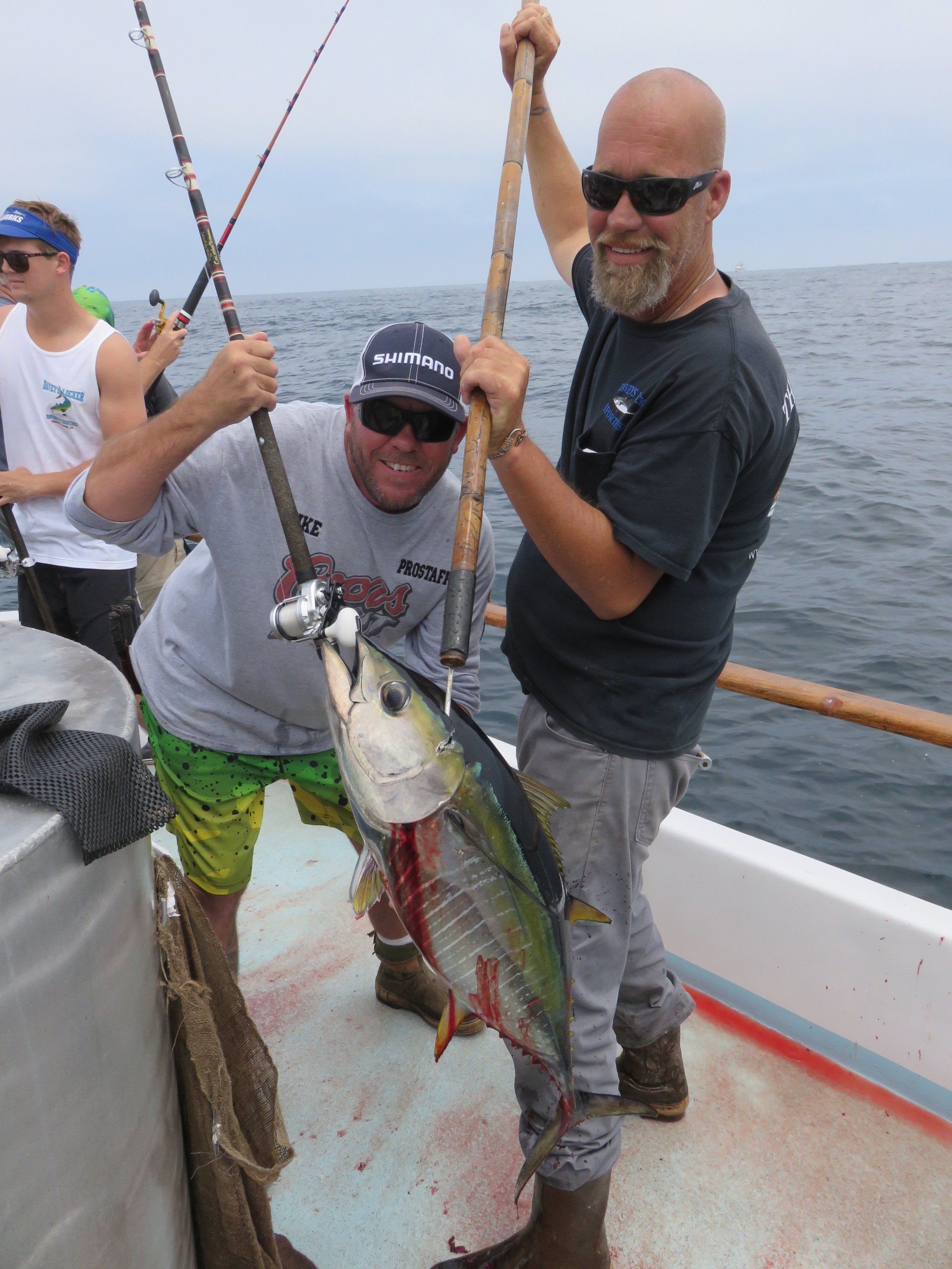 While en route to stop #3 the sun took cover behind the clouds, a nice change from the heat we've been having. Jeff stopped us on some markings and we picked at 17 school sized YFT. While a good amount of us were sittin on a goose egg, Mike Trunk helped us all out and let us know they were all just "right there!". The majority of these fish were flushed as well and same story, loaded with red crabs. Once the bite died down Goofy prepared some Pulled pork sandwiches for us which were pretty good, served with a side of macaroni (or was it potato?) salad and a crisp dill pickle. I should note the boat had a Pickle Predator on the loose, no names were given.