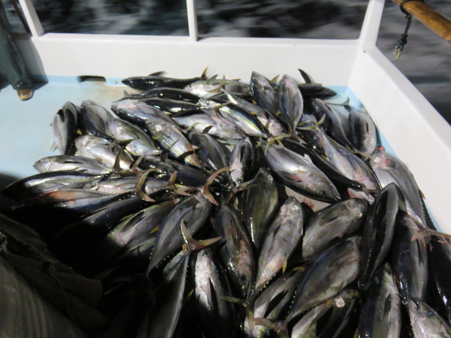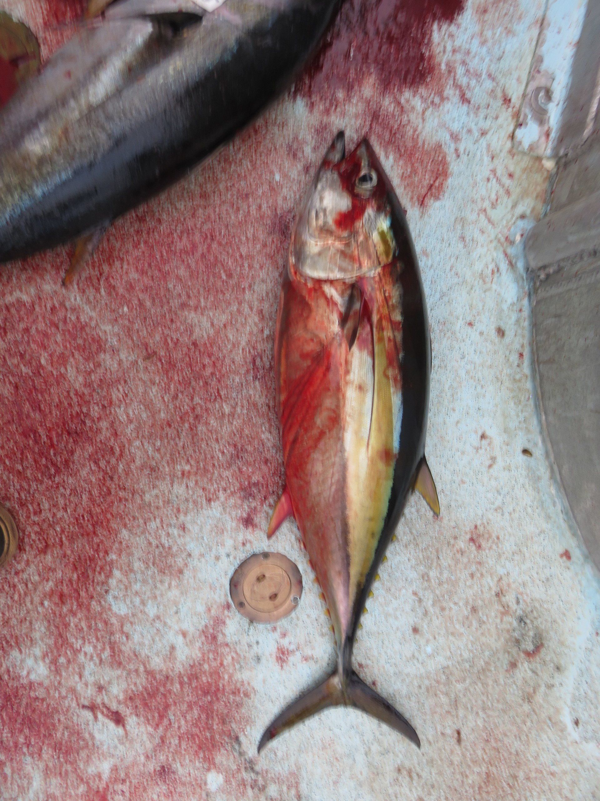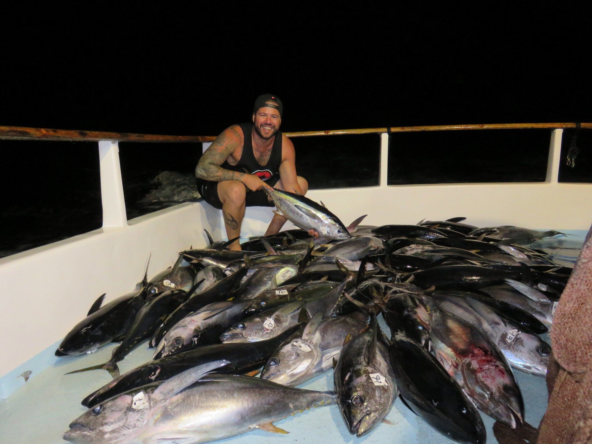 Now the sun was starting to set, I along with several others were starting to get a little ansy waiting for our turn to get bit. With full bellys like our pelagic friends, Jeff put us on some markings which finally wanted to play ball. Luke was first in the water and first bit, followed by 16 more school size YFT. Your scribe went 2/3 on this stop, Andy finally pulled on something other than the cooler top and Mike Thompson decided to get bent and add to our count as well...or was that Trunk? This stop was by far the most action we had seen all day, putting fish in bags for many of us who sat on 0 for the day.