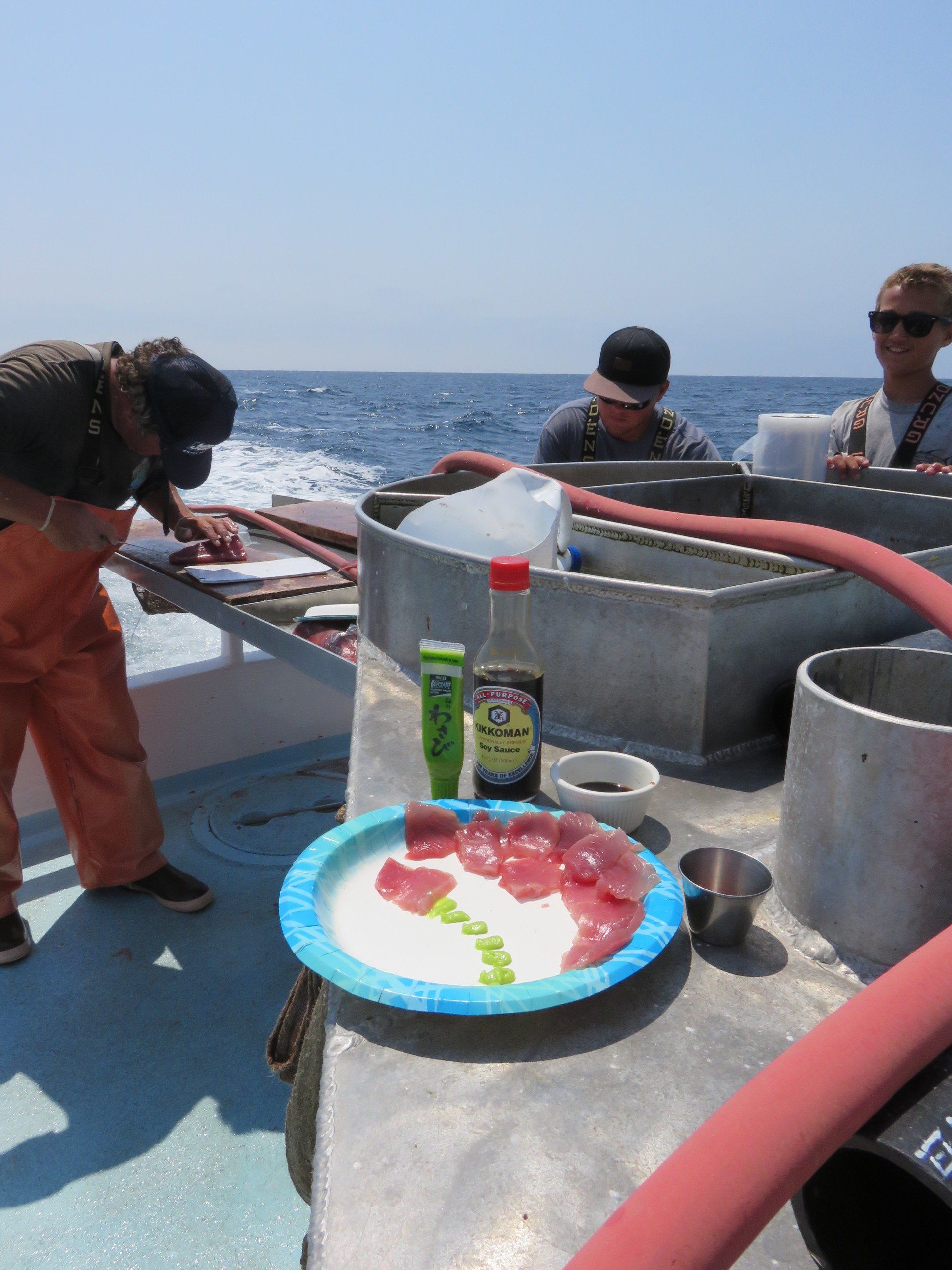 After the shenanigans of the rockfish stop we set sail for home around 1pm. Mike had donated one of his YFT for us to all enjoy some sashimi, thank you again for what we all look forward to on each trip Mike. We had perfect weather on the ride home accompanied by bird and boils everywhere we looked. A few of us took shade in the galley towards the end and left Goofy some love notes, which I guarantee he is still stumbling across to this day.
