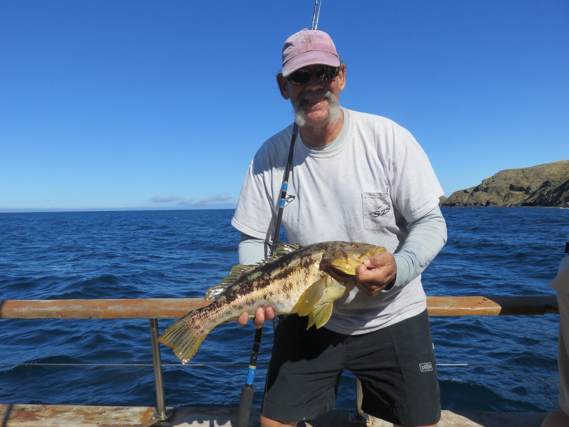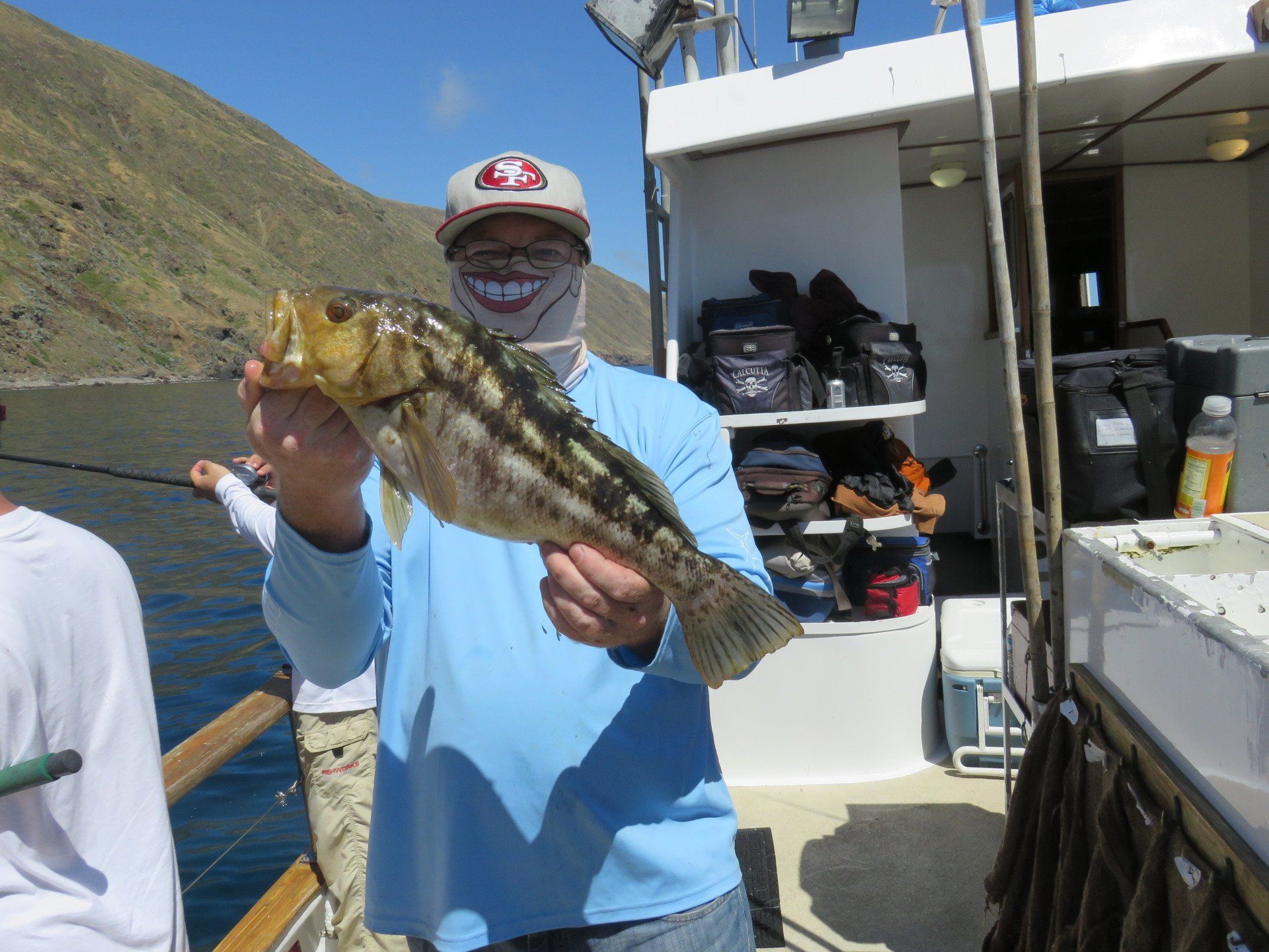 Trip #6: Boat: Thunderbird 1.5 day Departs: Firday September 5th Fishing: September 5th - September 6th Returns: September 6th, AM Thunderbird Crew: Jeff Markland- Captain Steve Raby- 2nd Captain Jose & Nate on deck Carmelo in the Galley To everyone’s surprise the first to arrive on Thursday to get head of the line privileges was of all people Tony Beall! Damn! As the afternoon wore on into the evening, the remainer of the group made their way to the dock. The Thunderbird rolled in around 6:30pm and it was clear, fishing had been thoroughly trashed due to poor weather offshore. They fished San Clemente Island for two days for a handful of yellowtail, but good calico bass fishing. After I wandered down to the boat, and speaking with Jeff, confirmed the weather was forecast to be poor where the tuna had been, and they disappeared, and we would be relegated to fishing “an island or two”. So what did that mean? Well a very reliable squid light boat source had reported to Jeff that day that he had seen a large volume of yellowtail at Santa Barbara Island that same day. So Jeff said we will head there first and check it out, then scour the previous tuna grounds west of San Clemente Island later as we head to San Clemente Island to fish for bass and hopefully some yellowtail there. So off we went. We already had a few scoops of squid on the boat and the sardines we got were very good. Travel out was rather sporty as we had wind and swell and were traveling at a poor angle due to the course line required. 60 miles of shit weather does not make for sleeping very well. We arrived at Santa Barbara Island around 4:10am on the squid grounds and fished a couple areas in the front and back of the island for nothing. Screaming current- Dropper loop needed 16 oz to hold bottom in only 100 feet of water. There was no sign of the yellowtail from the day before. It figures. Around 8:45am Jeff said he had enough, pulled the plug and we headed to the next island via the tuna grounds. An interesting note was the wind had backed off and by 9:00am, it was actually pretty pleasant on the water. Spent the next several hours traveling and scouting the tuna grounds where the fish had been. Stopped on one spot on the sonar and had some fish under the boat for one missed bite on Luke’s drop shot rig. Arrived at the “9” on the west end of San Clemente Island to start. Heavy current and every sea lion at the island were there. Saw a couple Yellowtail boils but no bites. Moved to the north kelp at Northwest Harbor and the bass bit well for 20 minutes or so until the current backed off and the kelp floated. After that fished a number of spots “spot hopping” down the front side the rest of the day, a couple good bass bites and some pick bites, but no yellowtail to be found. A couple boils here and there but no volume or any biters. And all the sea lions we wanted. We were the only sportfishing boat there so we couldn’t “share the wealth” with anyone. The wind had come up again around mid-afternoon and made things pretty difficult as it was wind against the current all afternoon. Ended up in Pyramid Cove and fished in there until it was time to head home. Carmelo put out a very good dinner of tri-tip, potatoes, asparagus and salad, topped off with our usual Klondike Bar desert. Left for home at 10:00pm and another “sporty”, no sleep ride until inside Catalina. Arrived at around 4:15am, everyone unloaded and that was it! Trip total-NO “gamefish”, near boat limits of calico bass, some kept and most released, 1 really micro bonito, 1 barracuda, TWO Blue Perch! Also some miscellaneous whitefish and sheephead mixed in. Needless to say the old fixing axiom does apply to this trip: “You should have been here yesterday, wait until tomorrow” JP & Patch winner- Bill Parks- 4.5 lb Calico Bass One item that I find encouraging is the calico bass fishing at the island. The percentage of legal (14 inch) and above fish is way up from the past, and although the bite is not fully consistent, if you work at it, you can get some decent ones. Also, it seems the quantity of calicos is increasing as compared to the last couple of years. I am convinced that the 14” size limit which allows the spawners to grow enough to spawn may actually be contributing. Time will tell. Well that’s it! Next up, 2.5 day trip leaving Tuesday 9/16 returning Friday early morning 9/19. Your Scribe (Again)- Gary Thompson