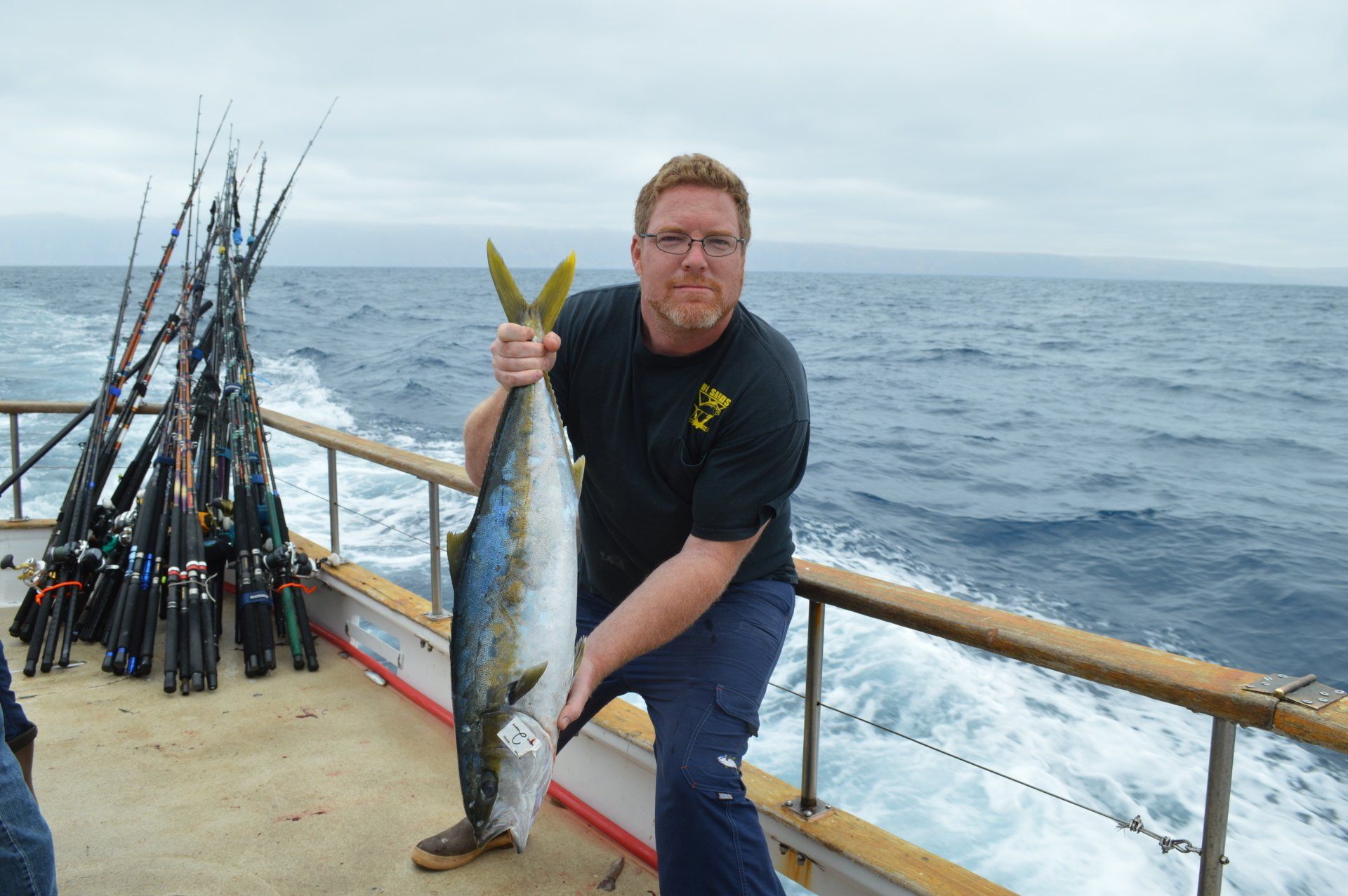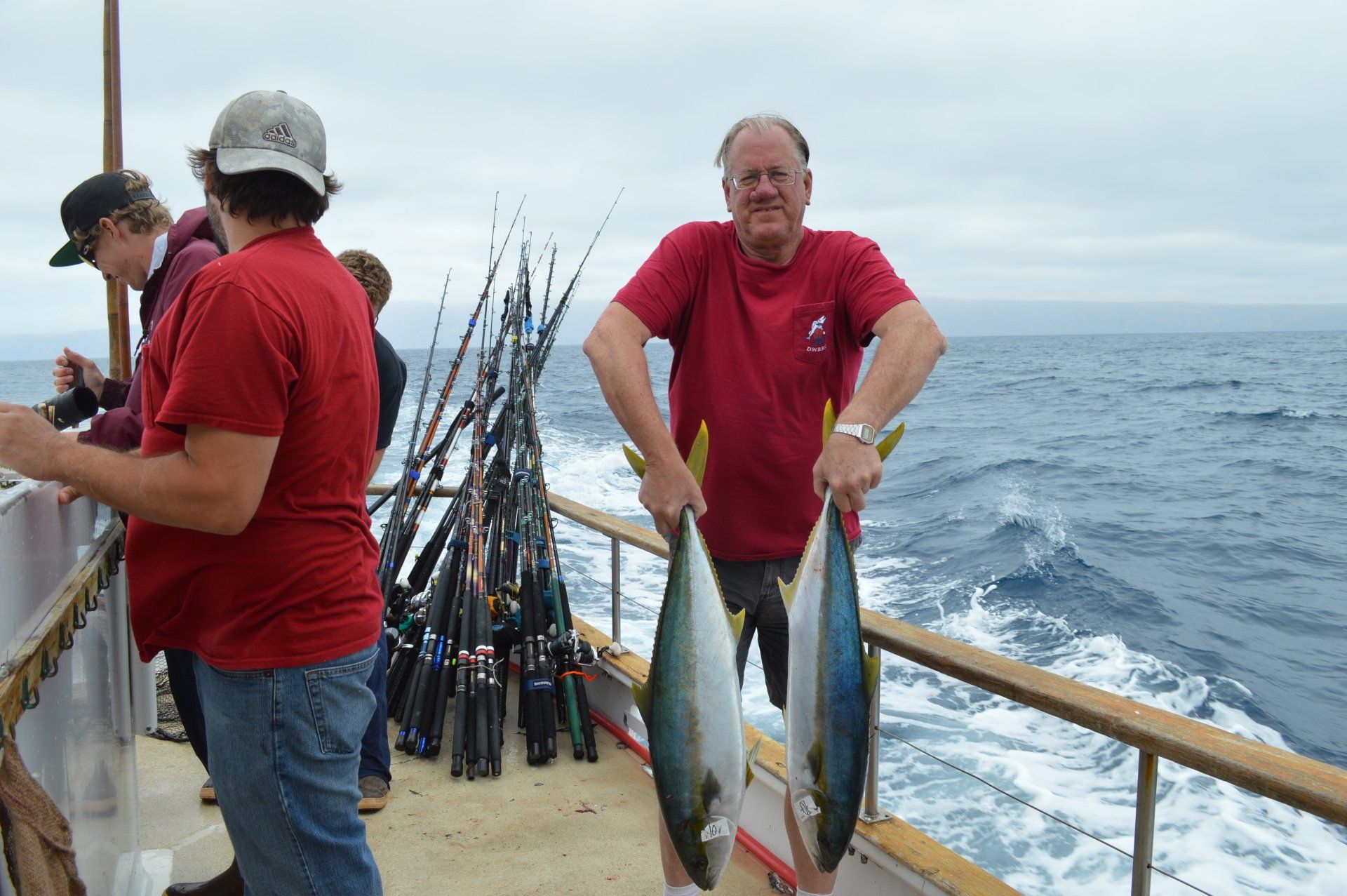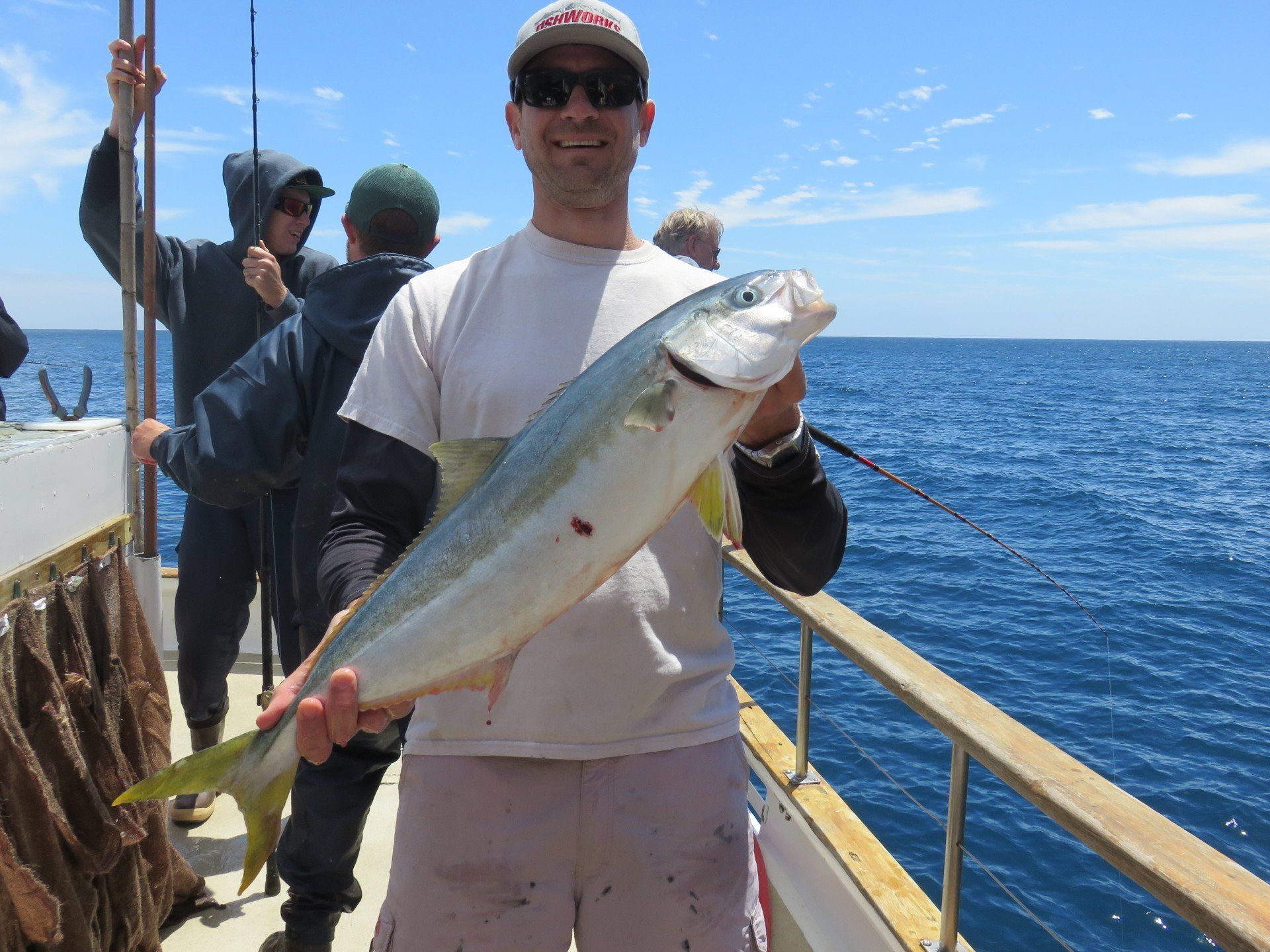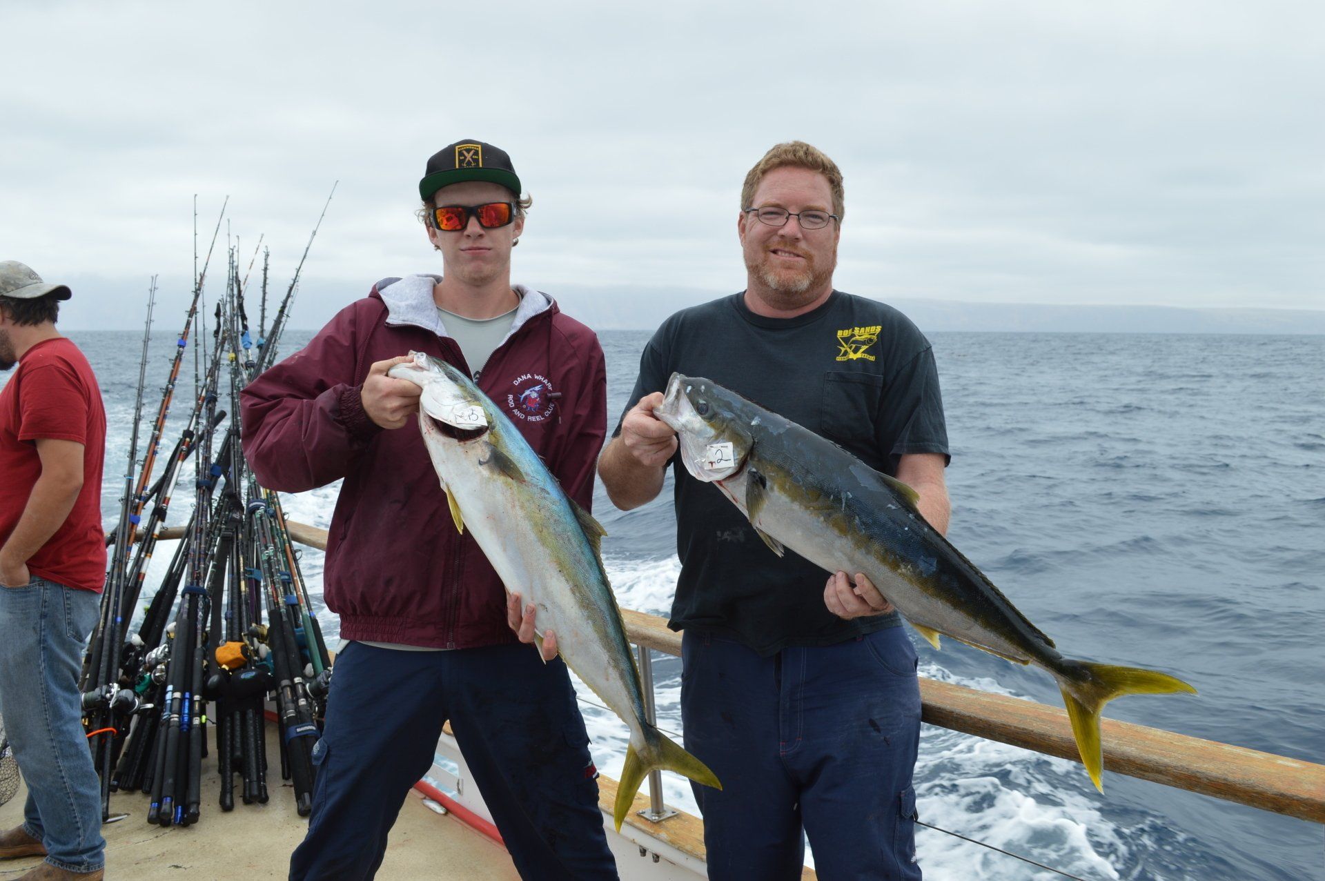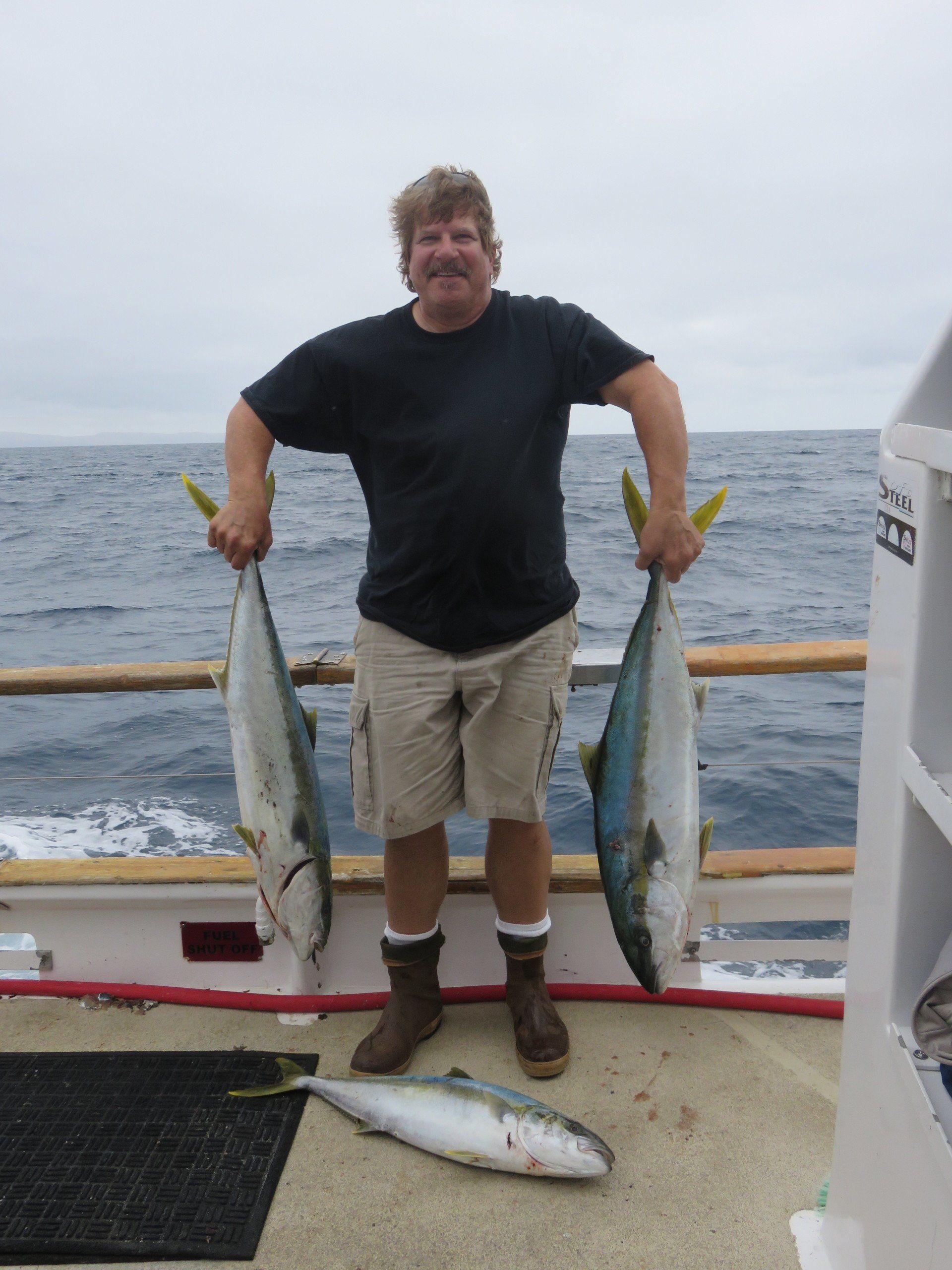 Trip #4: Boat: Thunderbird 2 day Departs: Thursday August 7th Fishing: August 8th, 9th Returns: August 9th pm Trip 4 started as usual with people arriving at Newport Landing at all hours of the day with anticipation of fishing. The preliminary reports from Gary Thompson were all too familiar to what we’ve seen this year. Bait was going to be an issue. And last but not least, was the fish seemed to pop up one day and then disappear the next. Nevertheless, everyone was ready to go. Friday morning saw us anchored at the usual cove off SCI. Weather was OK; fishable, but not a lot of fish. But the ones we caught were quality yellowtail and white sea bass. The sea lions provided ample entertainment …err I mean frustration. We hopped around to a few spots picking up the occasional calico but not much. Day 1 jackpot went to Alex Arthur (Justin Becker’s Guest) with the patch going to Nick Burson for some chunky YT’s Day 2 started much as it did Day 1 but the weather was worse than Day 1. We looked here and there with only 3 yellowtail to show for our efforts. Eventually, the Thunderbird turned towards offshore waters to try our luck at some bluefin. Unfortunately, the fish didn’t get the memo and we saw neither sign or had any bites. Mr, “Hey that’s my fish” Tom Hill was the lucky jackpot and patch winner for Day 2 with a 15# YT. So, there you have it, not a, “Hey you missed a great trip” kind ‘a trip but per usual, the members of our club all seemed to enjoy doing what we do. It’s not always about the fish; it’s about the people and the experience. LOL! Who am I kidding…we all want more fish. Until next time, step to the right/left and take up your slack.