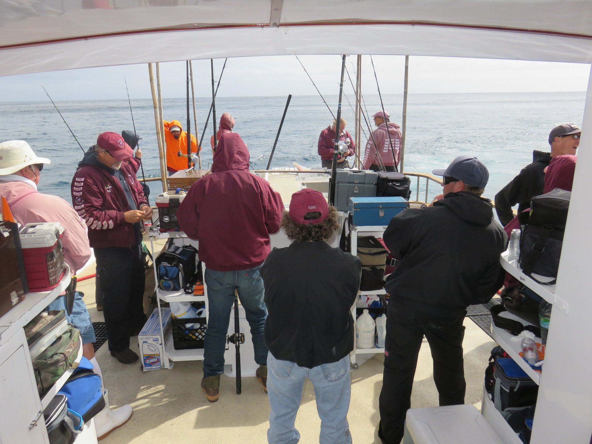 Trip #8: Boat: Thunderbird 1.5 day Departs: Thursday, October 2th Fishing: October 3th, 4th Returns: October 4th pm Thunderbird Crew: Capt. Jeff Capt. Chris Jose Nate Goofy Cast of Characters: Bill Parks Steve Morgan Riley Dyer Jim Bertella Justin Becker Jacob Richards Luke Burson Paul Morgan Mike Allen (Scribe) Patrick Thunyakij Bruce Granse Kevon Kong Michael Harris Ryan Burson Oscar Ochoa Ed Chutney Jeff Allen Andrew Ron Shrout Murphy Parks Romeo Ochoa James Harris Ozzie Baktiari Arriving for a trip in the month of October at Newport Landing is a far easier experience then one would have in the summer months of June – September. The dread of driving through the neighborhood in hopes of an empty space large enough to accommodate the larger trucks that many of the club members own seems to dissipate as the offerings are far more plentiful. While the welcomed views of summer also tend to be less abundant, the ensemble of club members arrived with plenty of time to catch-up on some conversations and enjoy a beverage or two.