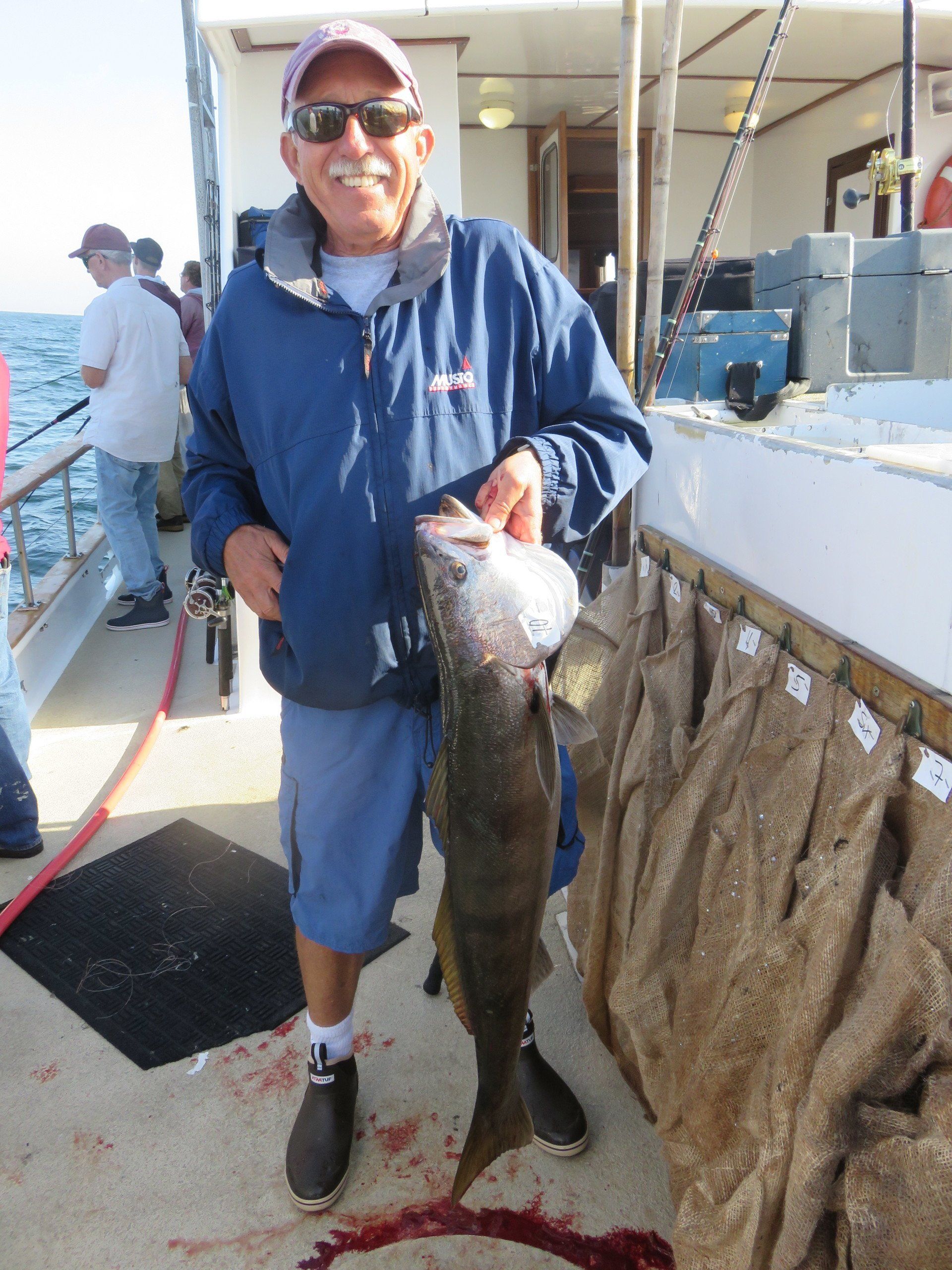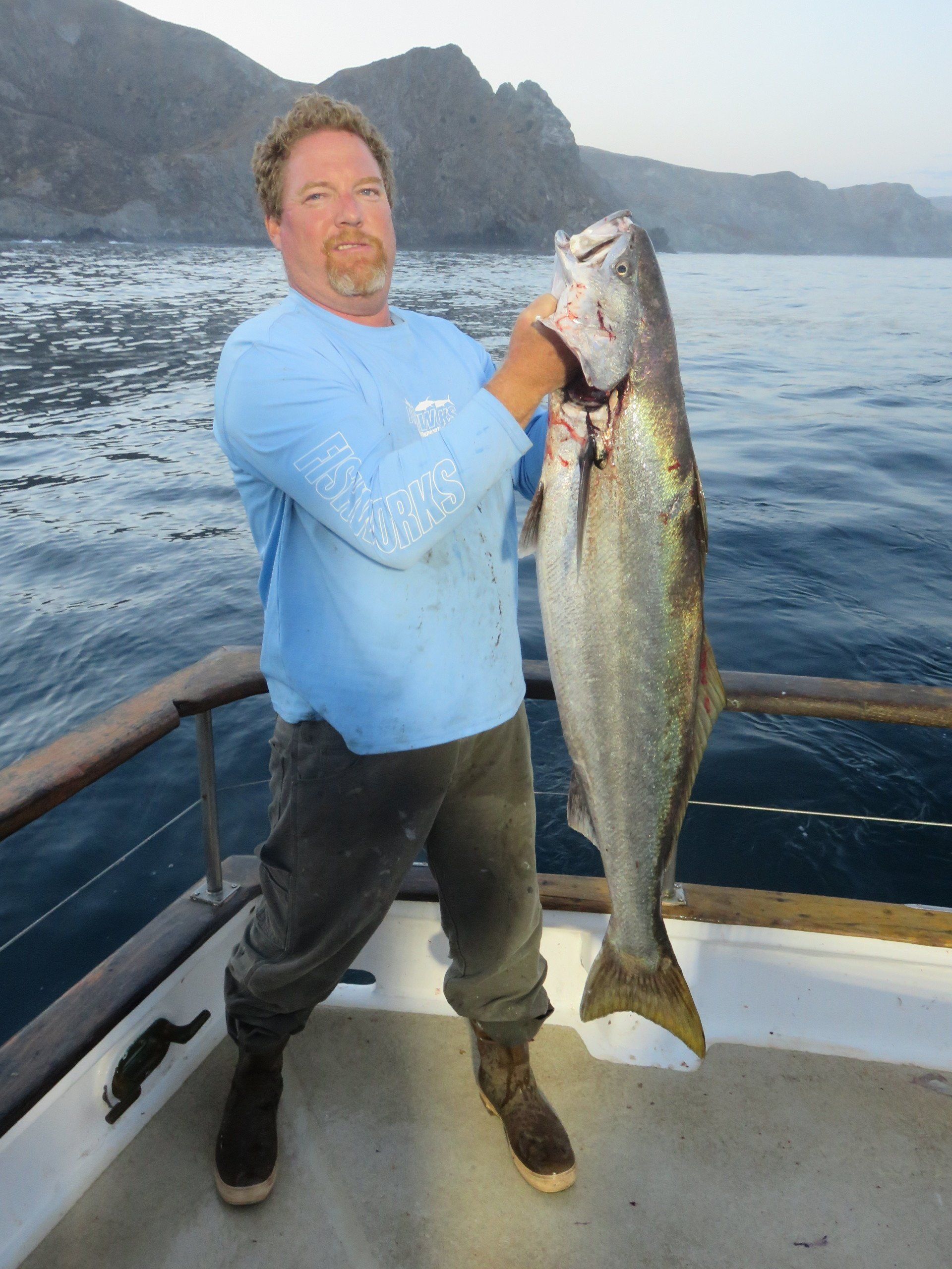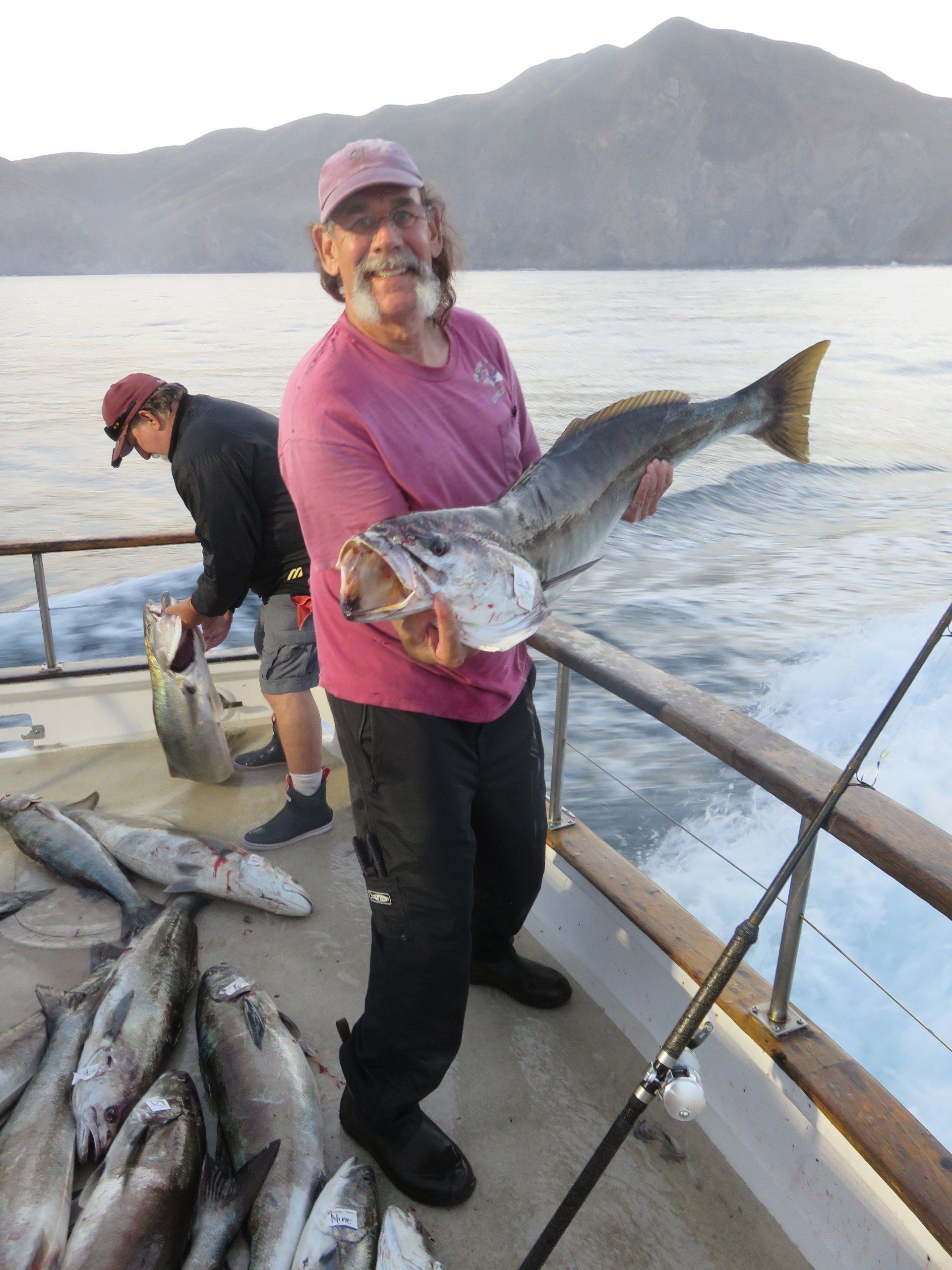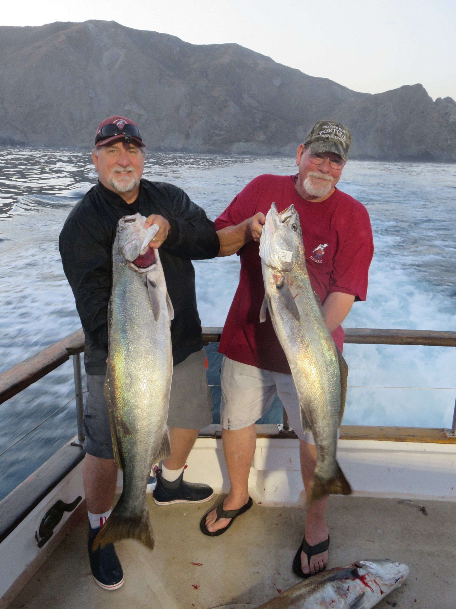 We arrived at St. Nicholas Island at around 5am. Roy was the first to get picked up by a white sea bass, then Stewart Finley and then Alex Mesko with a trophy 52# white sea bass. Steve Lenker and Luke Burson each caught a nice Halibut. For breakfast, we had eggs to order with bacon, potatoes and toast. After breakfast, we made a move to do some rock cod fishing. We brought on board some quality lingcod and nice reds, which we all enjoyed catching. About noon we settled for lunch, Chicken & andouille sausage with penne pasta & pink sauce, it was excellent! At the next stop, while fishing along the kelp bed, Mike Allen managed to get hooked up with a bruiser of a yellowtail. It was a good fight in which Mike was victorious. Later that evening Bruce decided to head back to Catalina to fish the bait grounds that evening and into the morning, so we did. For diner, we had Rahm schnitzel, red whipped potatoes, French green beans and tossed salad. For desert, we had mixed berry crisp w/ vanilla ice cream.
