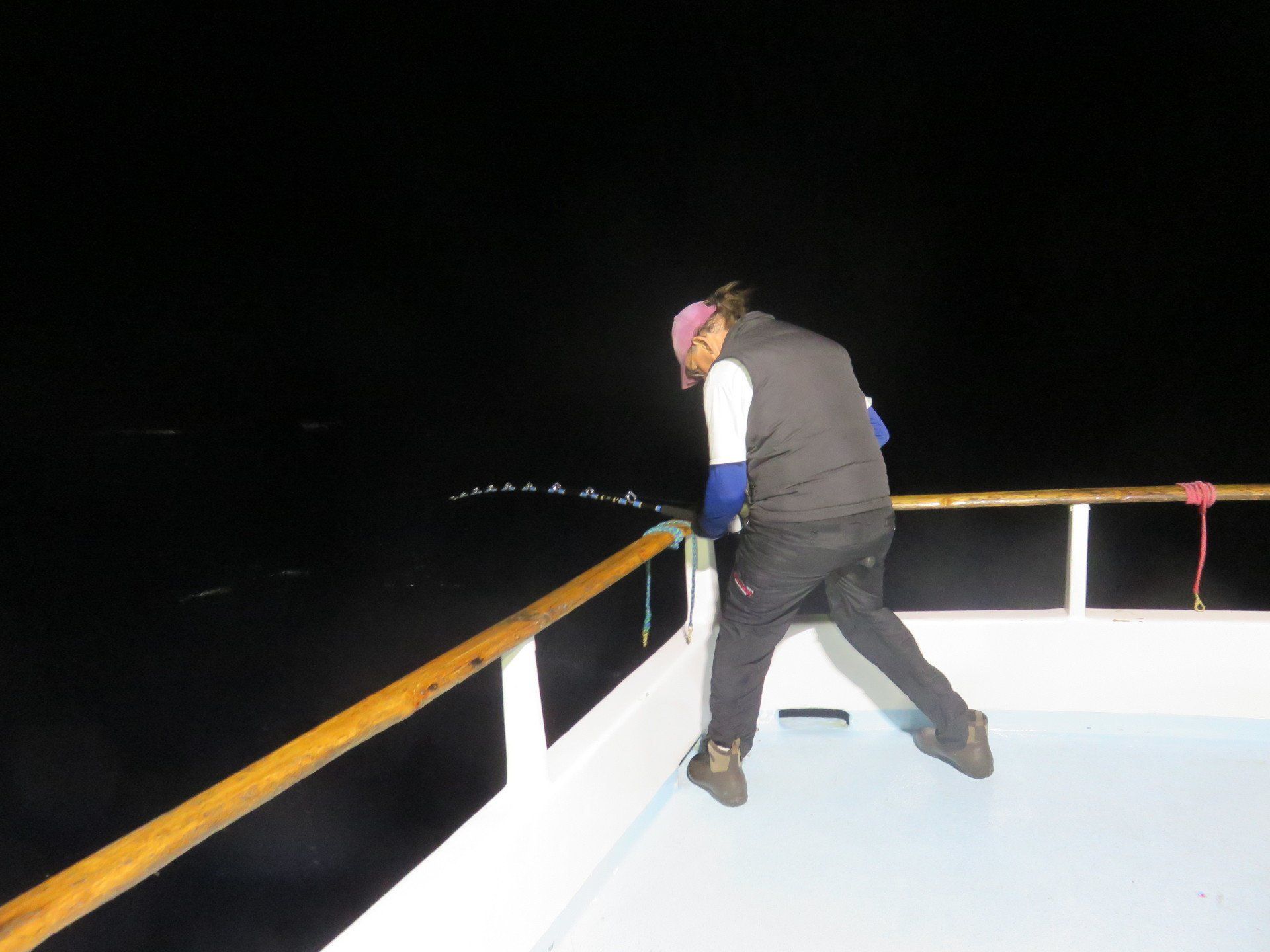 We depart around 8 p.m. – plug the tanks with very nice small/medium sized sardines and we’re off. It’s a bumpy ride most of the way – perhaps it’s ok we aren’t heading to the Cortez.