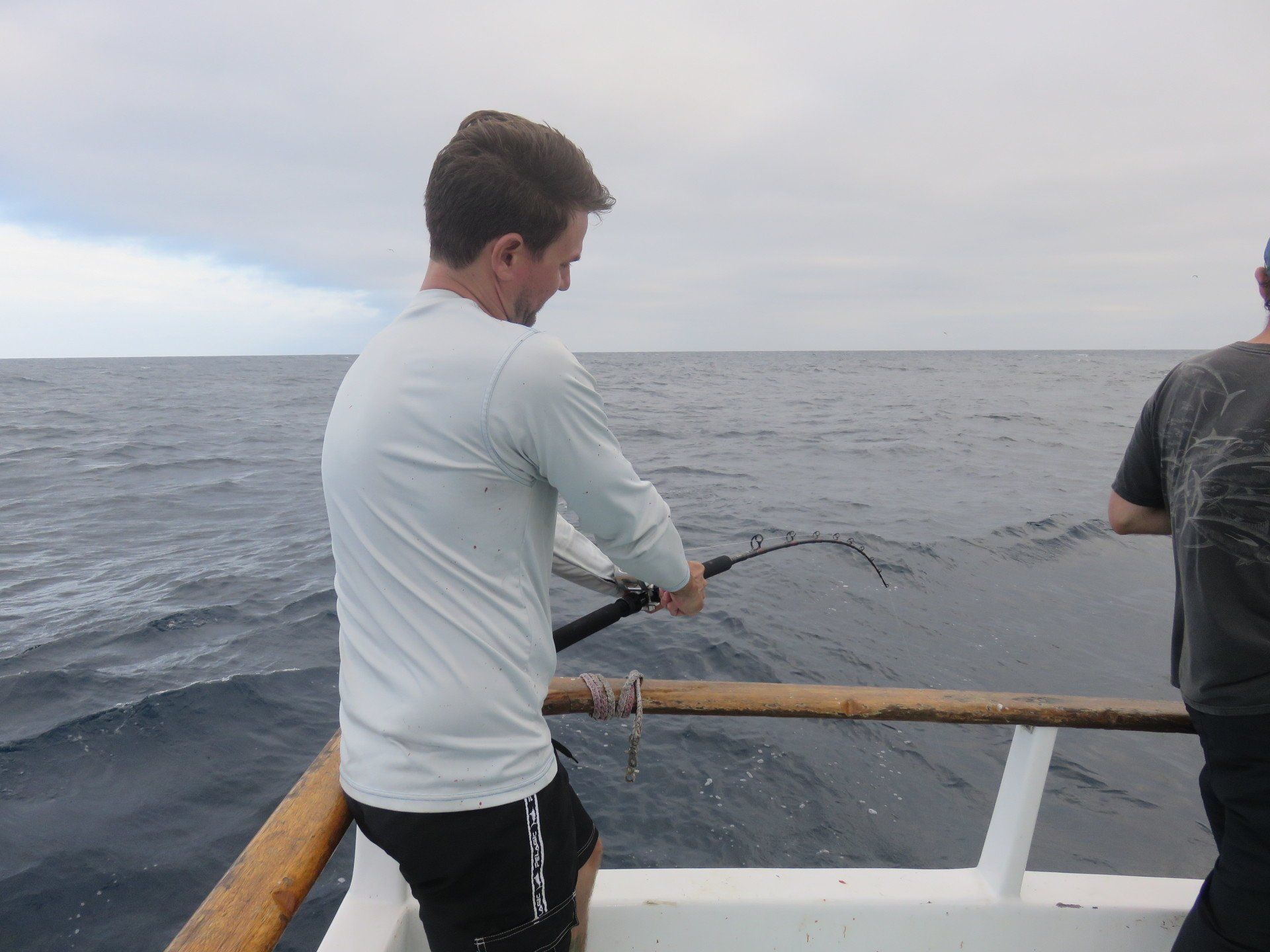 After barely sleeping, we were up early and ready to find some fish to pull on. We started fishing off the island, looking for Bluefin. We made a few stops on metered fish, but nothing bit. It was still very windy and the swells were big, making a few club members feel a little under the weather. As we continued searching for fish the wind eased off enough for us to fly the kite. We trolled a flying fish from the kite for a few hours, however it resulted in no bites. After messing around off the island for about 5-6 hours, we decided to move in closer to in, to an area where there had been some smaller grade tune.