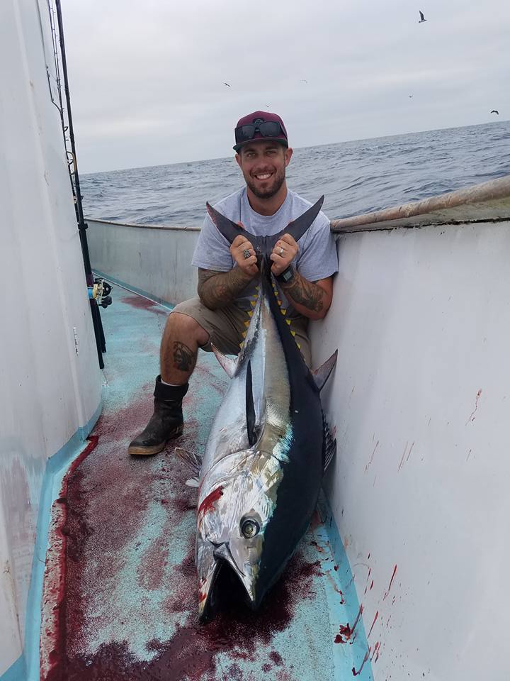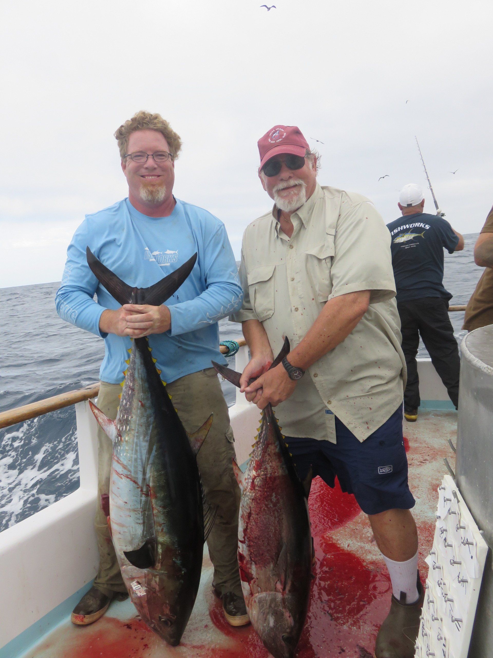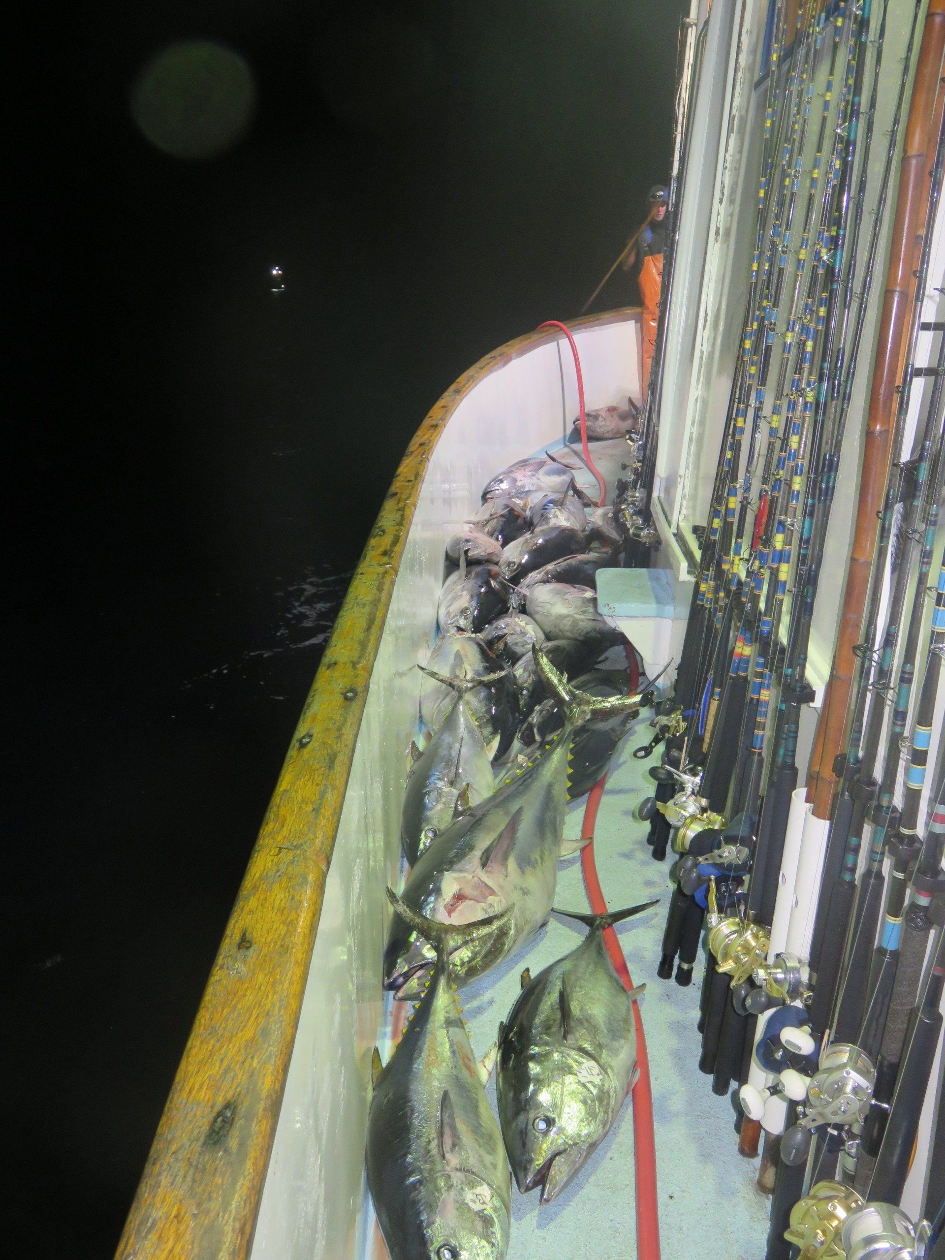 At the end of the day we had landed 28 Bluefin, ranging from 30lbs – 100lbs (using Jeff’s blue fin tax added to the YFT formula). Unfortunately, some of the larger fish were casualties of shark bites, having their tails bitten off. There were four anglers who were hot sticks, each catching 3 BFT. Ryan Burson, Mike Allen (who also had his personal best at 70 lbs) Gary Thompson and guest Andrew Viola. These four definitely showed the rest how tuna fishing is done!