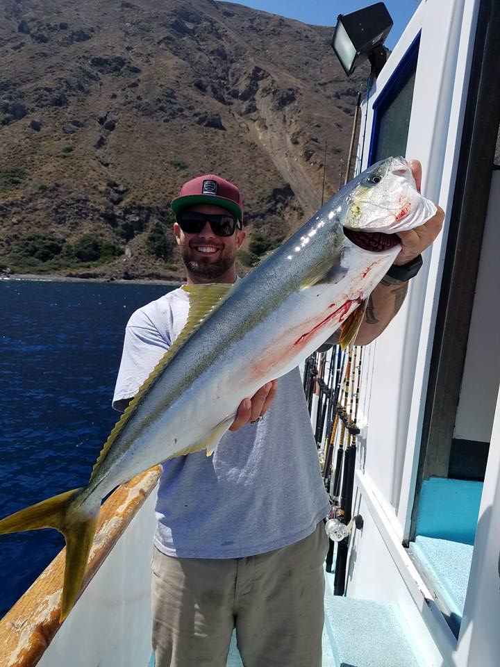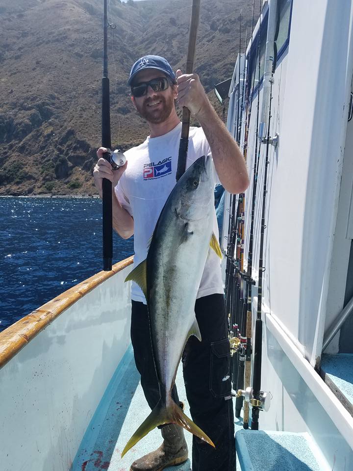 12:30 pm – We stopped on a spot for yellowtail, and we immediately hooked two. The first landed was by Chris Ramsey at about 15 lbs., while the second was landed by Nick Burson and was a solid 20 lbs. The bite picked up and we were constantly having fresh hook ups and fish going. At one point there were 5 fish going on the port stern! The grade was mixed, ranging from 5 lb-25lb. A healthy, strong bait was the key to getting bit. While some were picked up immediately, many others were hooked on a long soak.