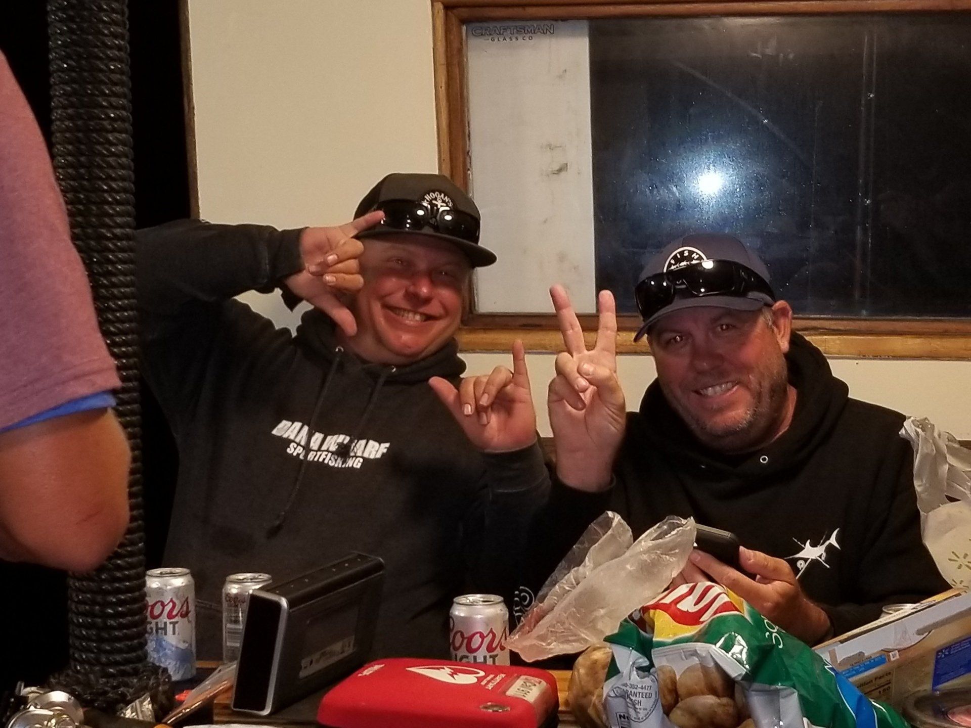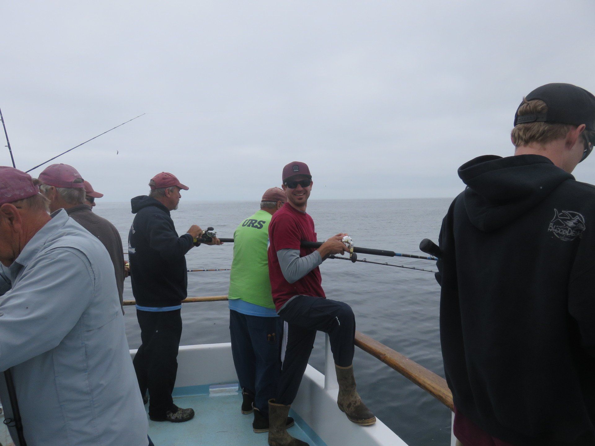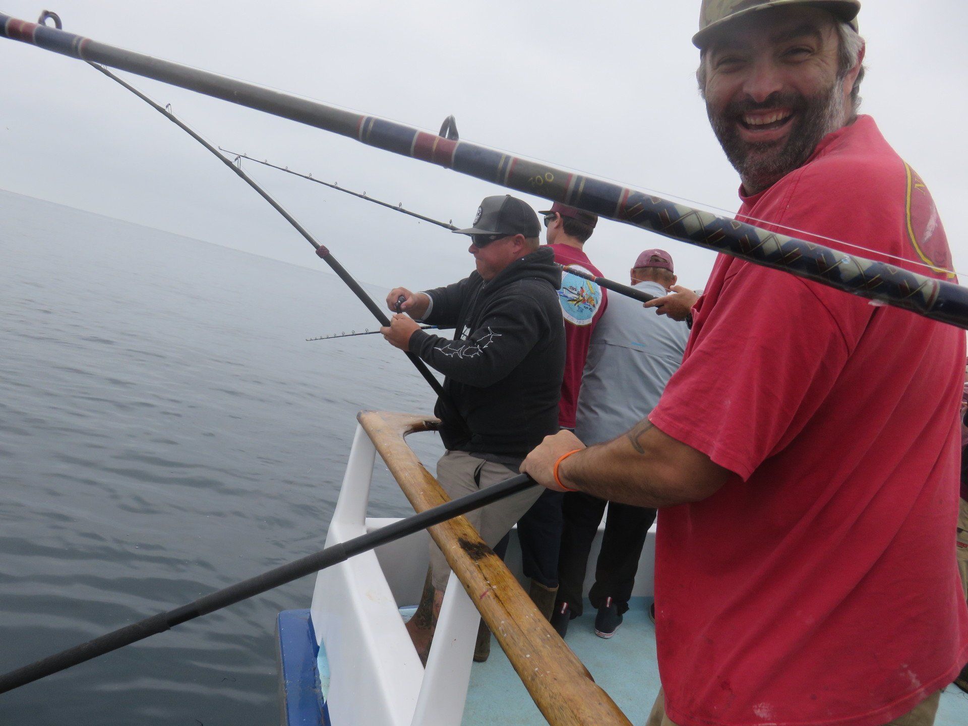 Trip #8: Boat: Thunderbird 1.5 day Departs: Thursday, October 2th Fishing: October 3th, 4th Returns: October 4th pm Thunderbird Crew: Capt. Jeff Capt. Chris Jose Nate Goofy Cast of Characters: Bill Parks Steve Morgan Riley Dyer Jim Bertella Justin Becker Jacob Richards Luke Burson Paul Morgan Mike Allen (Scribe) Patrick Thunyakij Bruce Granse Kevon Kong Michael Harris Ryan Burson Oscar Ochoa Ed Chutney Jeff Allen Andrew Ron Shrout Murphy Parks Romeo Ochoa James Harris Ozzie Baktiari Arriving for a trip in the month of October at Newport Landing is a far easier experience then one would have in the summer months of June – September. The dread of driving through the neighborhood in hopes of an empty space large enough to accommodate the larger trucks that many of the club members own seems to dissipate as the offerings are far more plentiful. While the welcomed views of summer also tend to be less abundant, the ensemble of club members arrived with plenty of time to catch-up on some conversations and enjoy a beverage or two.