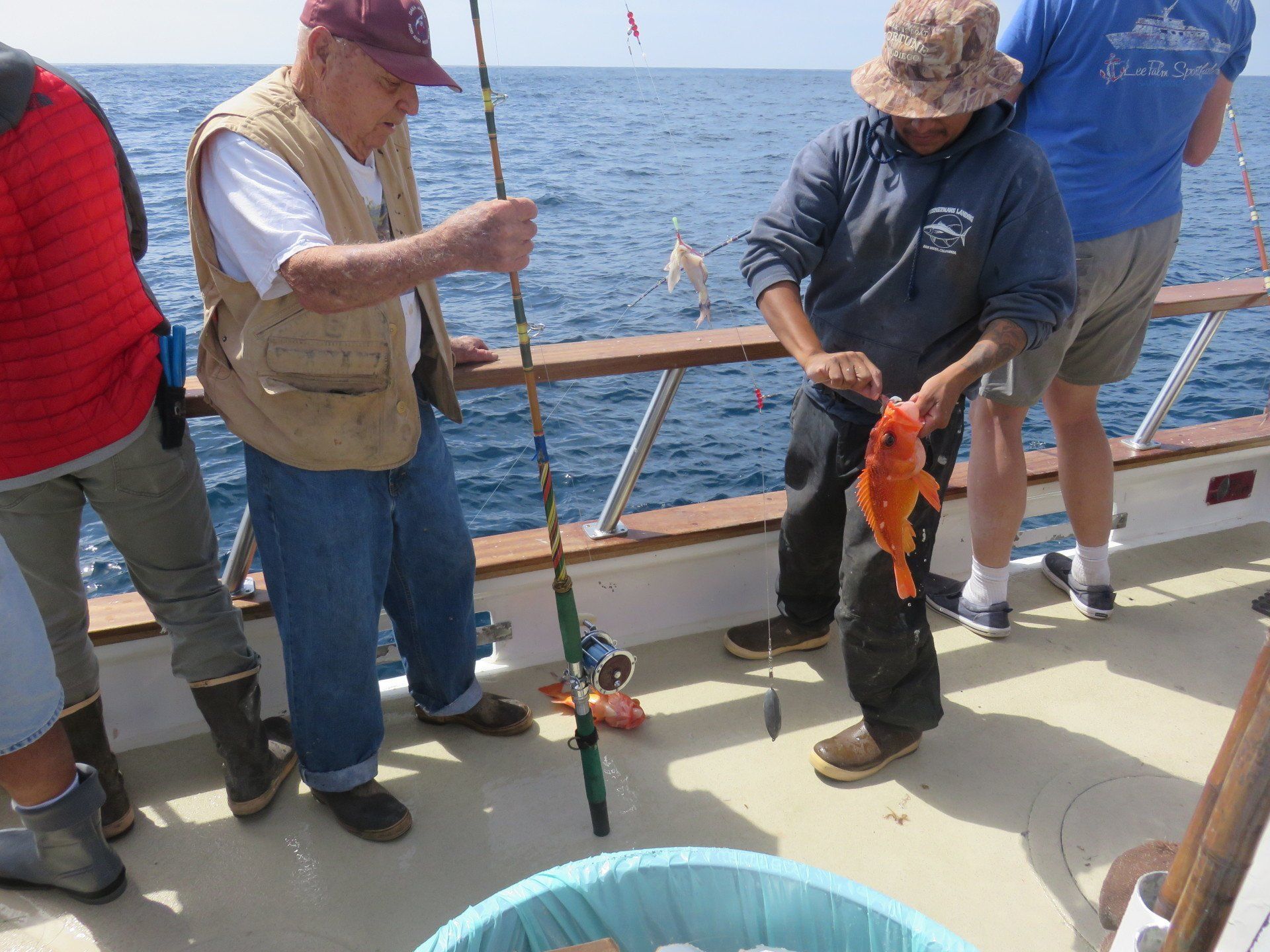 Trip #8: Boat: Thunderbird 1.5 day Departs: Thursday, October 2th Fishing: October 3th, 4th Returns: October 4th pm Thunderbird Crew: Capt. Jeff Capt. Chris Jose Nate Goofy Cast of Characters: Bill Parks Steve Morgan Riley Dyer Jim Bertella Justin Becker Jacob Richards Luke Burson Paul Morgan Mike Allen (Scribe) Patrick Thunyakij Bruce Granse Kevon Kong Michael Harris Ryan Burson Oscar Ochoa Ed Chutney Jeff Allen Andrew Ron Shrout Murphy Parks Romeo Ochoa James Harris Ozzie Baktiari Arriving for a trip in the month of October at Newport Landing is a far easier experience then one would have in the summer months of June – September. The dread of driving through the neighborhood in hopes of an empty space large enough to accommodate the larger trucks that many of the club members own seems to dissipate as the offerings are far more plentiful. While the welcomed views of summer also tend to be less abundant, the ensemble of club members arrived with plenty of time to catch-up on some conversations and enjoy a beverage or two.