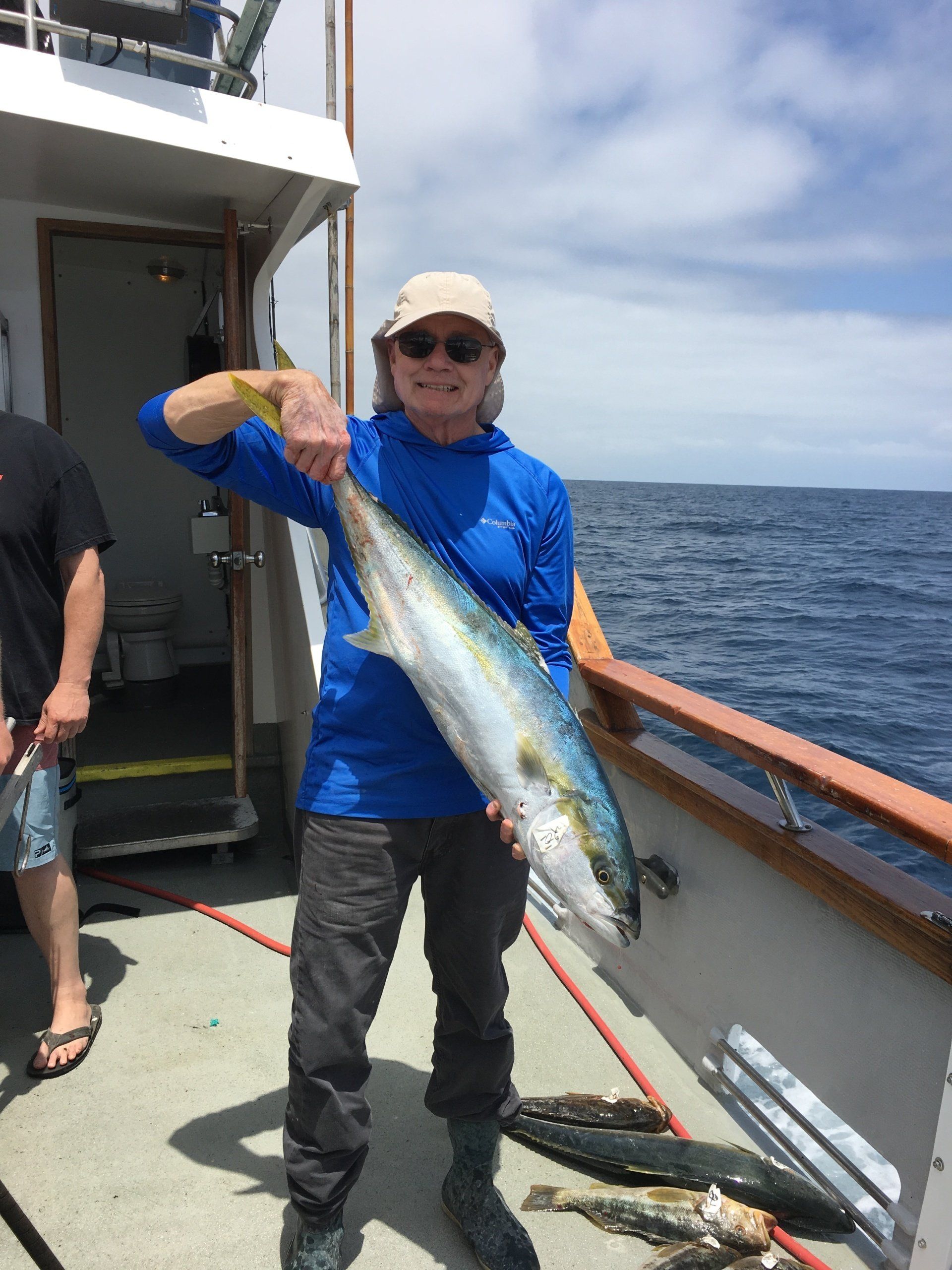 Trip #4: Boat: Thunderbird 2 day Departs: Thursday August 7th Fishing: August 8th, 9th Returns: August 9th pm Trip 4 started as usual with people arriving at Newport Landing at all hours of the day with anticipation of fishing. The preliminary reports from Gary Thompson were all too familiar to what we’ve seen this year. Bait was going to be an issue. And last but not least, was the fish seemed to pop up one day and then disappear the next. Nevertheless, everyone was ready to go. Friday morning saw us anchored at the usual cove off SCI. Weather was OK; fishable, but not a lot of fish. But the ones we caught were quality yellowtail and white sea bass. The sea lions provided ample entertainment …err I mean frustration. We hopped around to a few spots picking up the occasional calico but not much. Day 1 jackpot went to Alex Arthur (Justin Becker’s Guest) with the patch going to Nick Burson for some chunky YT’s Day 2 started much as it did Day 1 but the weather was worse than Day 1. We looked here and there with only 3 yellowtail to show for our efforts. Eventually, the Thunderbird turned towards offshore waters to try our luck at some bluefin. Unfortunately, the fish didn’t get the memo and we saw neither sign or had any bites. Mr, “Hey that’s my fish” Tom Hill was the lucky jackpot and patch winner for Day 2 with a 15# YT. So, there you have it, not a, “Hey you missed a great trip” kind ‘a trip but per usual, the members of our club all seemed to enjoy doing what we do. It’s not always about the fish; it’s about the people and the experience. LOL! Who am I kidding…we all want more fish. Until next time, step to the right/left and take up your slack.