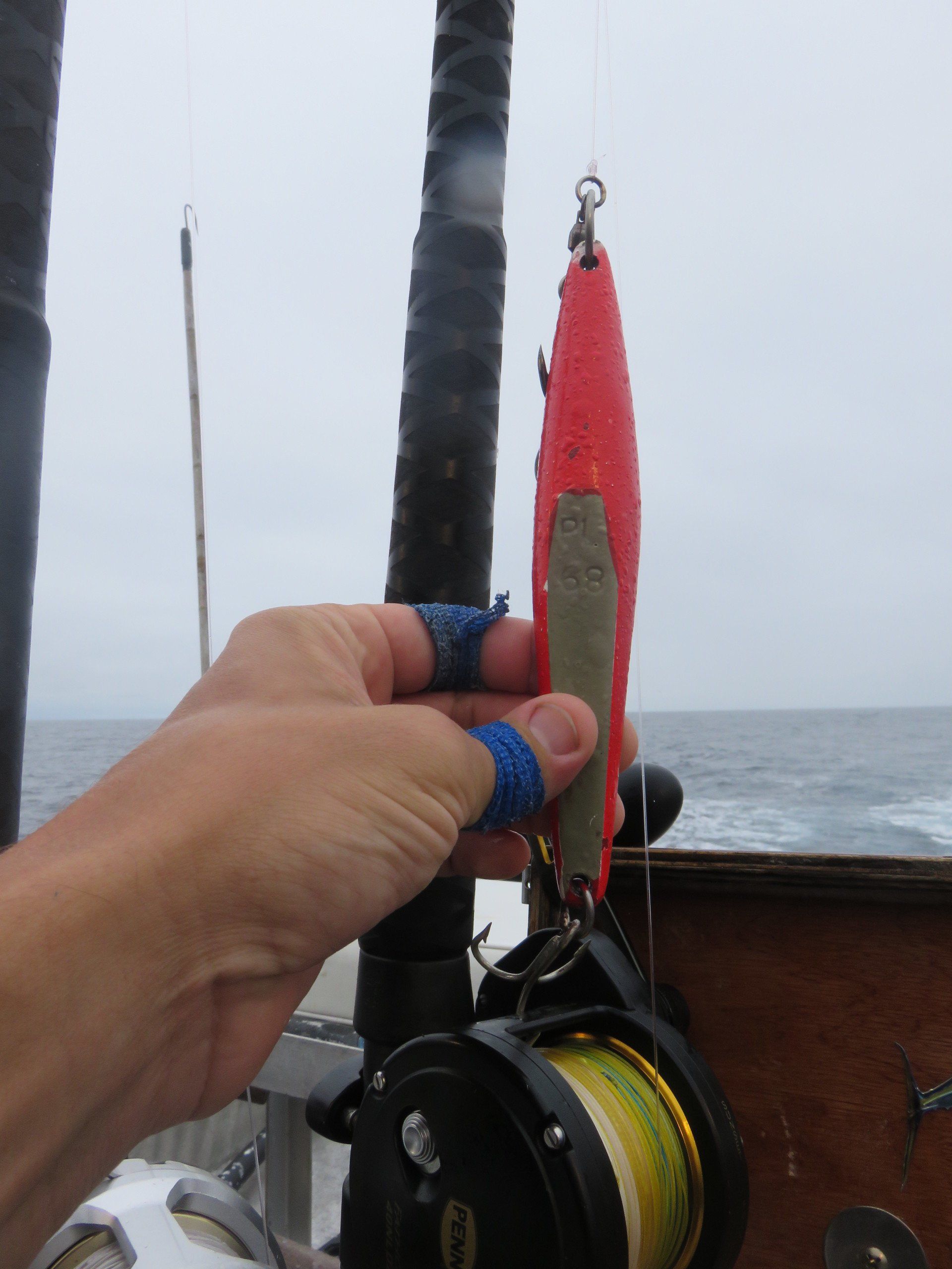 Arrived at the 9 fathoms spot a few miles west of Bishop Rock at 8:45am. Good sign and show of yellows and large bonito. We went 7-12 on the yellows. I went 0-2 on yo-yo jigs. Both bit on the sink, and both pulled the hook after being on for a while. WTF was that all about? We also landed several large bonito in the 10-14 lbs. range. I got one of those too and they definitely tug hard when they are that big, especially on 20lb. Parks landed a bruiser yellow that weighed 41.75 lbs. on the spring scale, but only taped at just under 35 lbs. It was a skinny fish and the girth measurement was not as proportional as it should have been for its length. Thus, the low taped weight due to the formula.