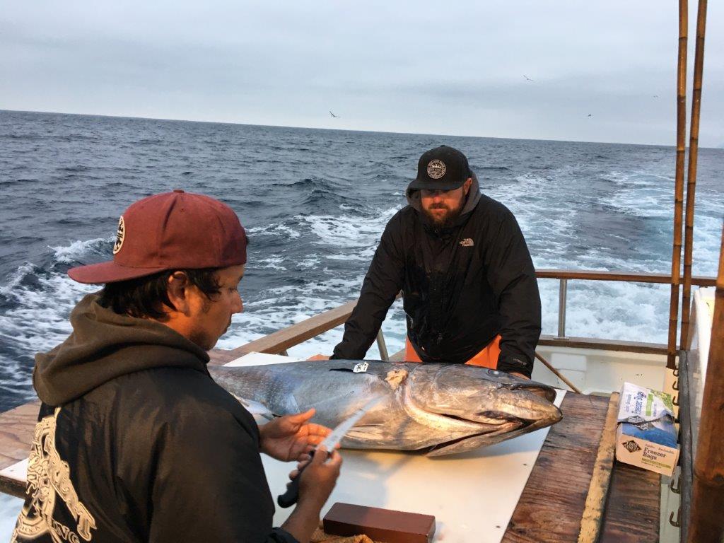 Trip #8: Boat: Thunderbird 1.5 day Departs: Thursday, October 2th Fishing: October 3th, 4th Returns: October 4th pm Thunderbird Crew: Capt. Jeff Capt. Chris Jose Nate Goofy Cast of Characters: Bill Parks Steve Morgan Riley Dyer Jim Bertella Justin Becker Jacob Richards Luke Burson Paul Morgan Mike Allen (Scribe) Patrick Thunyakij Bruce Granse Kevon Kong Michael Harris Ryan Burson Oscar Ochoa Ed Chutney Jeff Allen Andrew Ron Shrout Murphy Parks Romeo Ochoa James Harris Ozzie Baktiari Arriving for a trip in the month of October at Newport Landing is a far easier experience then one would have in the summer months of June – September. The dread of driving through the neighborhood in hopes of an empty space large enough to accommodate the larger trucks that many of the club members own seems to dissipate as the offerings are far more plentiful. While the welcomed views of summer also tend to be less abundant, the ensemble of club members arrived with plenty of time to catch-up on some conversations and enjoy a beverage or two.